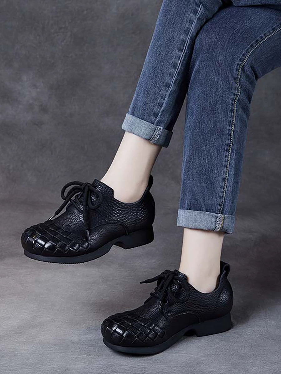 Women Vintage Soft Leather Weave Low Heel Shoes