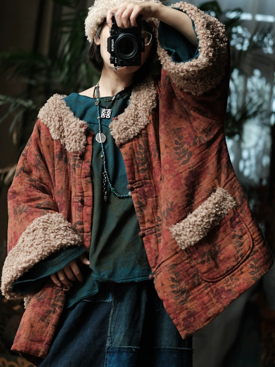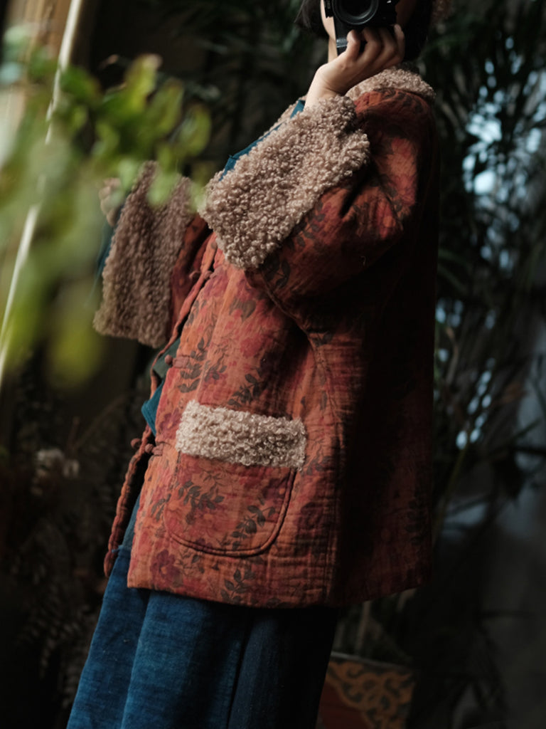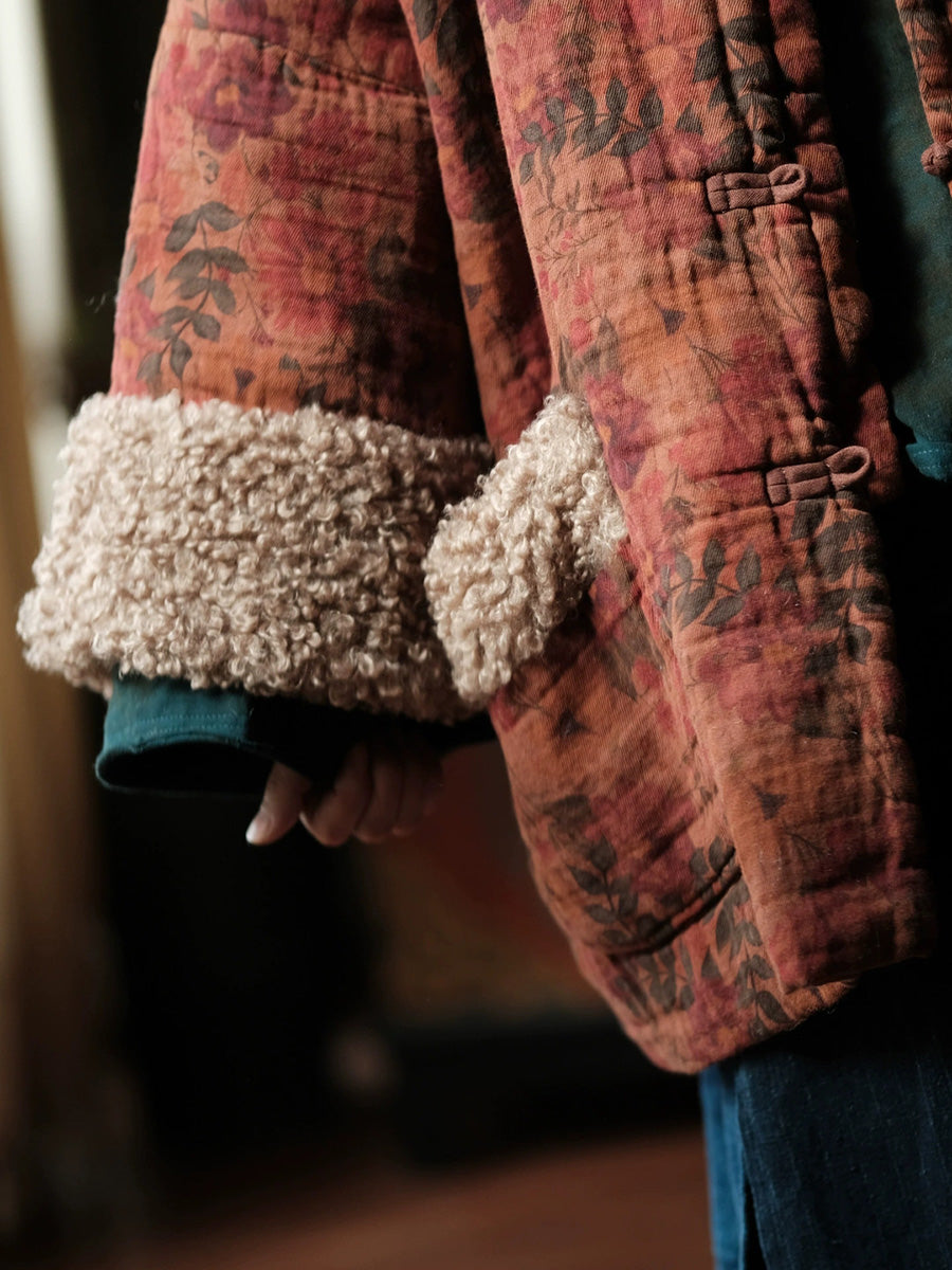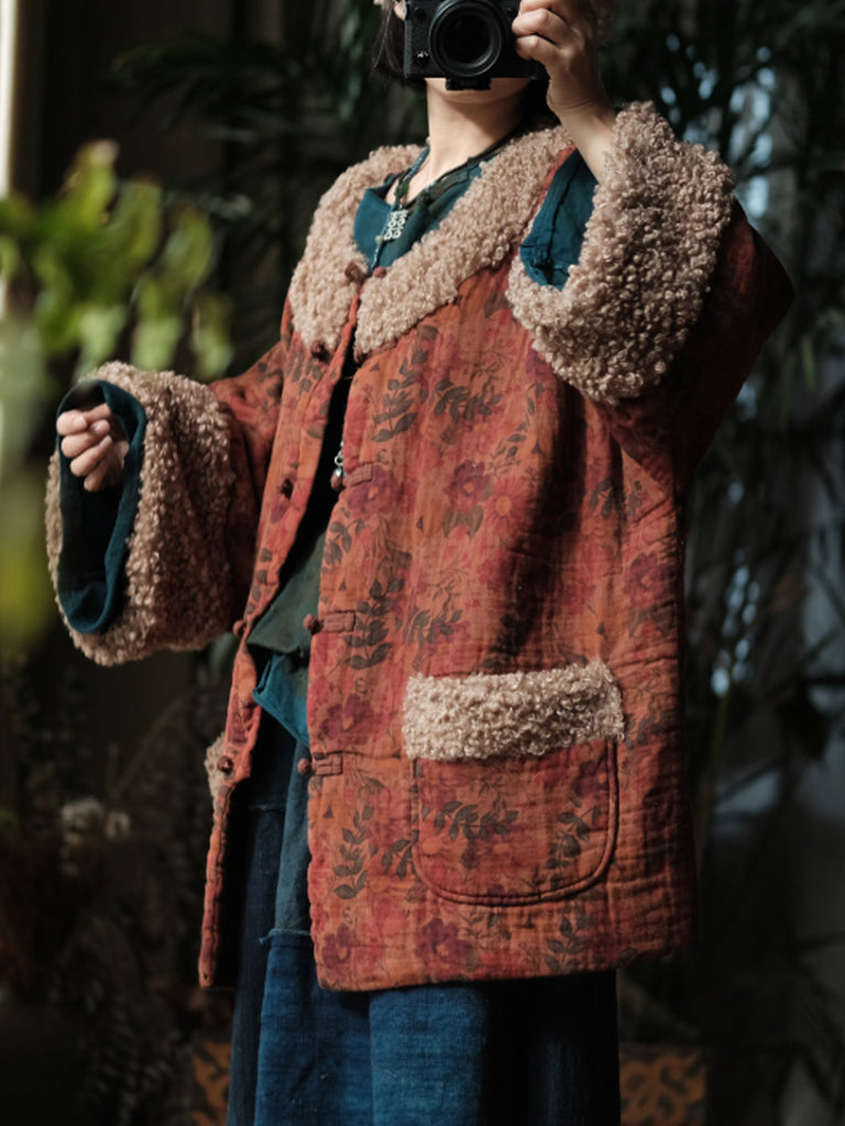 Women Vintage Winter Flower Fleece Spliced Cotton O-Neck Coat