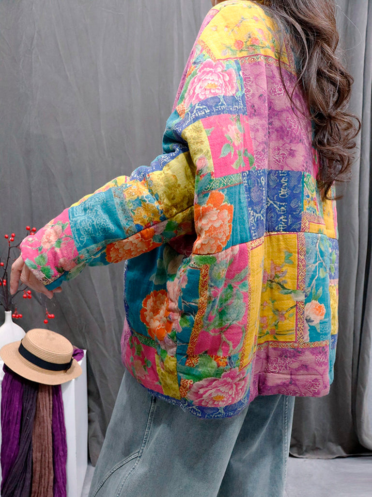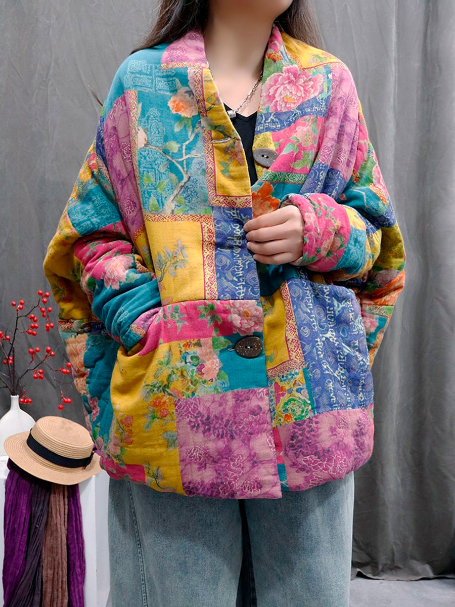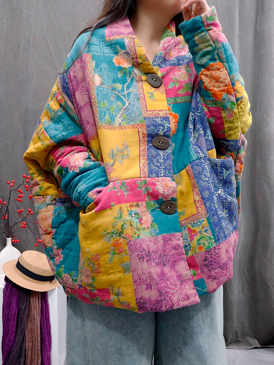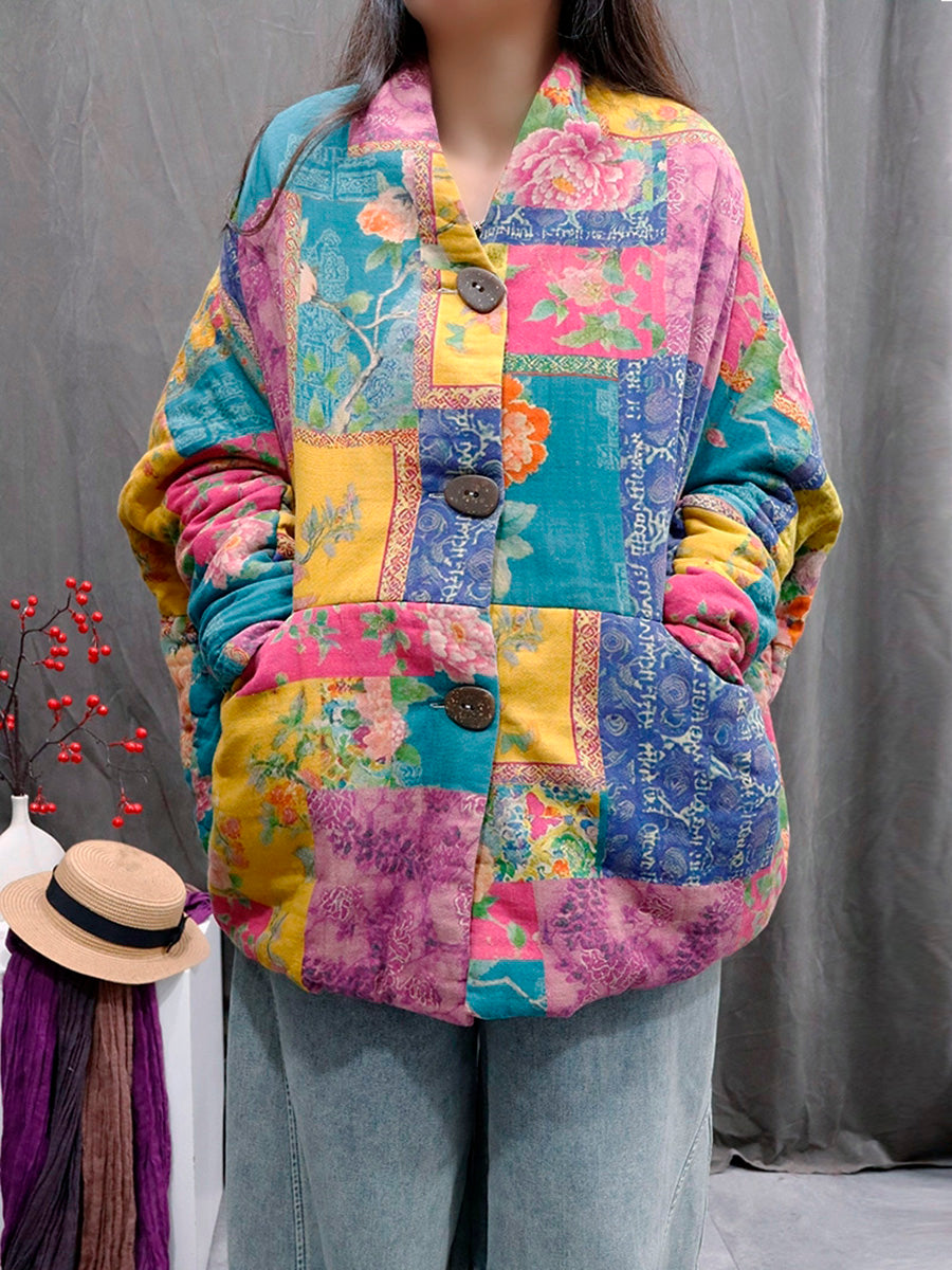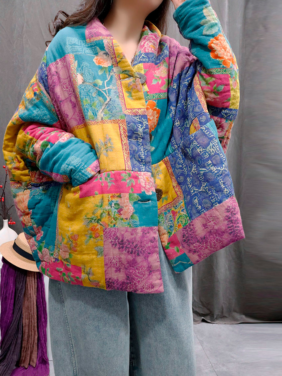 Women Vintage Winter Flower Patchwork V-Neck Cotton Coat