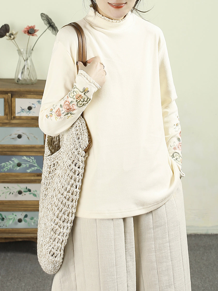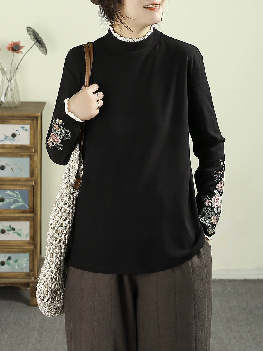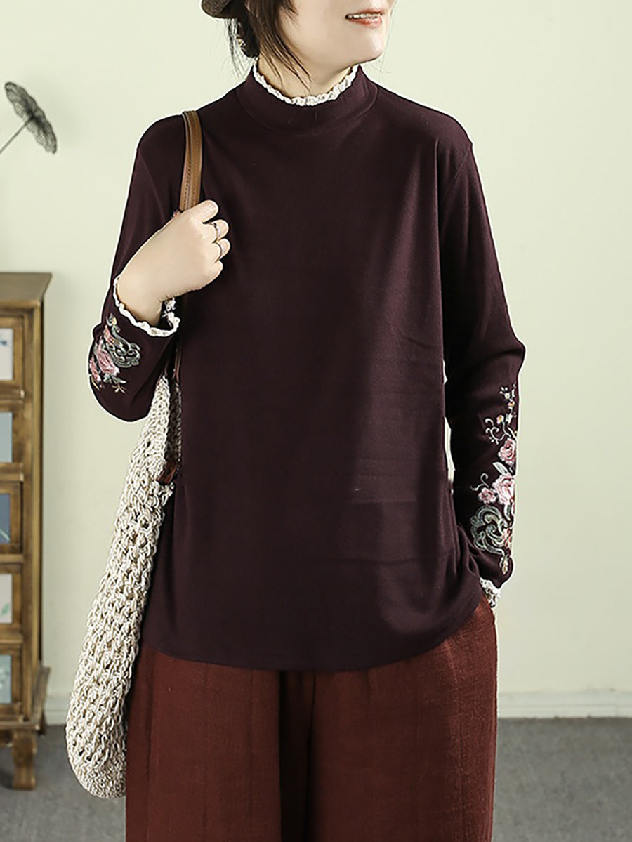 Women Winter Artsy Embroidery Half-Turtleneck Blouse