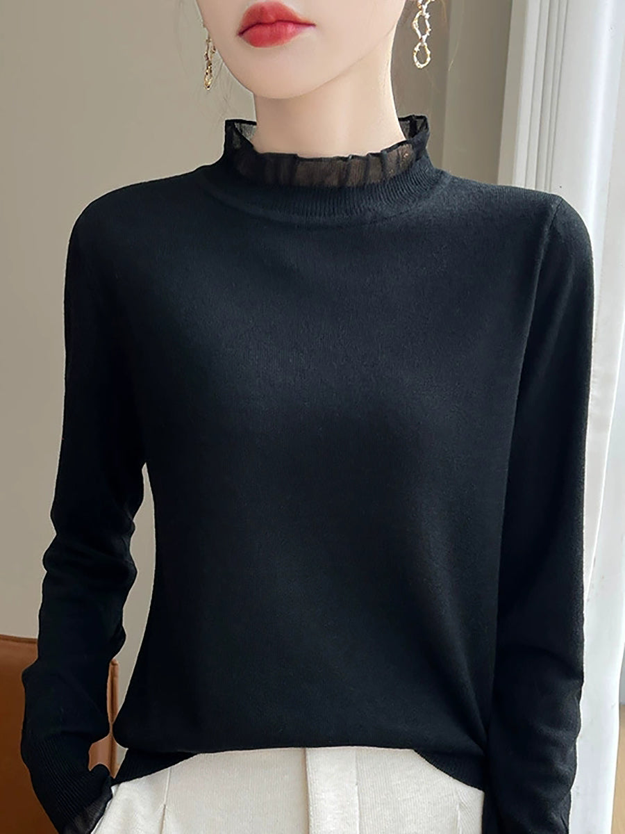Women Winter Artsy Pure Color Lace Collar Blouse