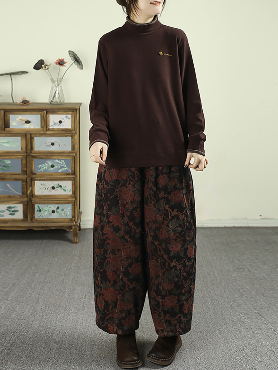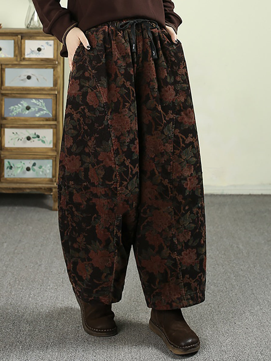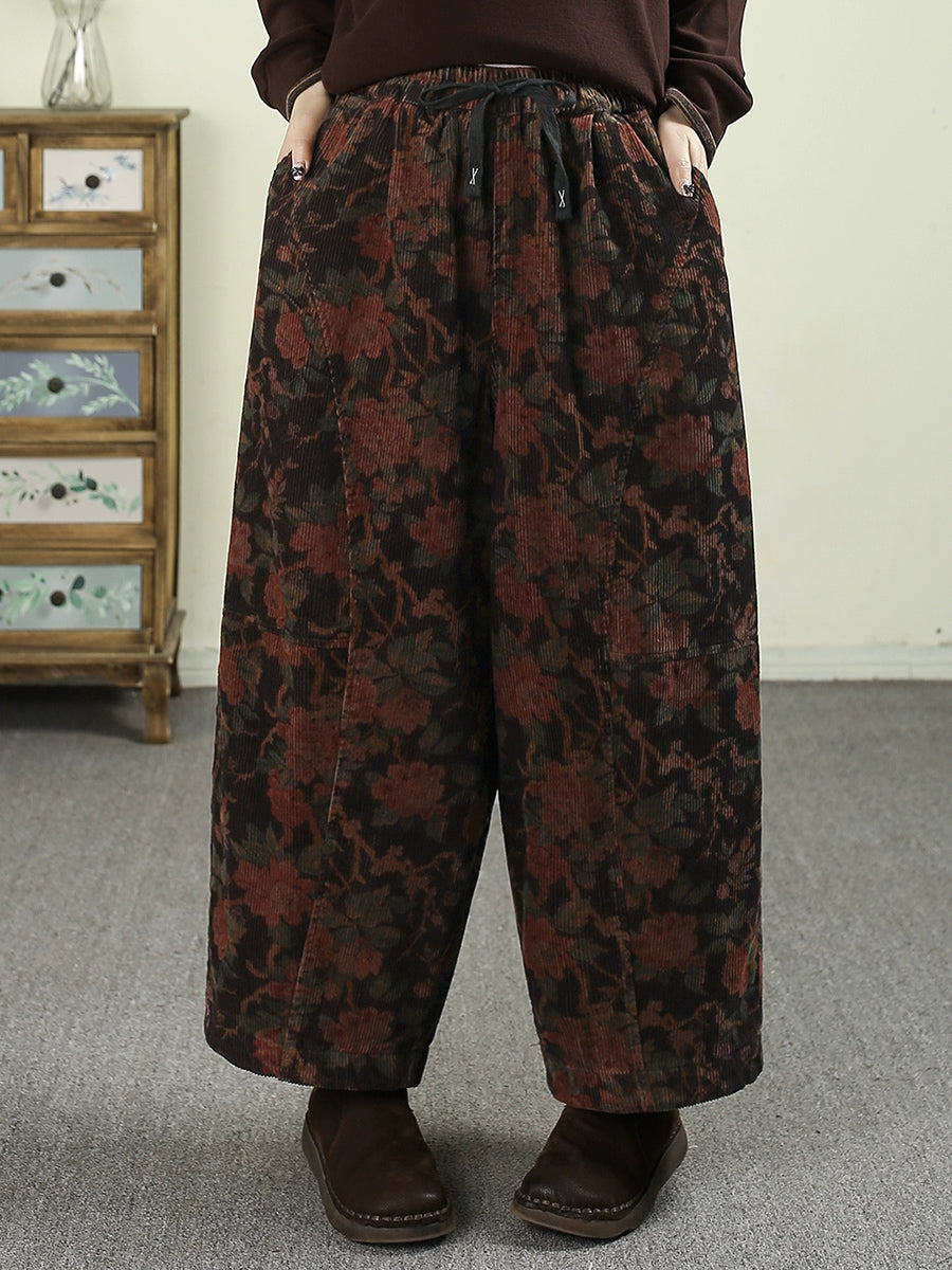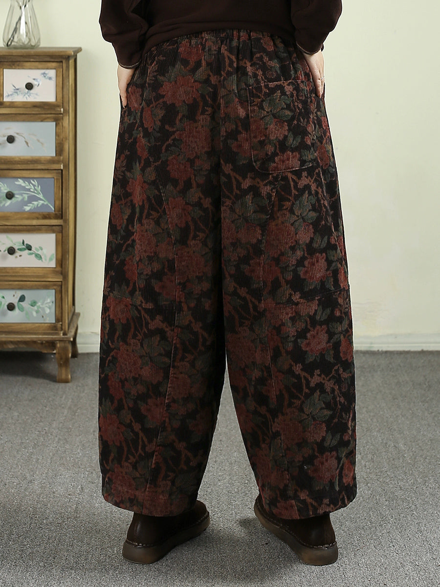Women Winter Flower Corduroy Padded Wide-leg Pants