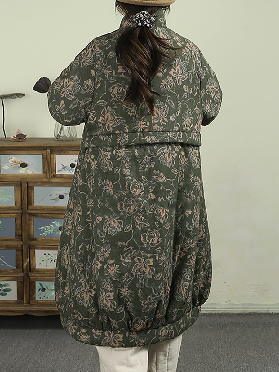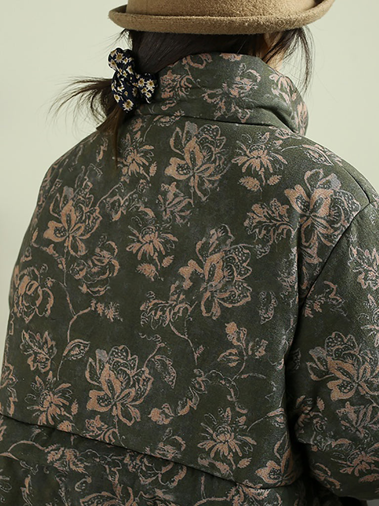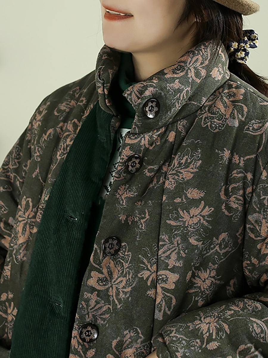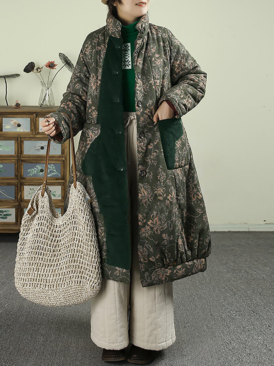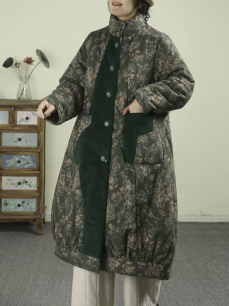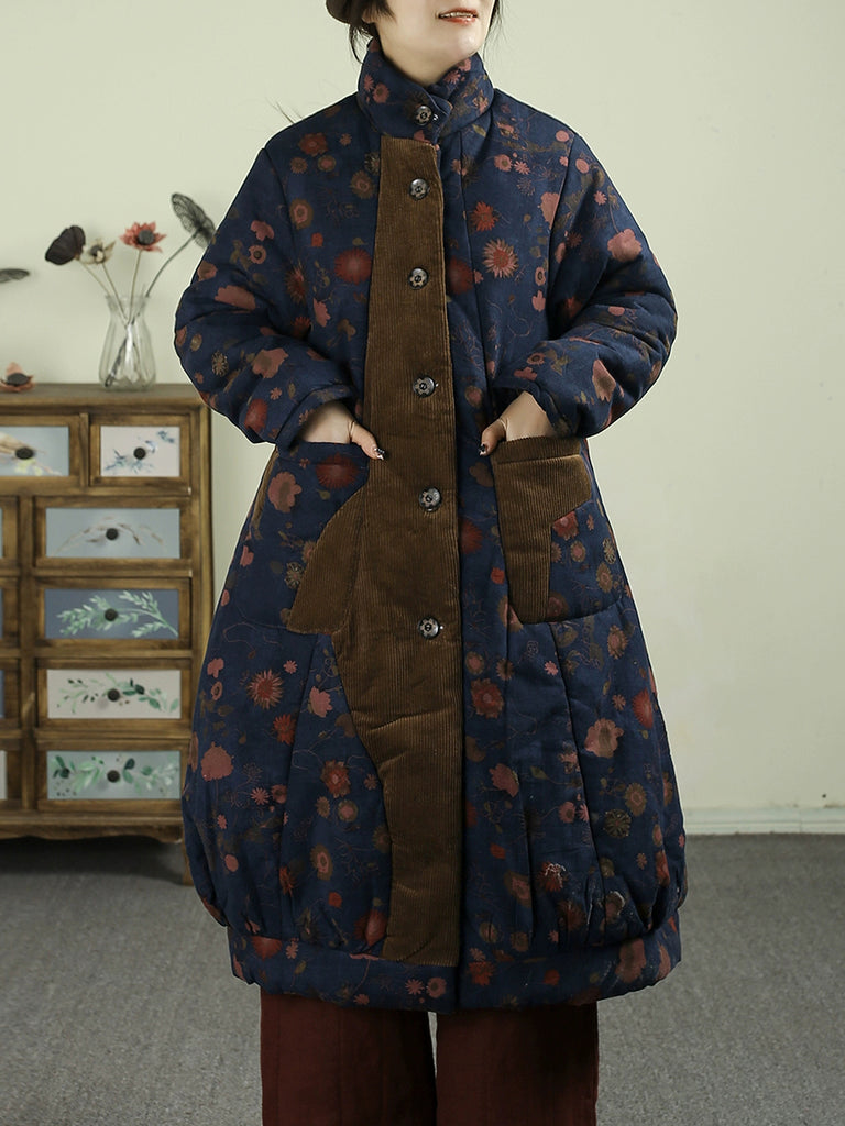 Women Winter Flower Corduroy Spliced Stand Collar Padded Coat