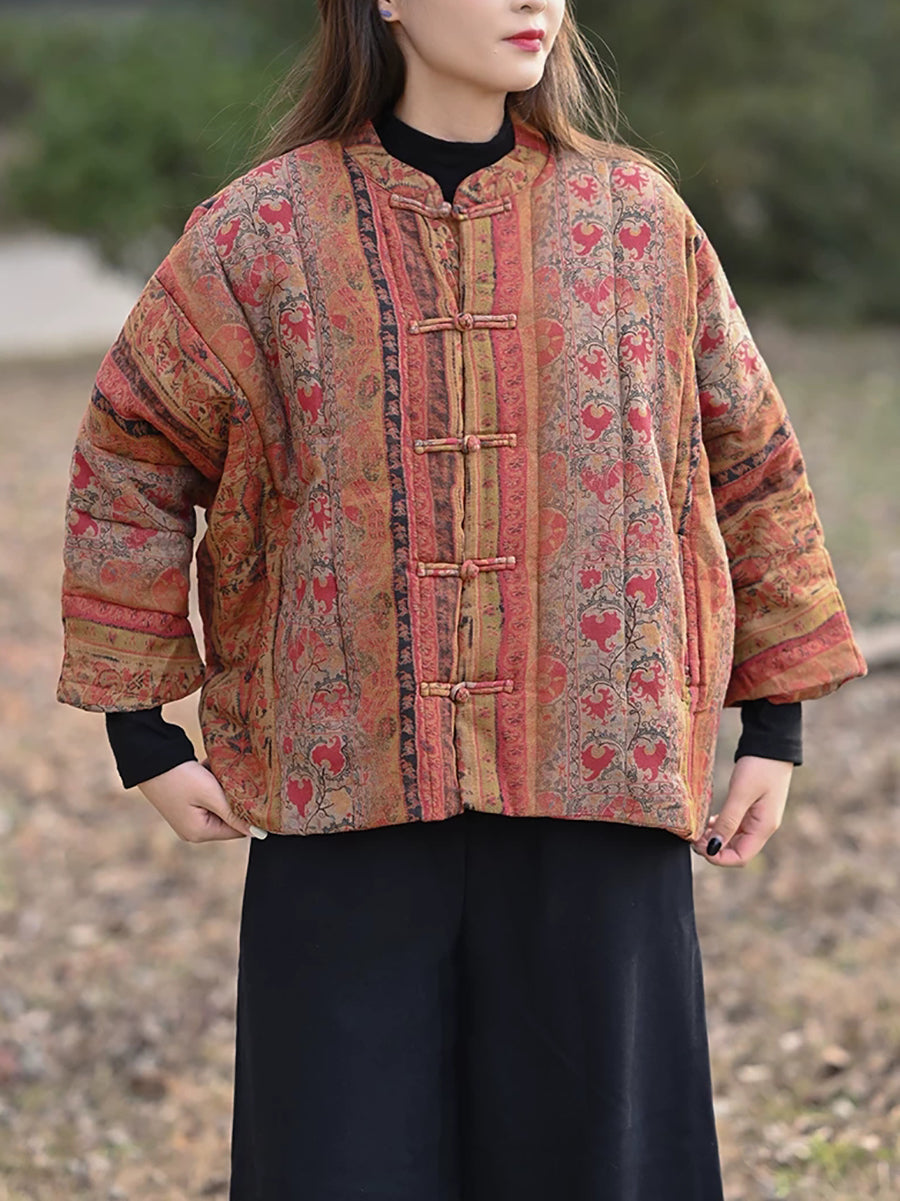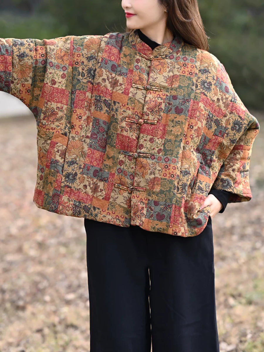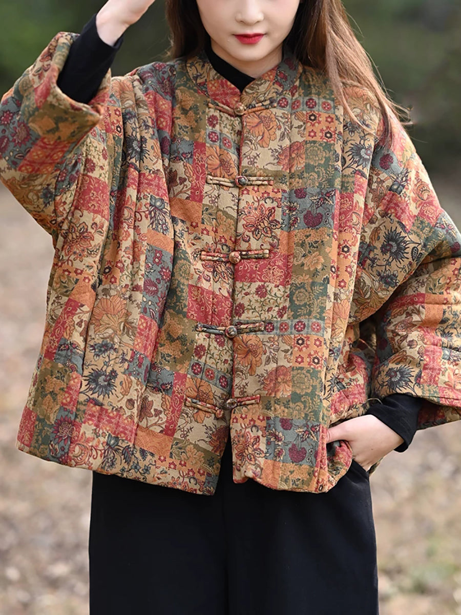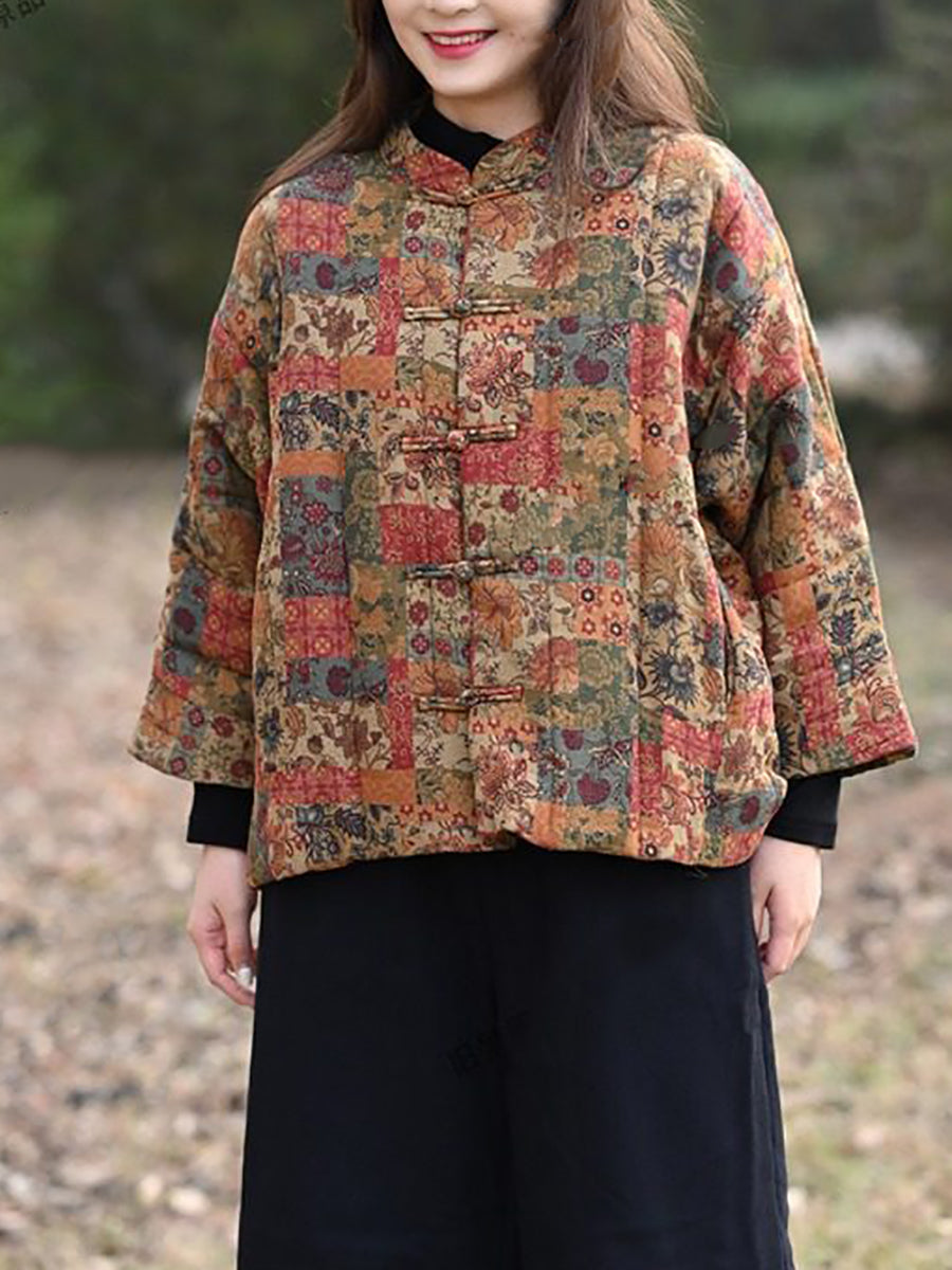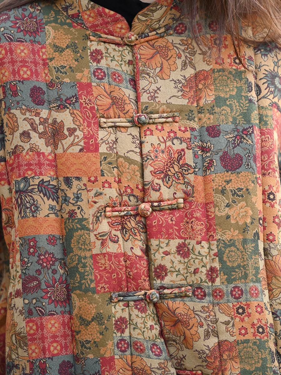 Women Winter Flower Patchwork Stand Collar Padded Coat