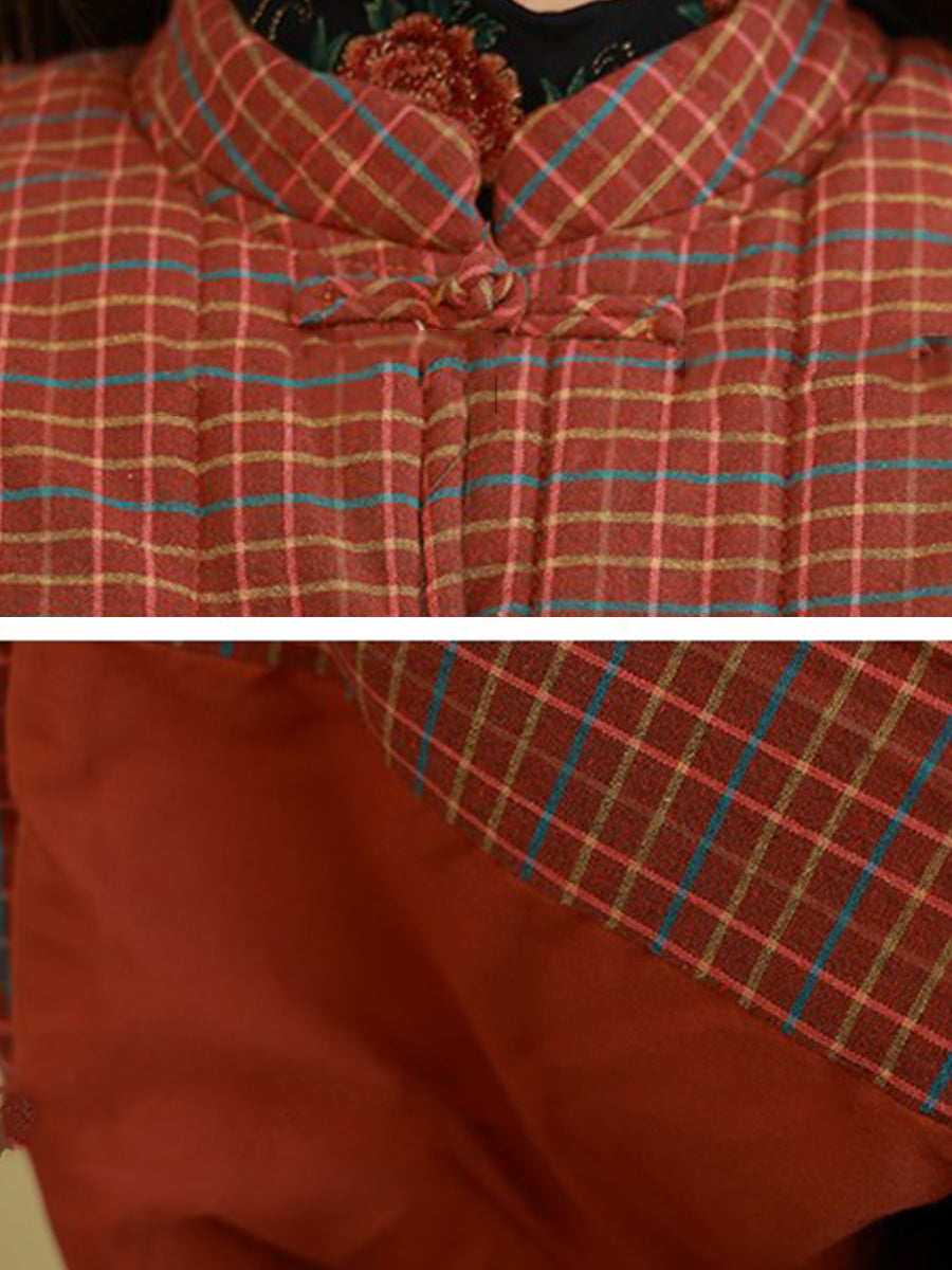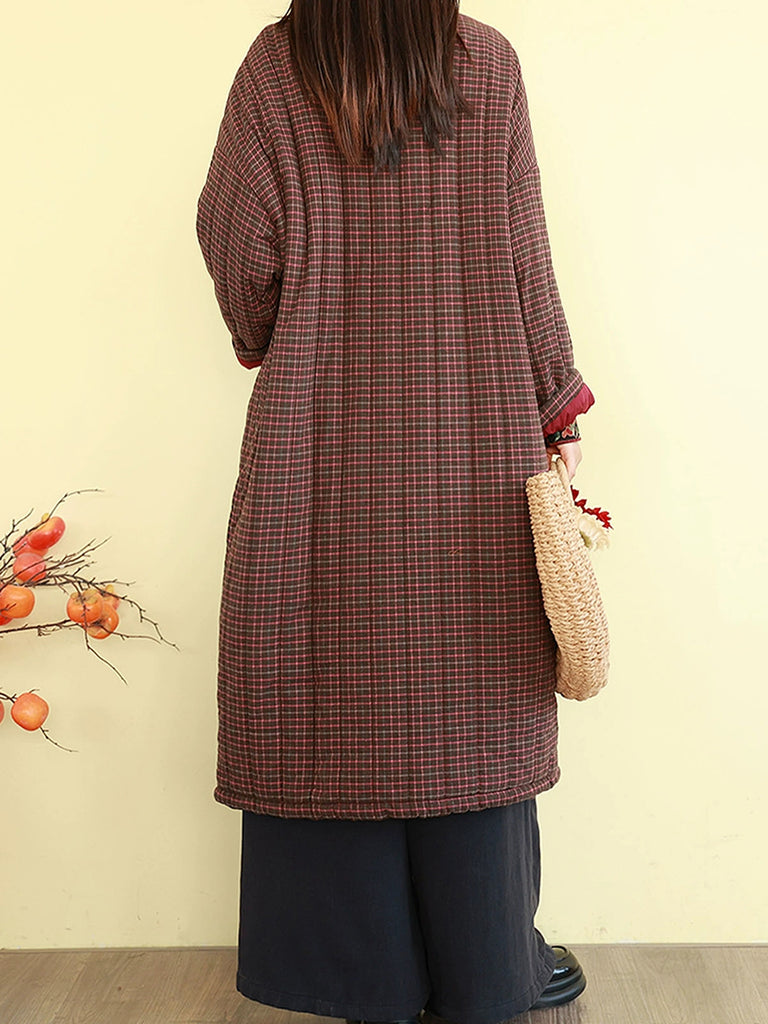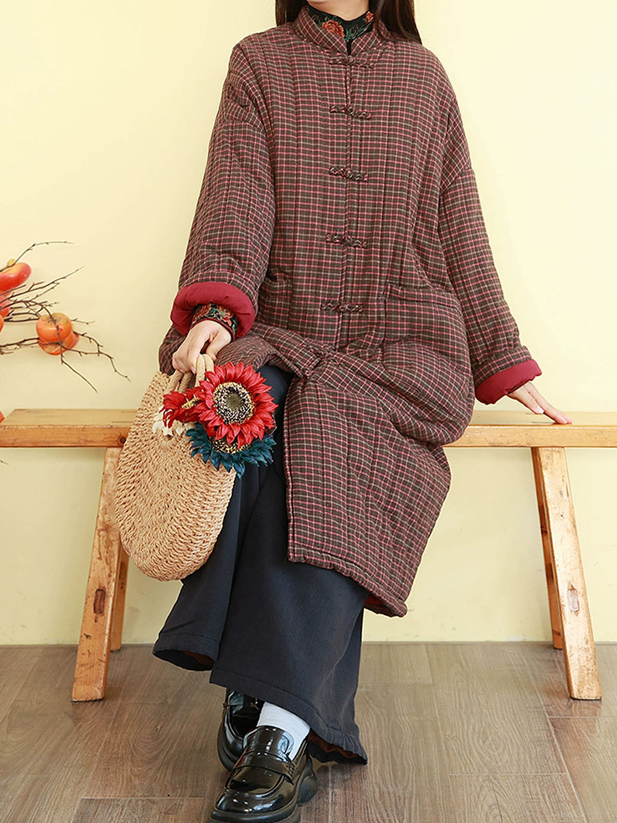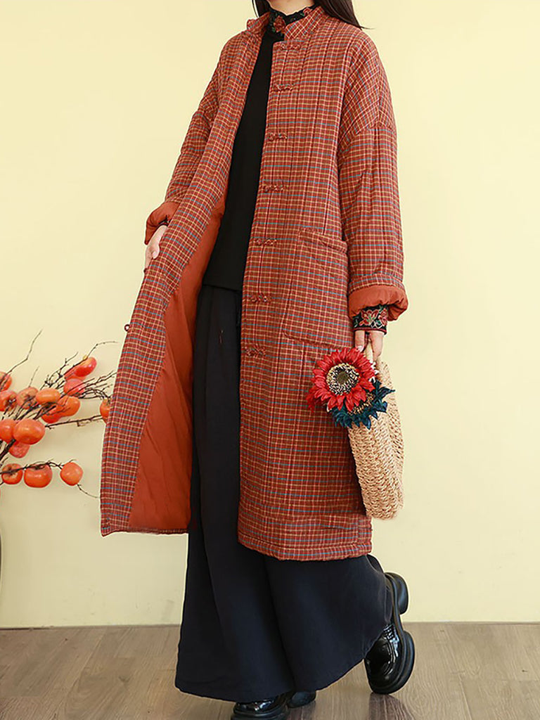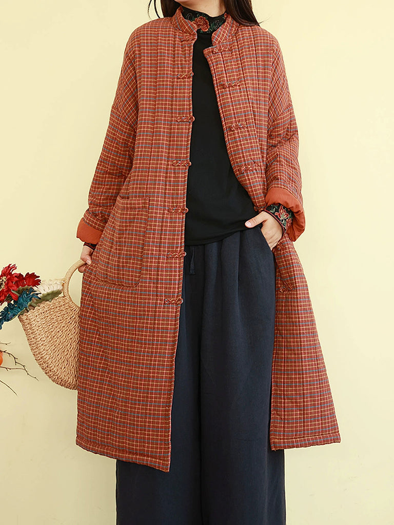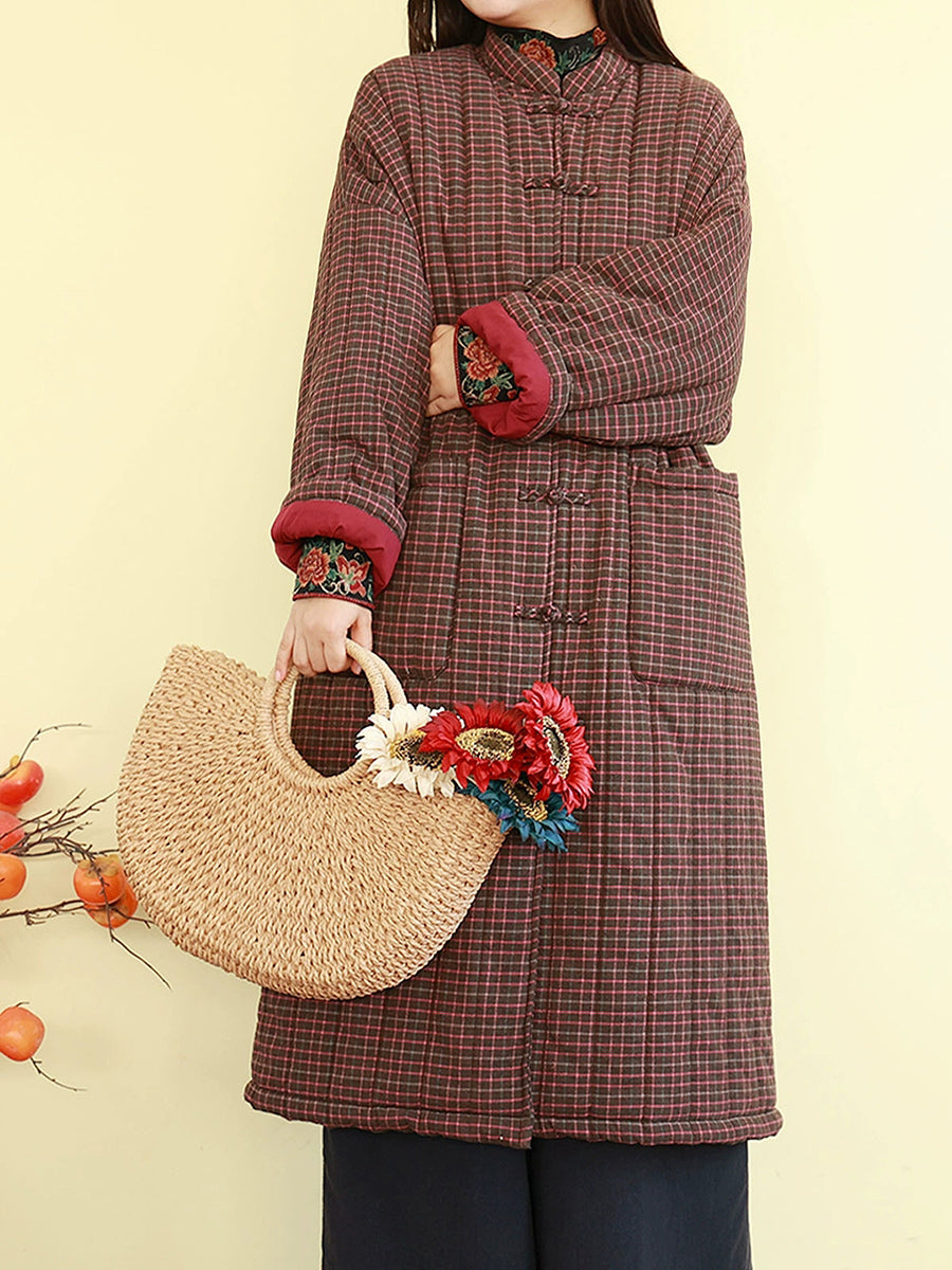 Women Winter Retro Lattice Stand Collar Padded Coat