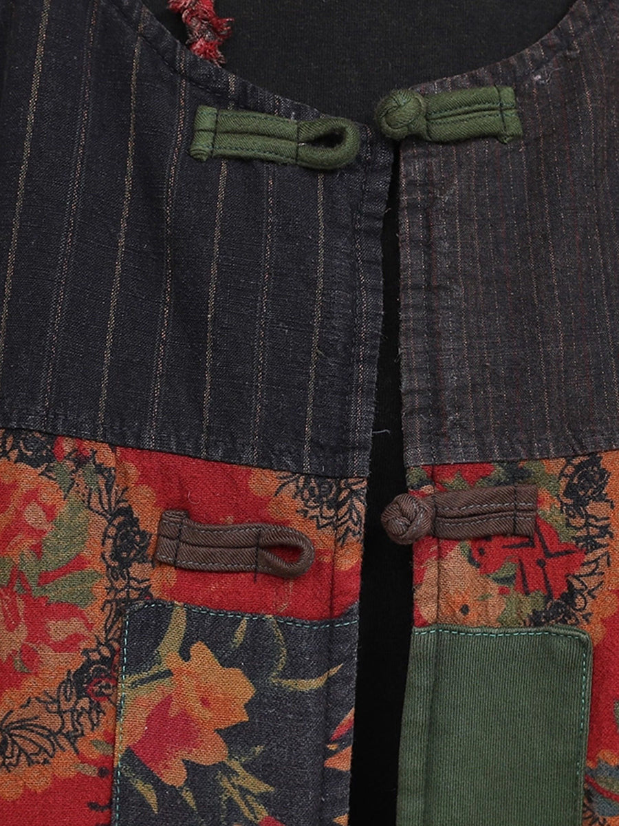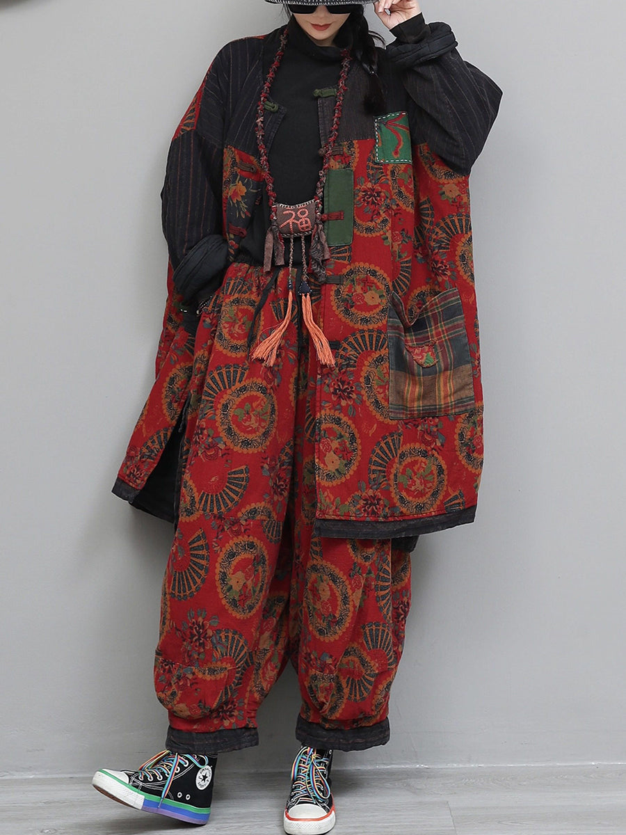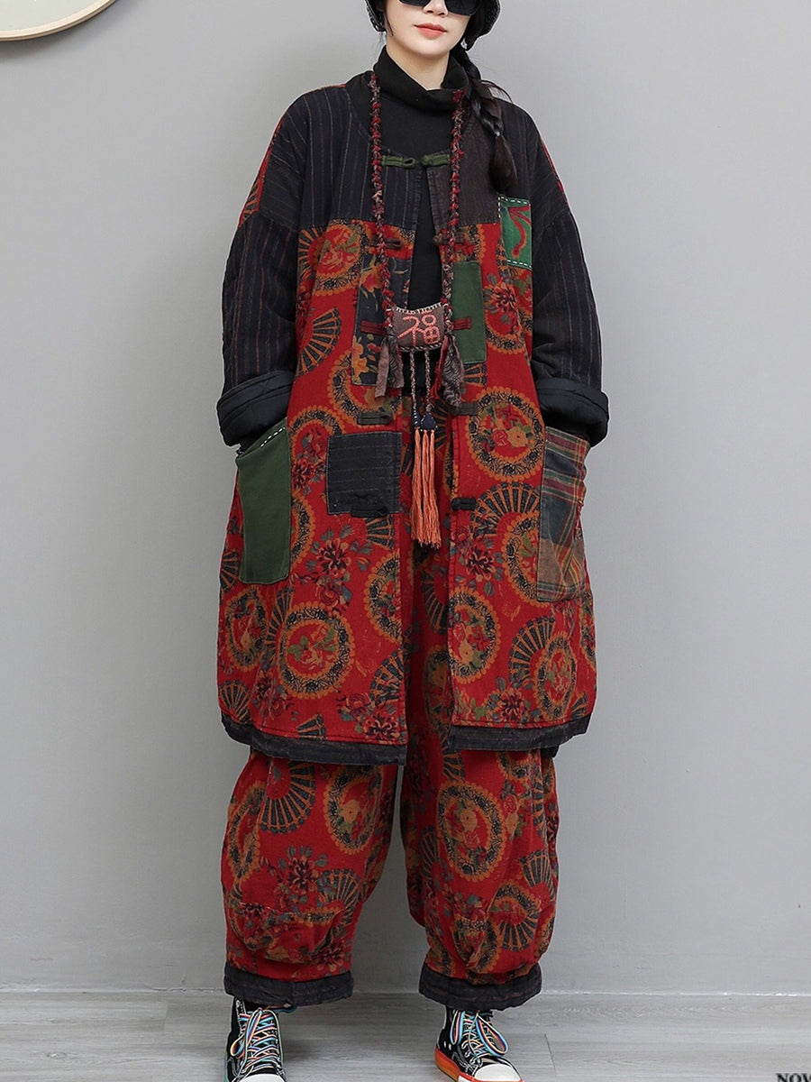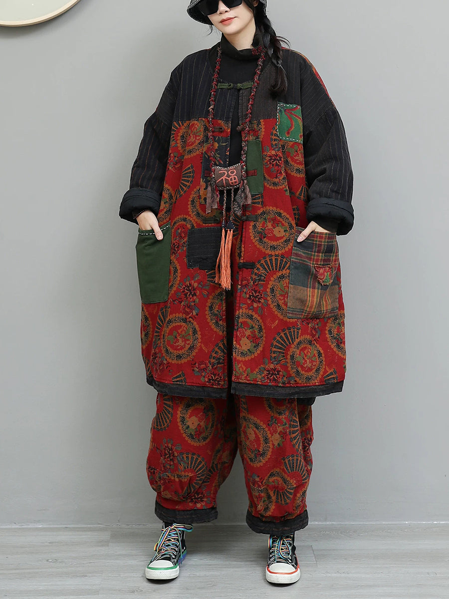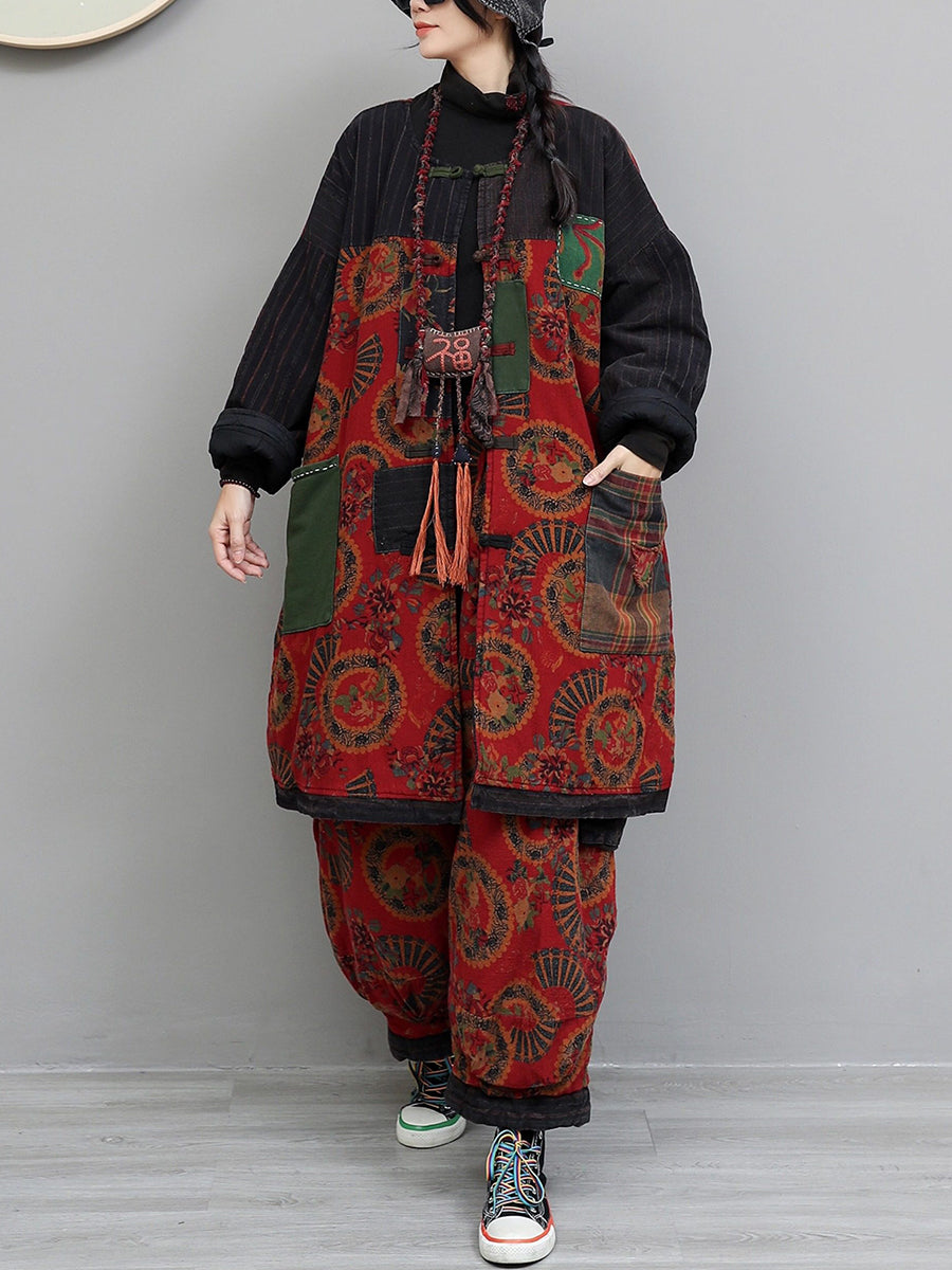 Women Winter Retro Patchwork O-Neck Padded Suits