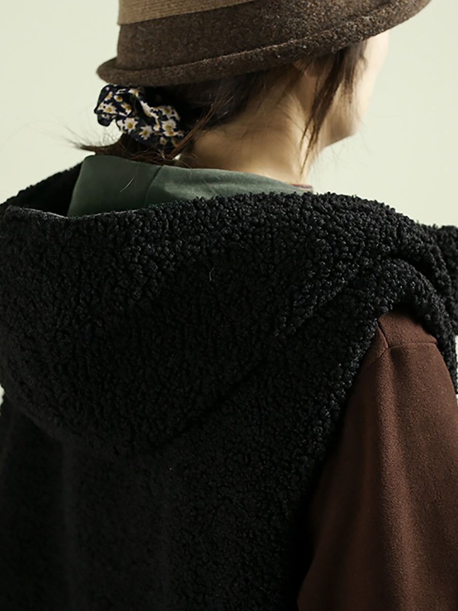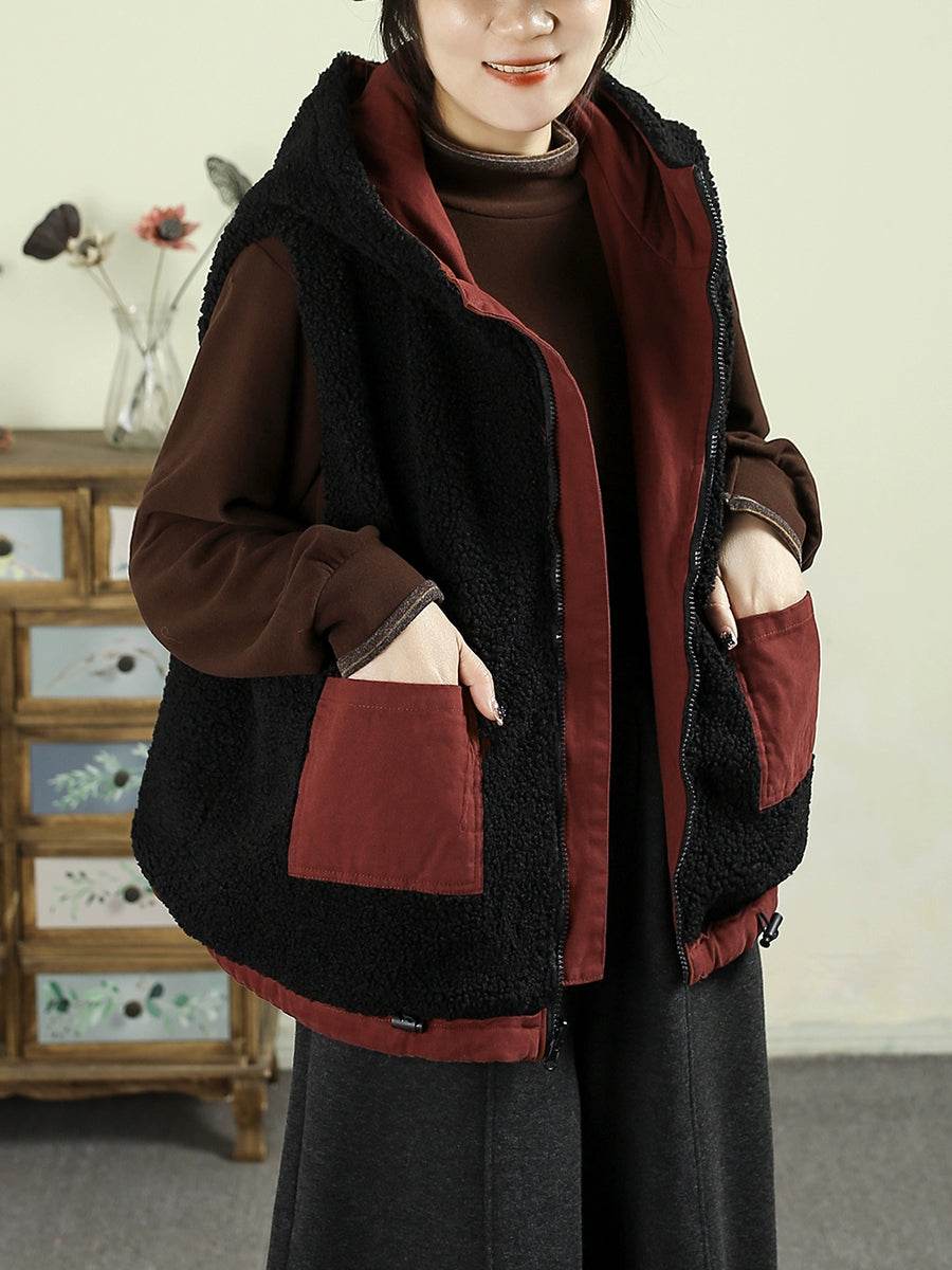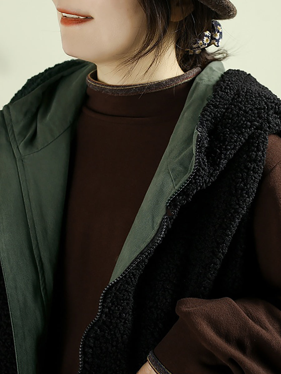 Women Winter Vintage Two-side Wearing Feece Hooded Vest