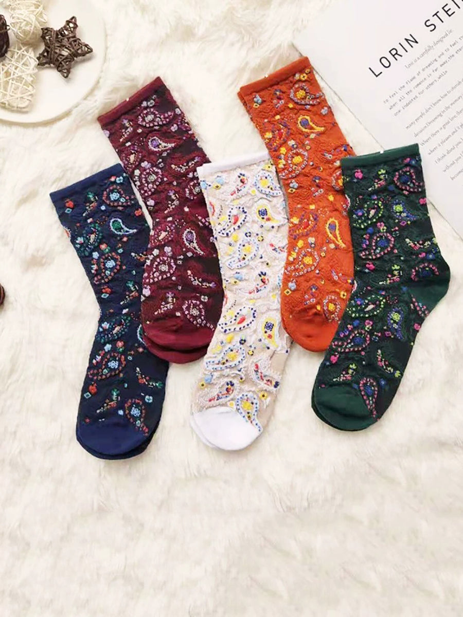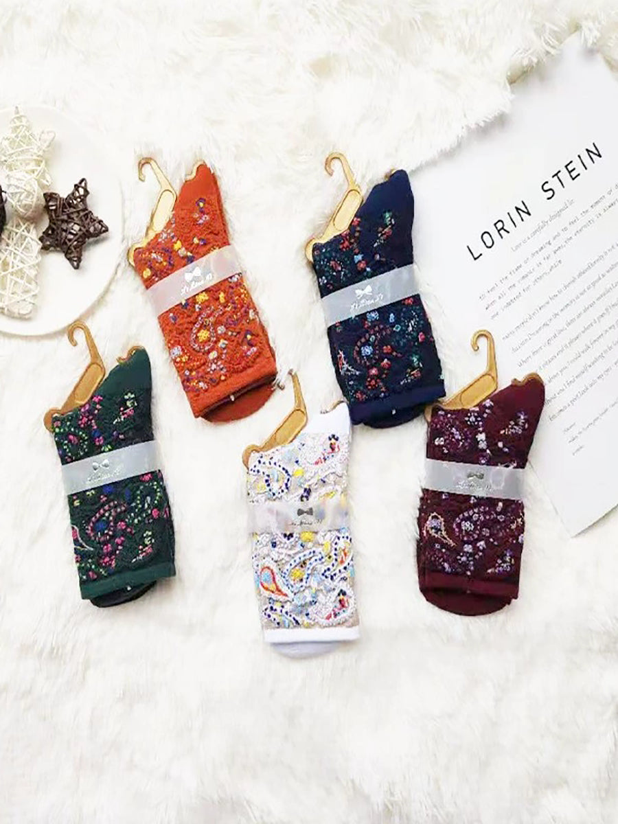 Conjunto de 5 pares de meias femininas com estampa floral jacquard.