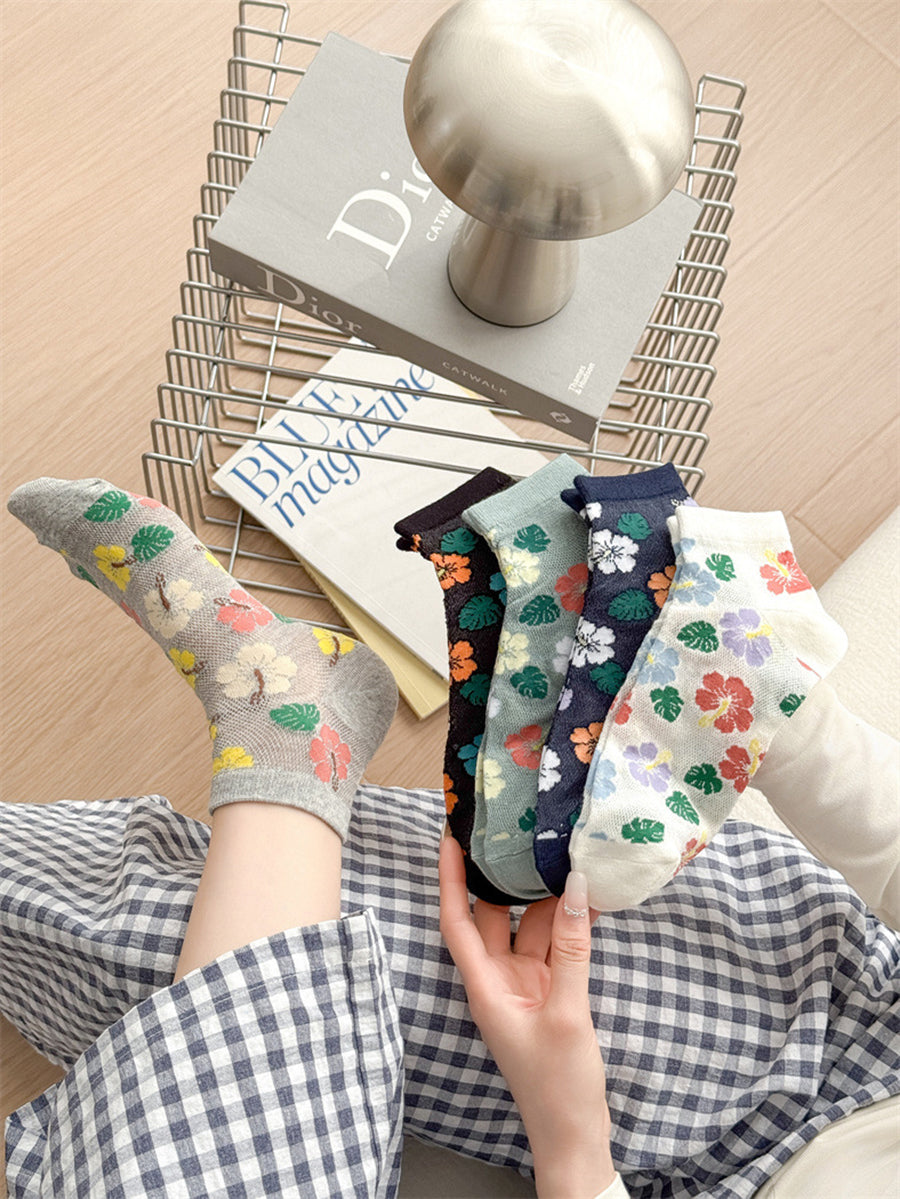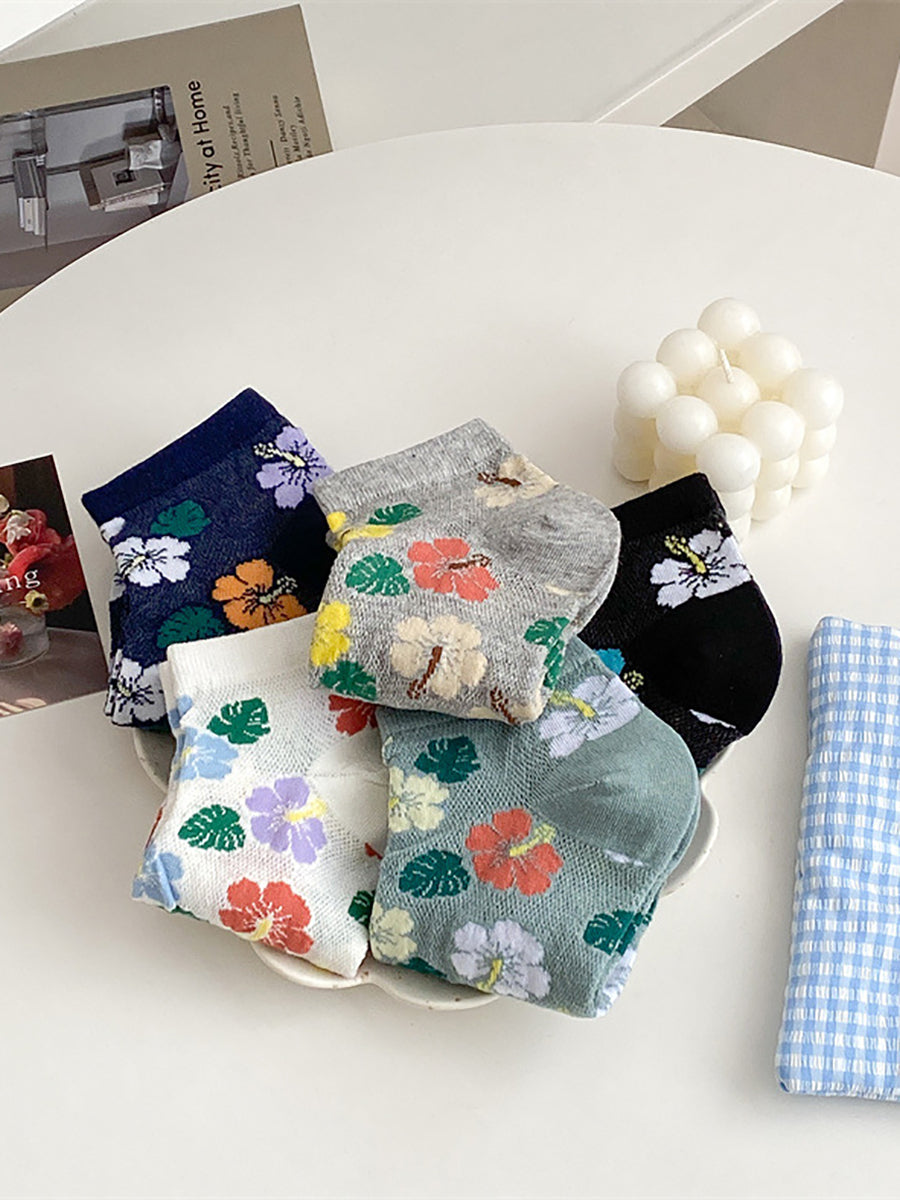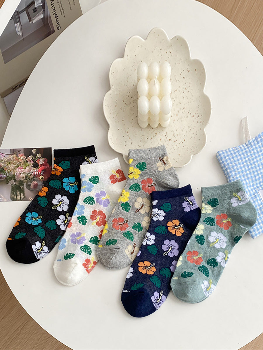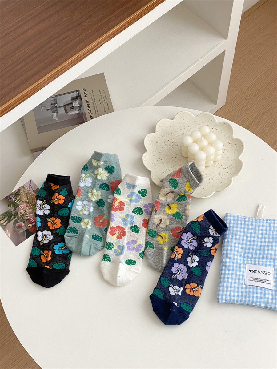 5 pares de meias femininas de algodão com estampa floral artística