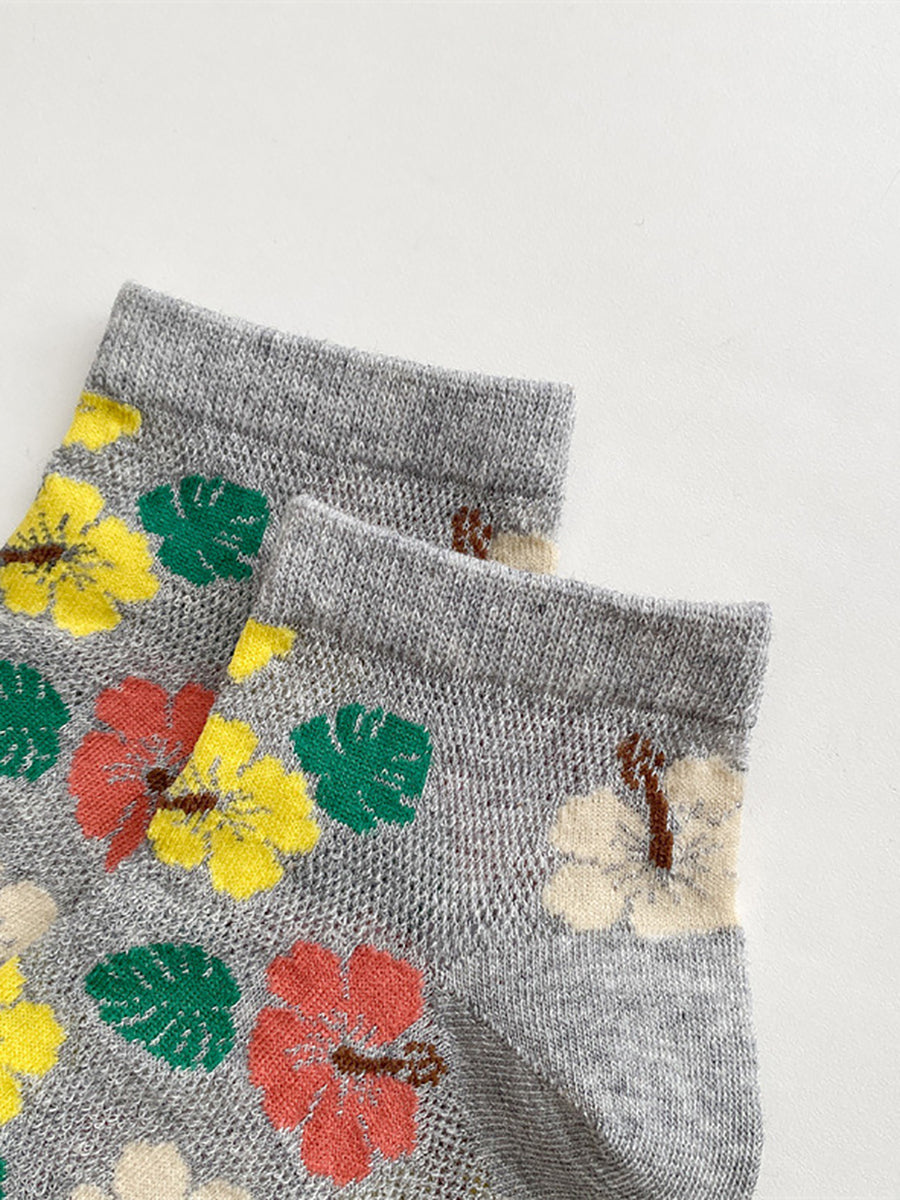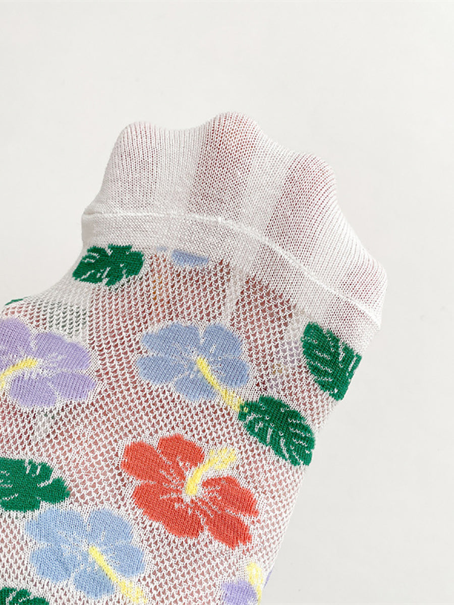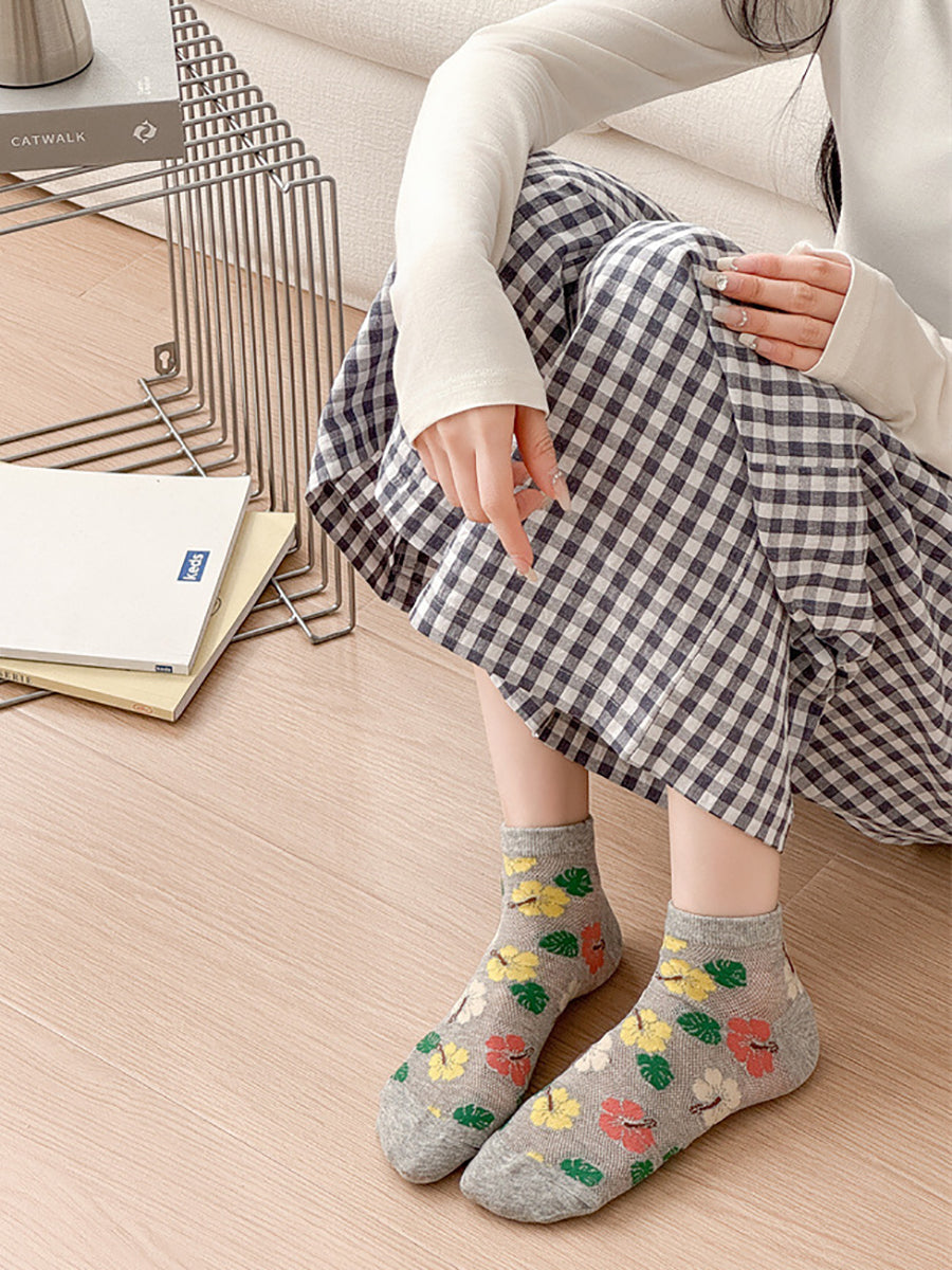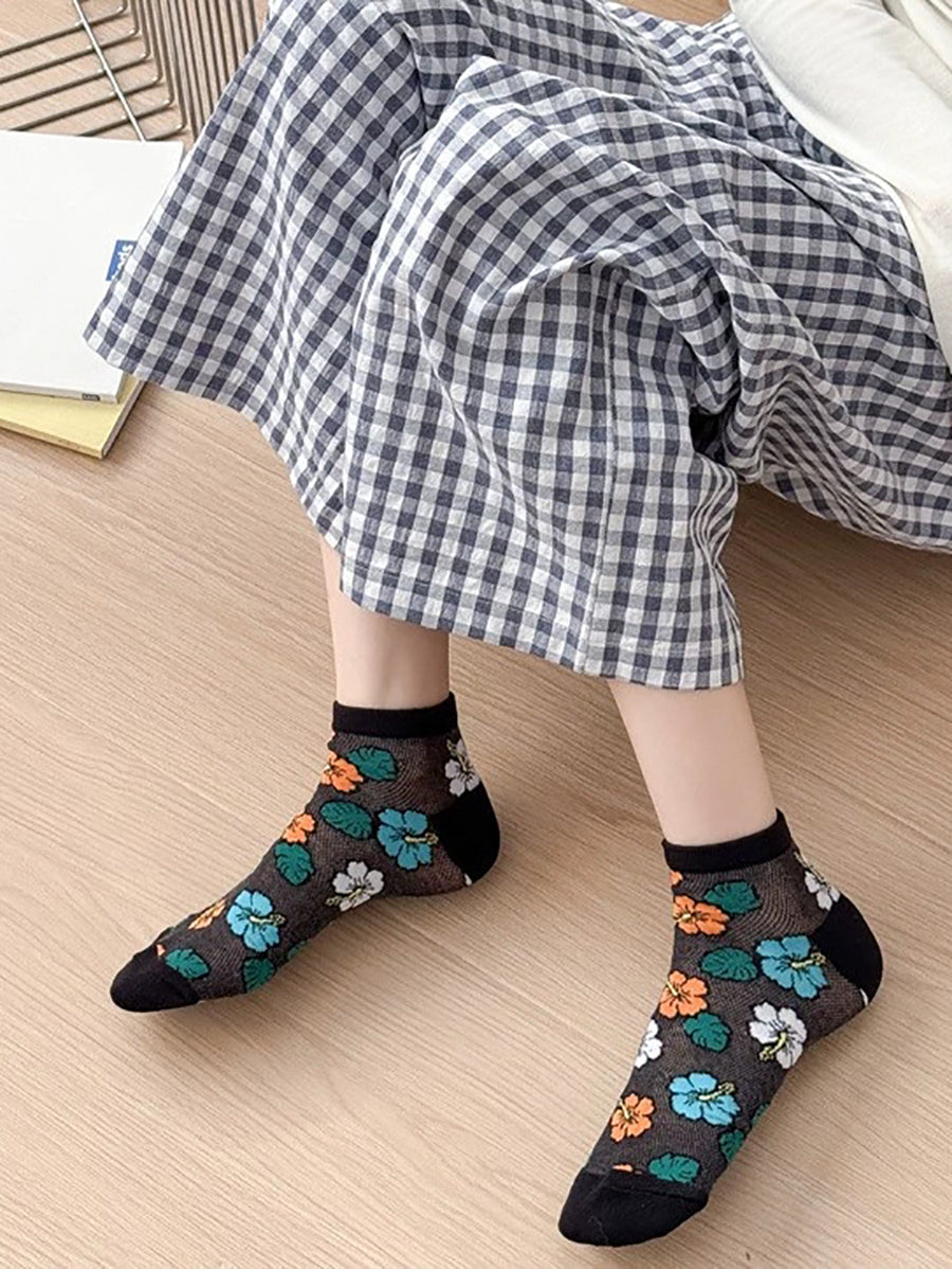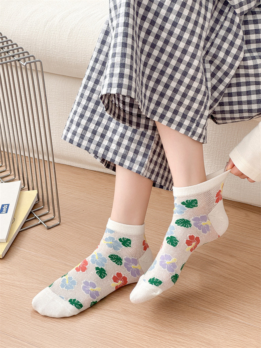 5 pares de meias femininas de algodão com estampa floral artística