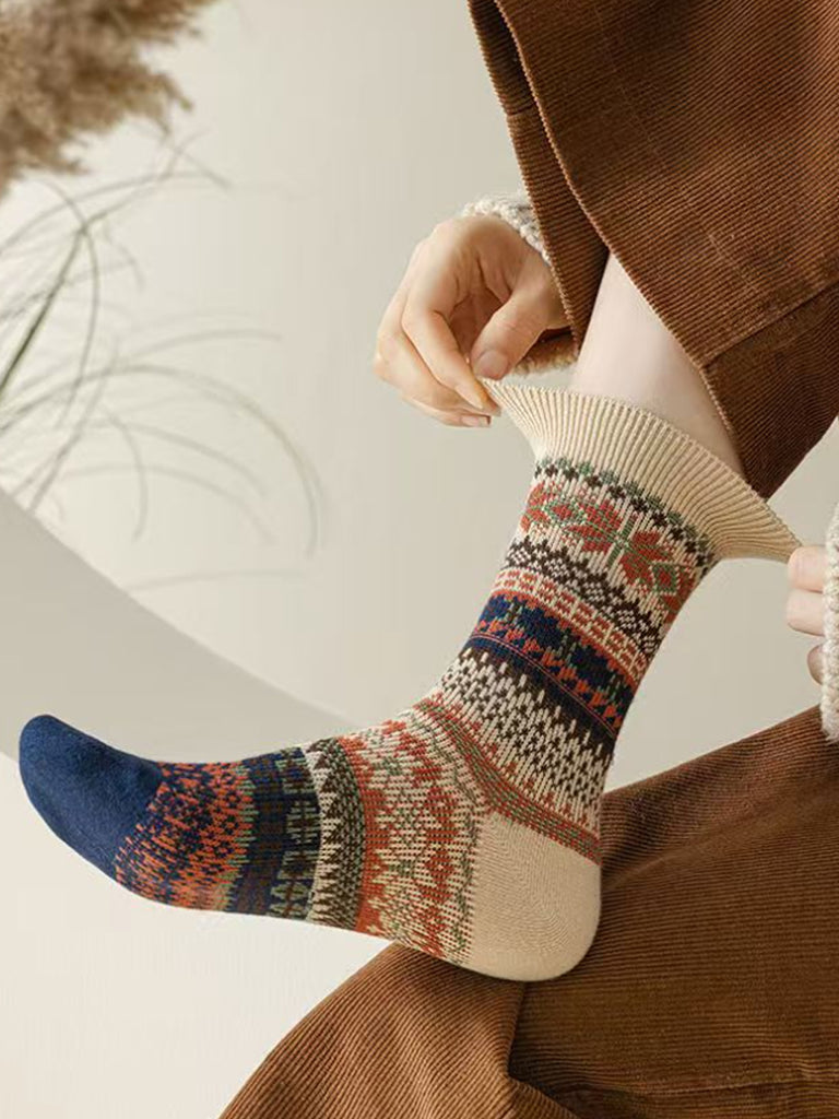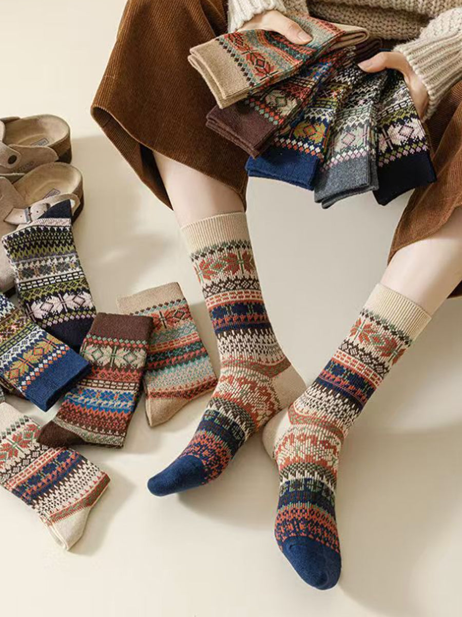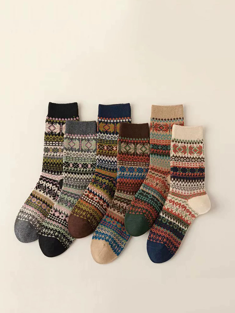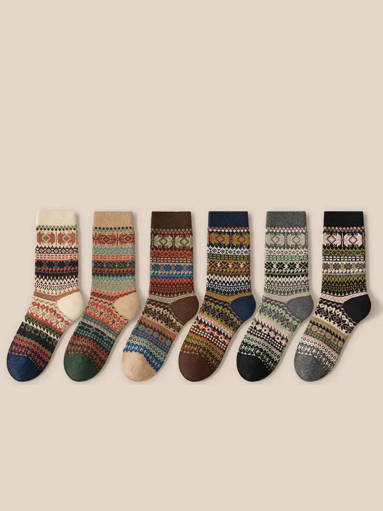 6 pares de meias femininas vintage de algodão listradas de inverno