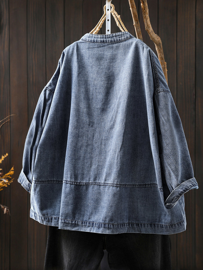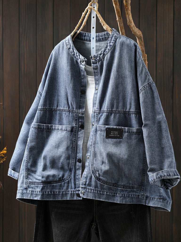 Casaco jeans feminino plus size retrô de verão em cor lisa com gola alta.