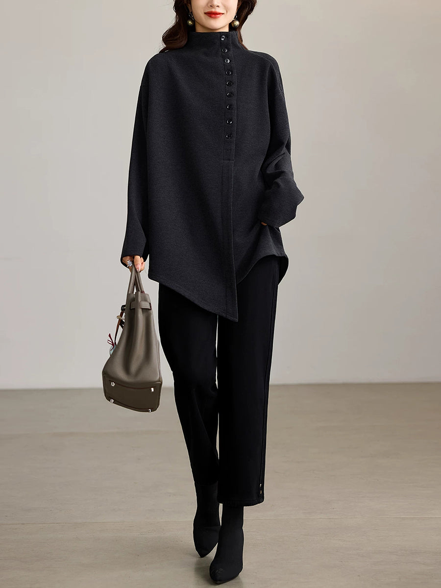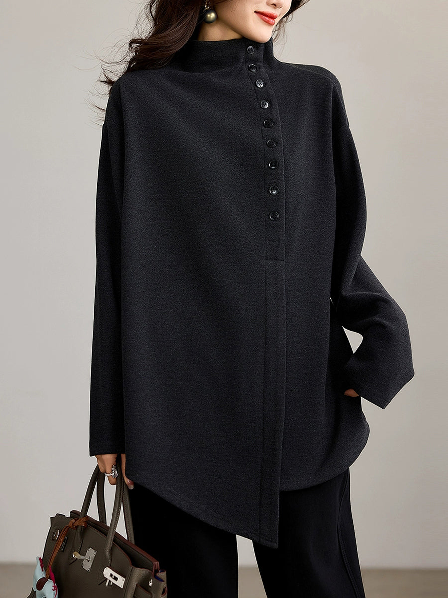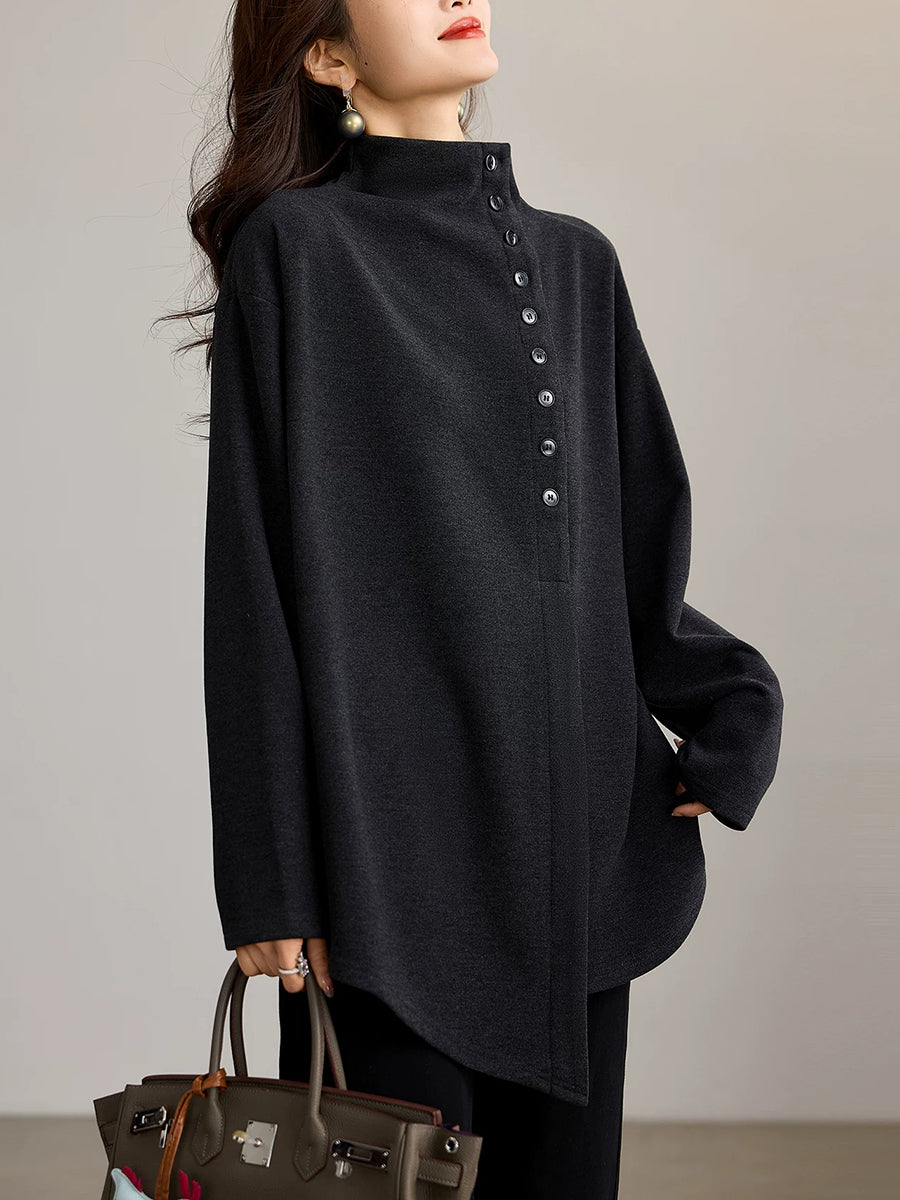Blusa feminina de gola alta com botões, estilo artístico para o outono.