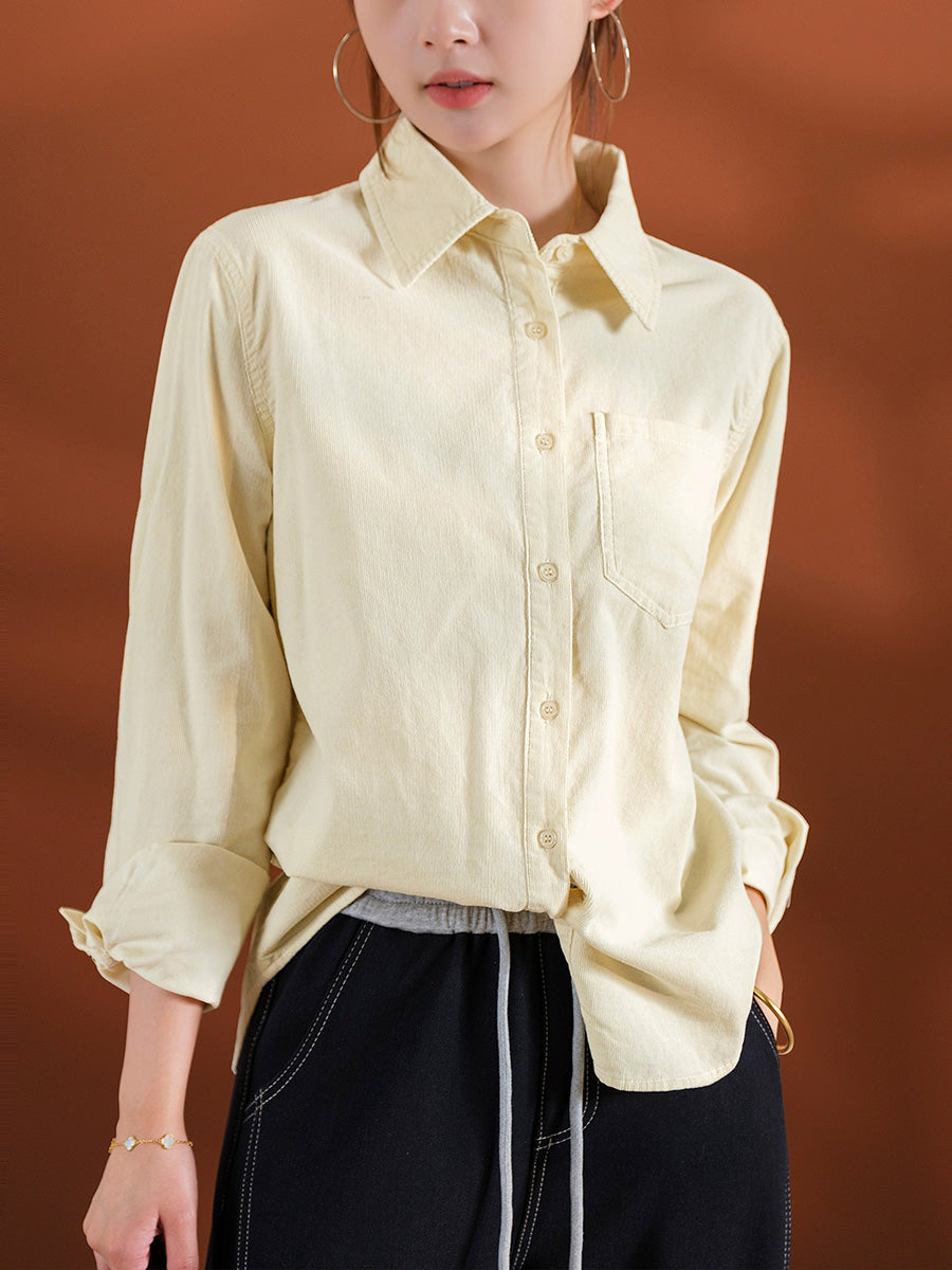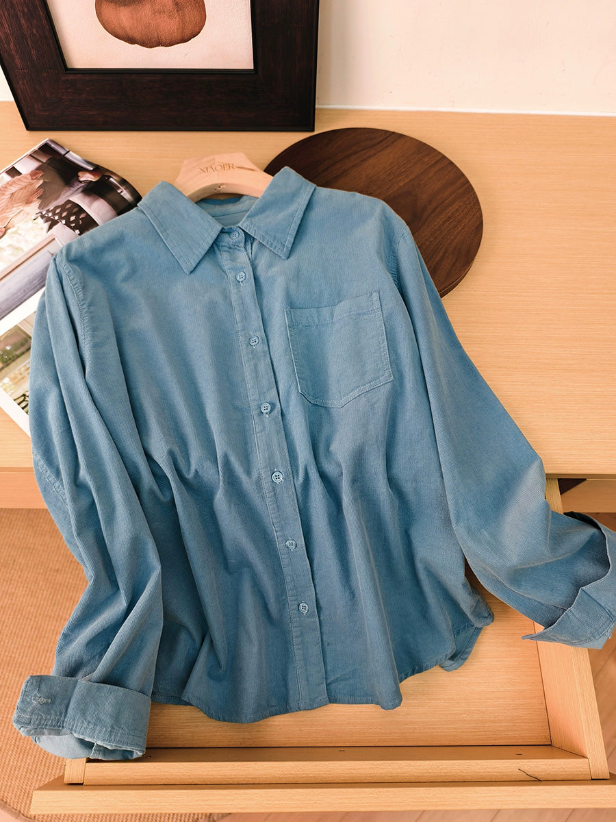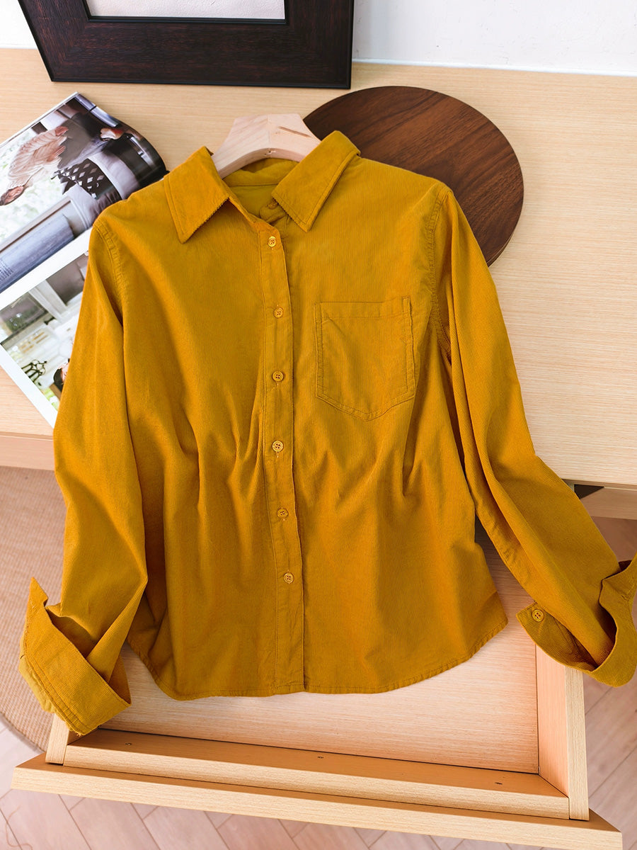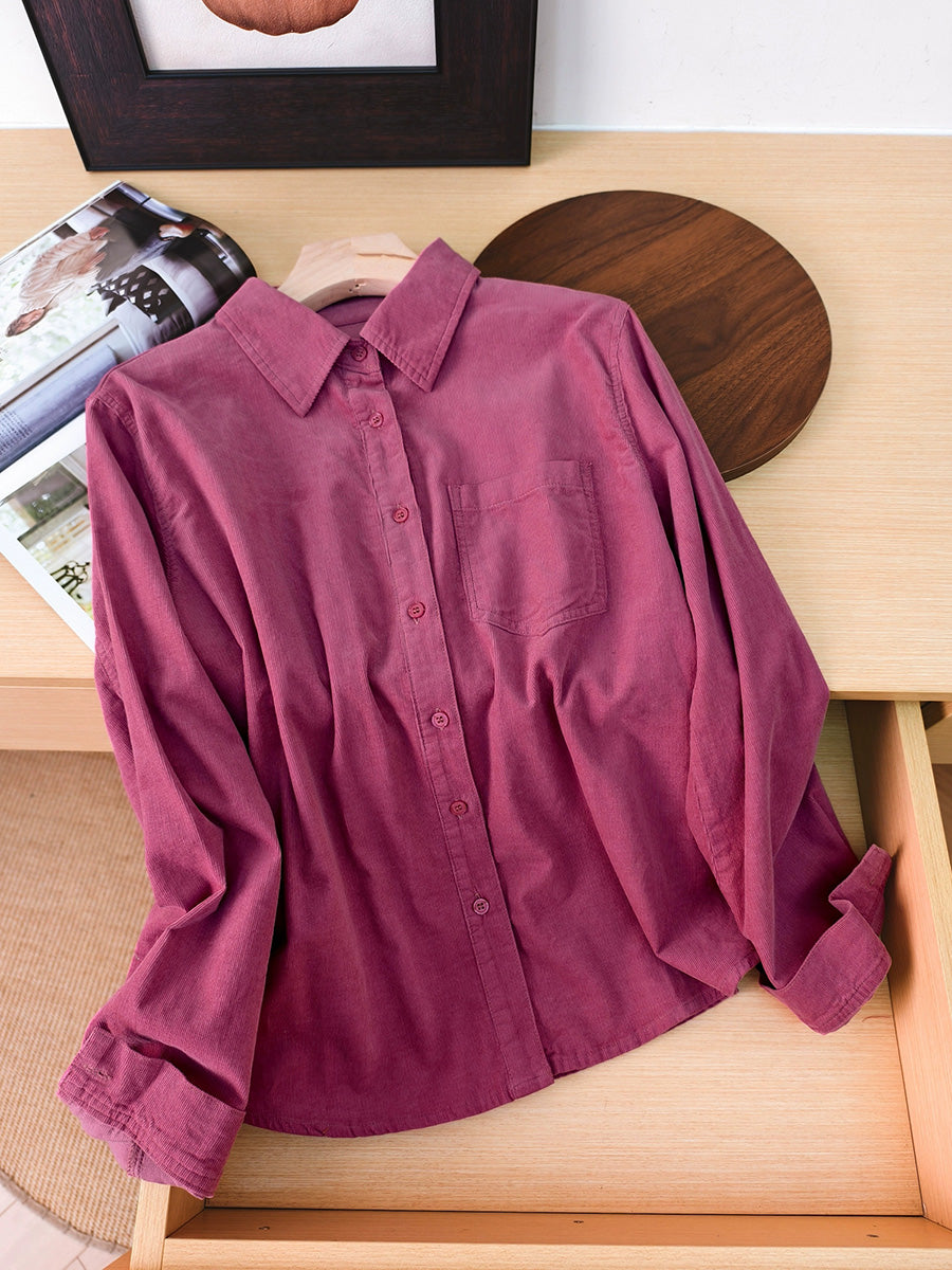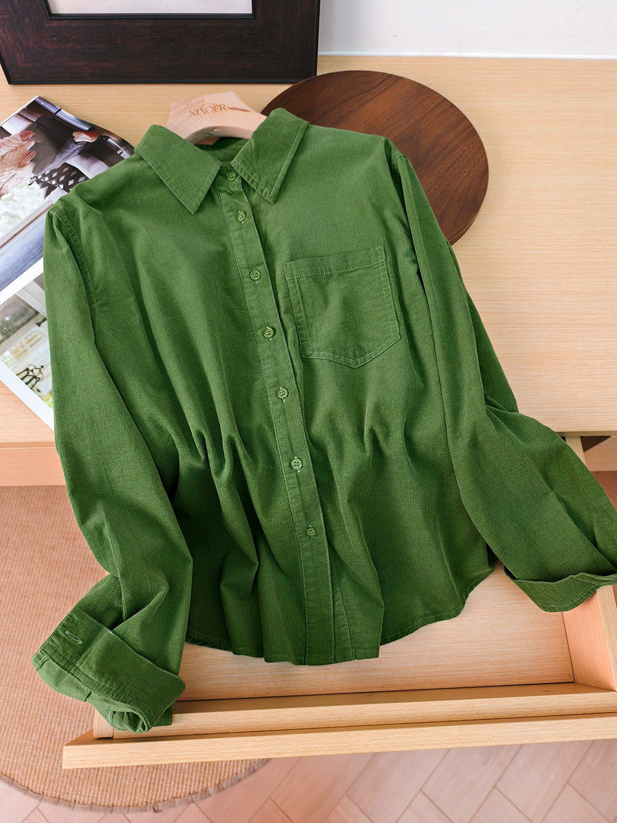 Blusa feminina de veludo cotelê em cor lisa, estilo outono, com design artístico.
