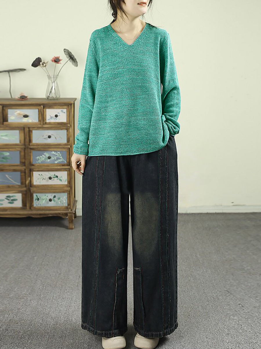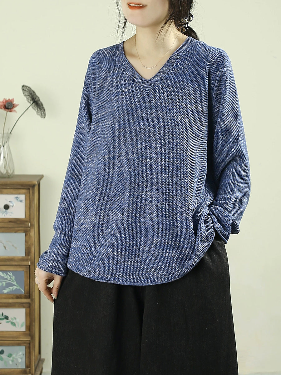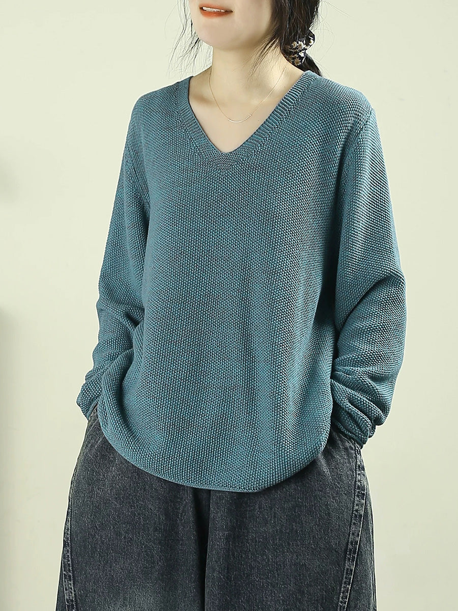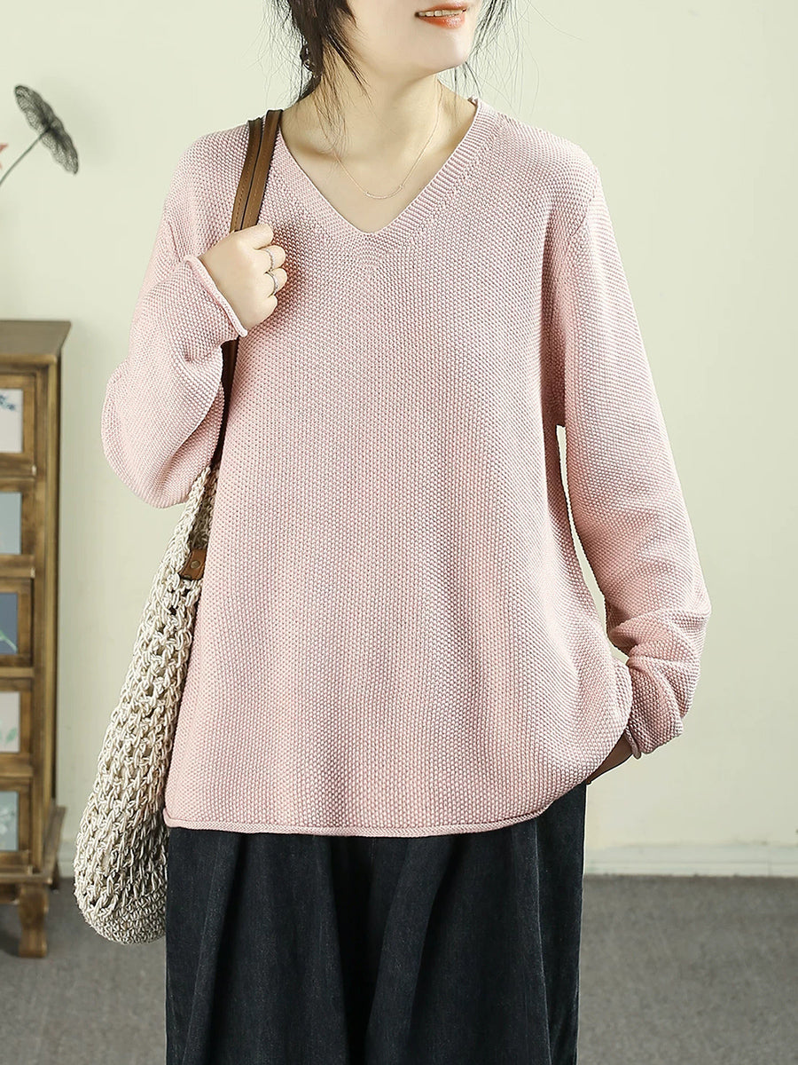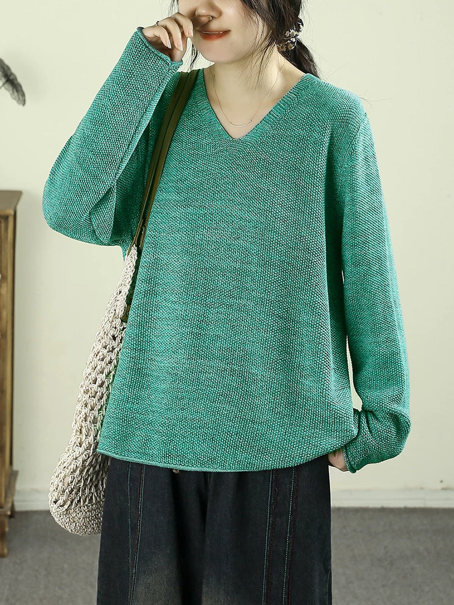 Suéter feminino casual de cor lisa com decote em V, estilo artístico e perfeito para a primavera.