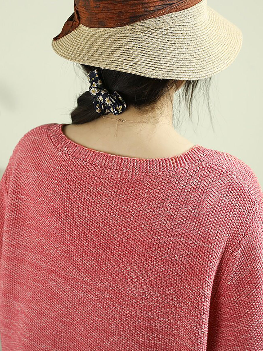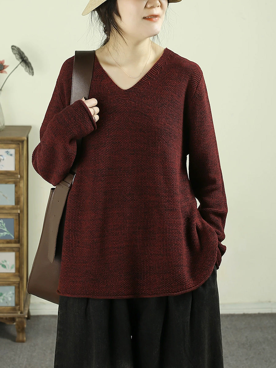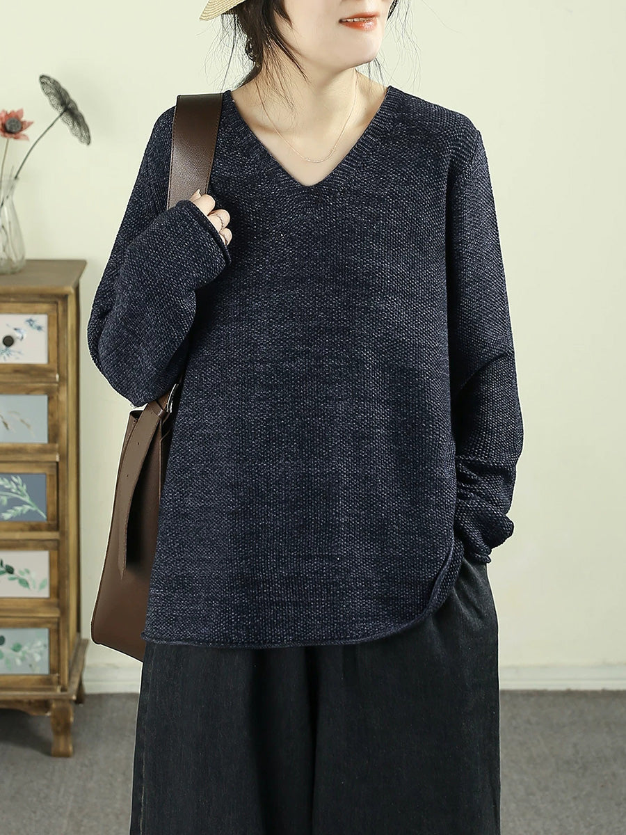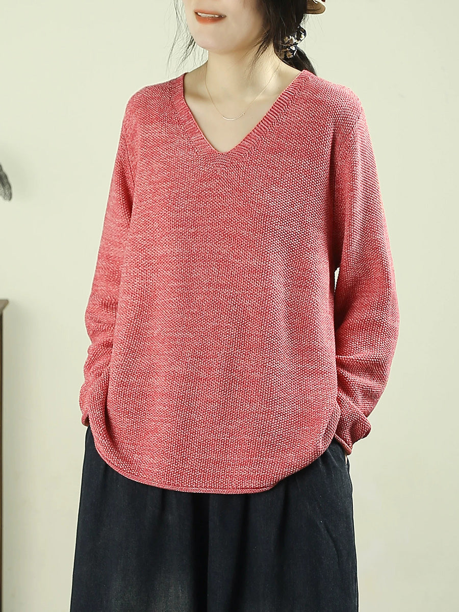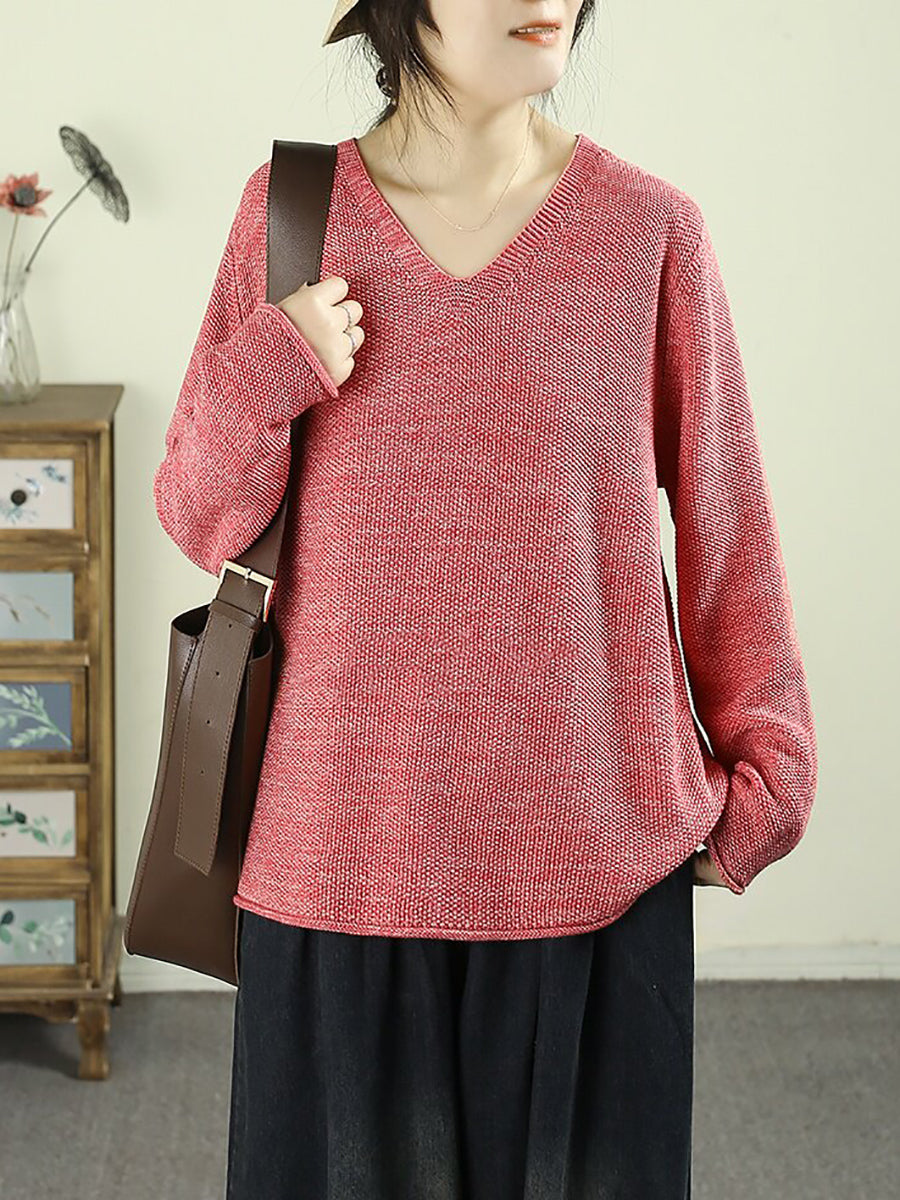 Suéter feminino casual de cor lisa com decote em V, estilo artístico e perfeito para a primavera.