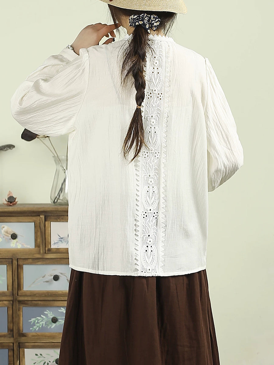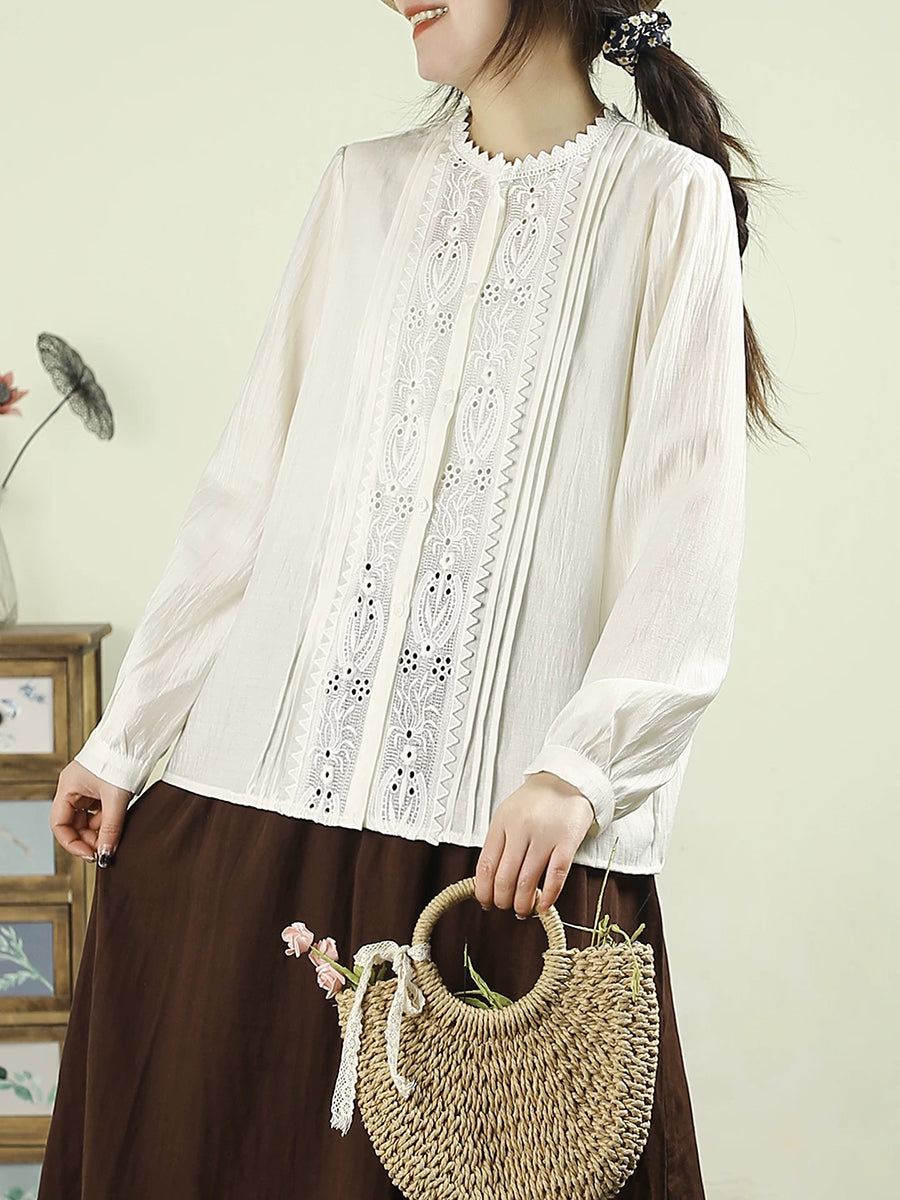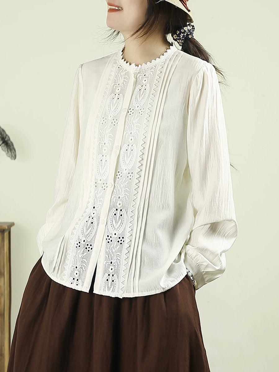Camisa feminina artística de primavera com bordados e detalhes em renda.