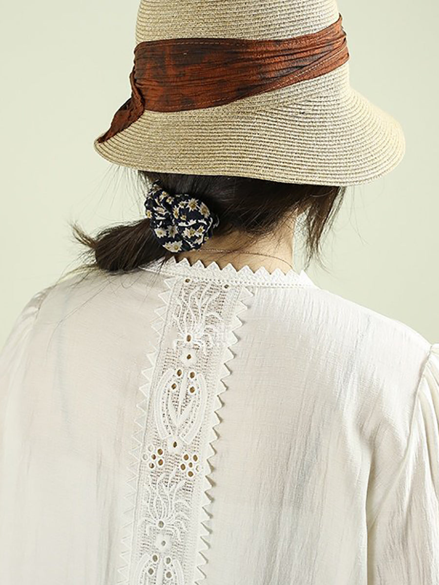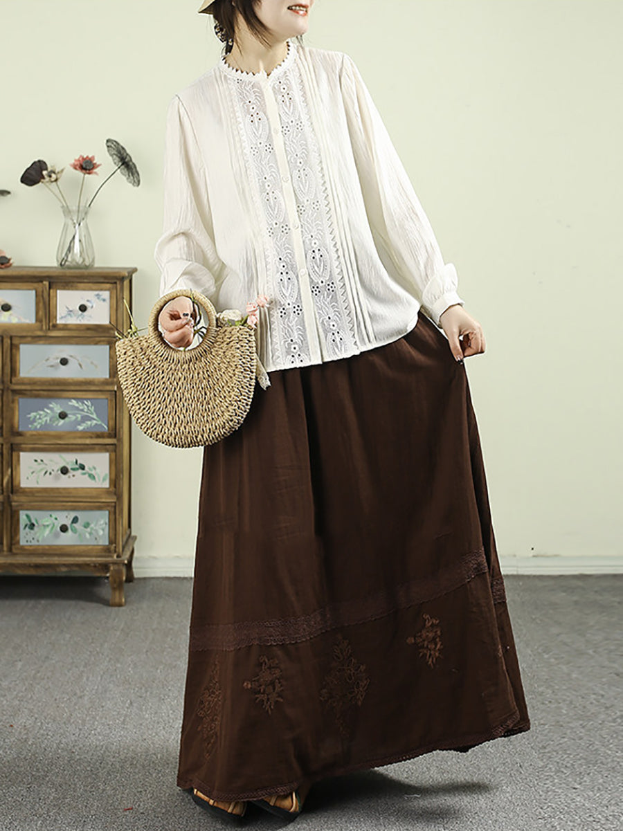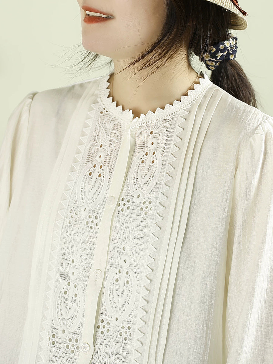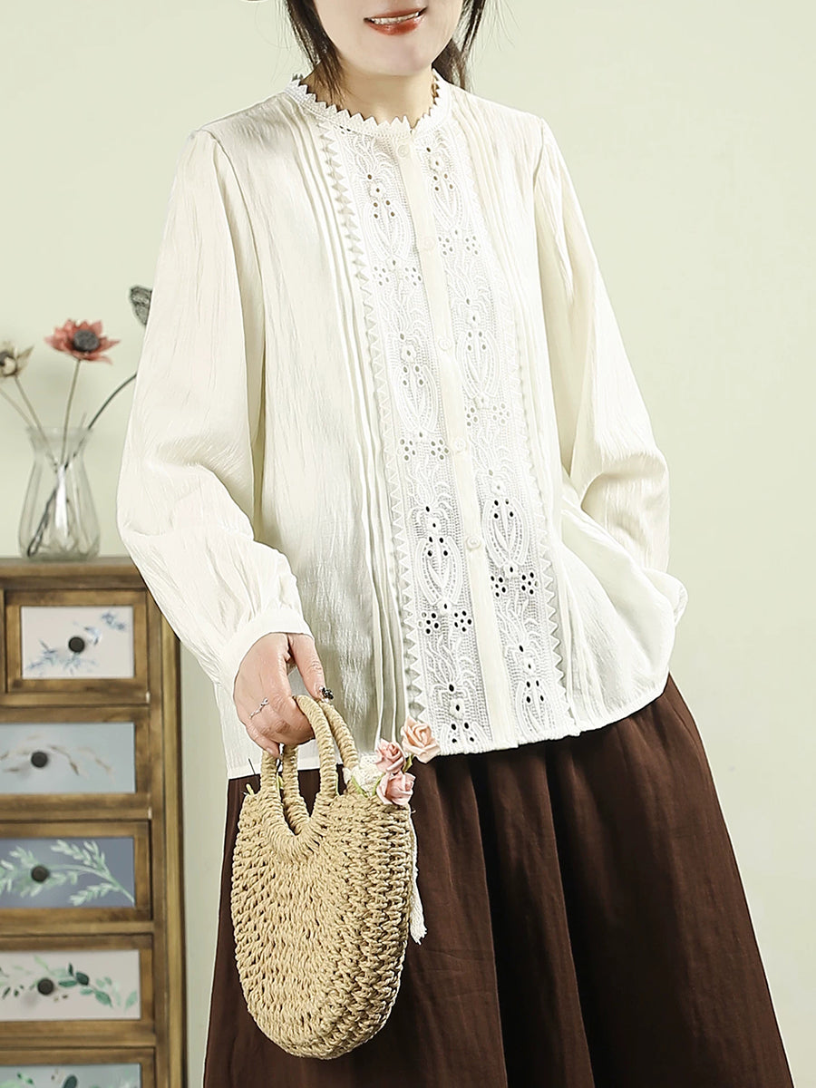 Camisa feminina artística de primavera com bordados e detalhes em renda.