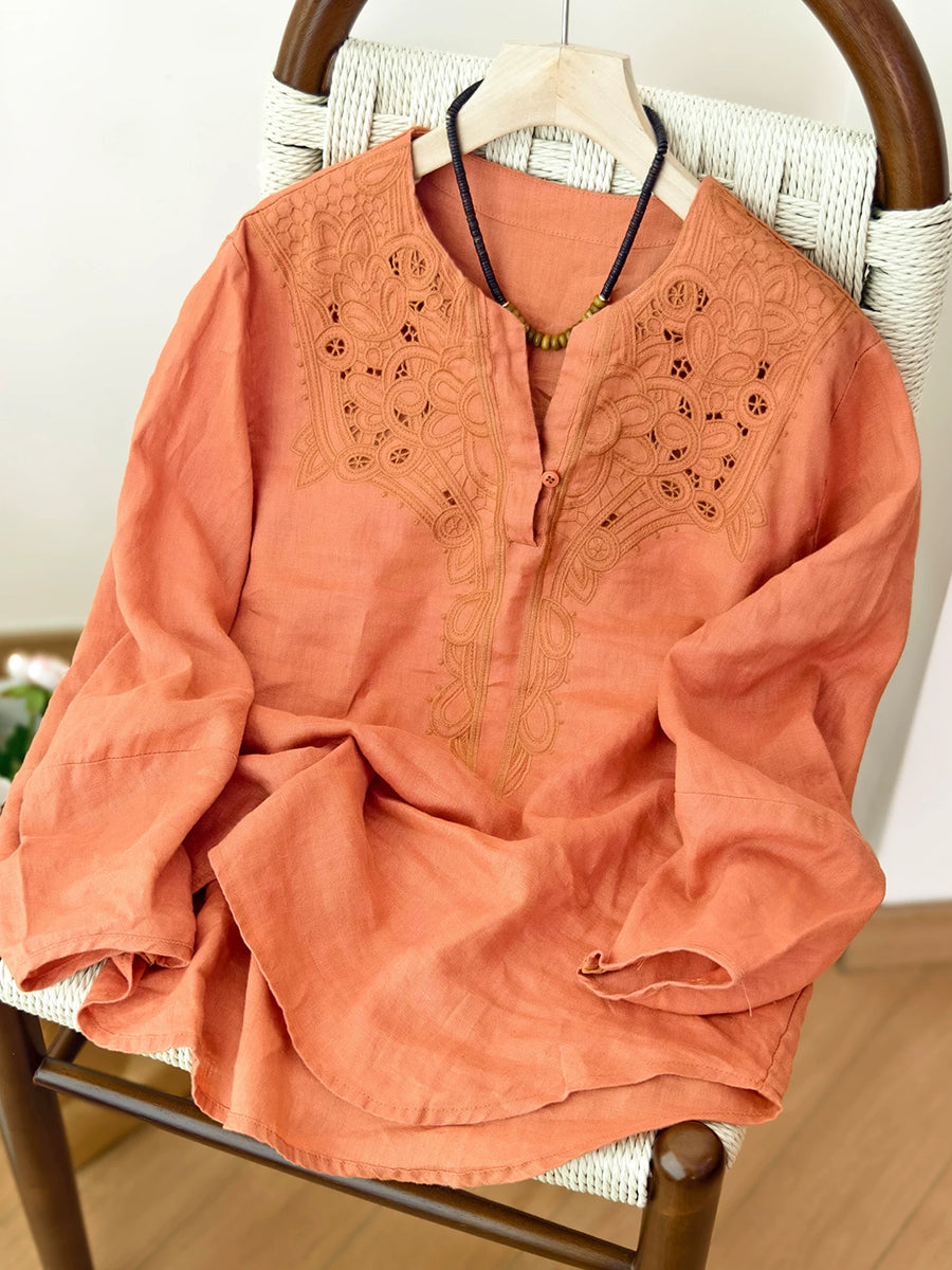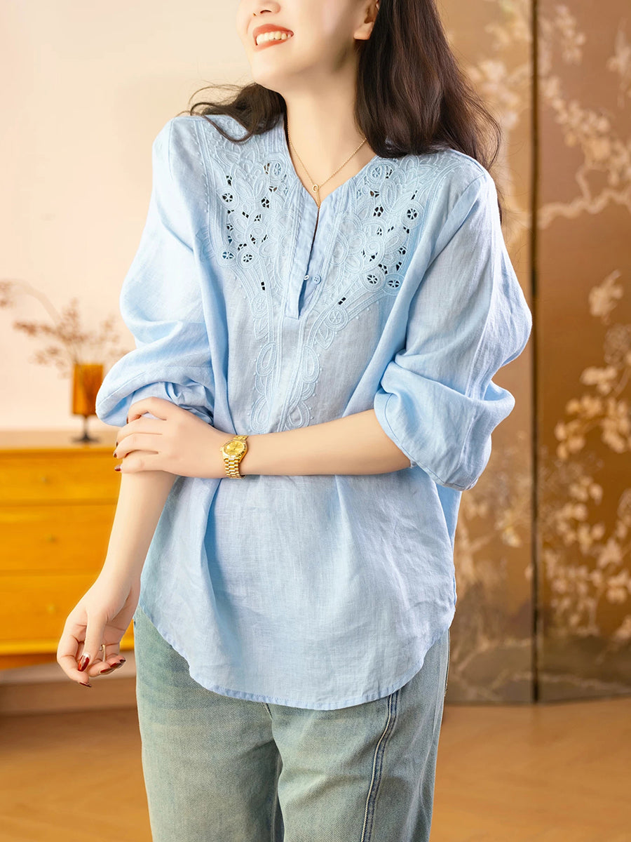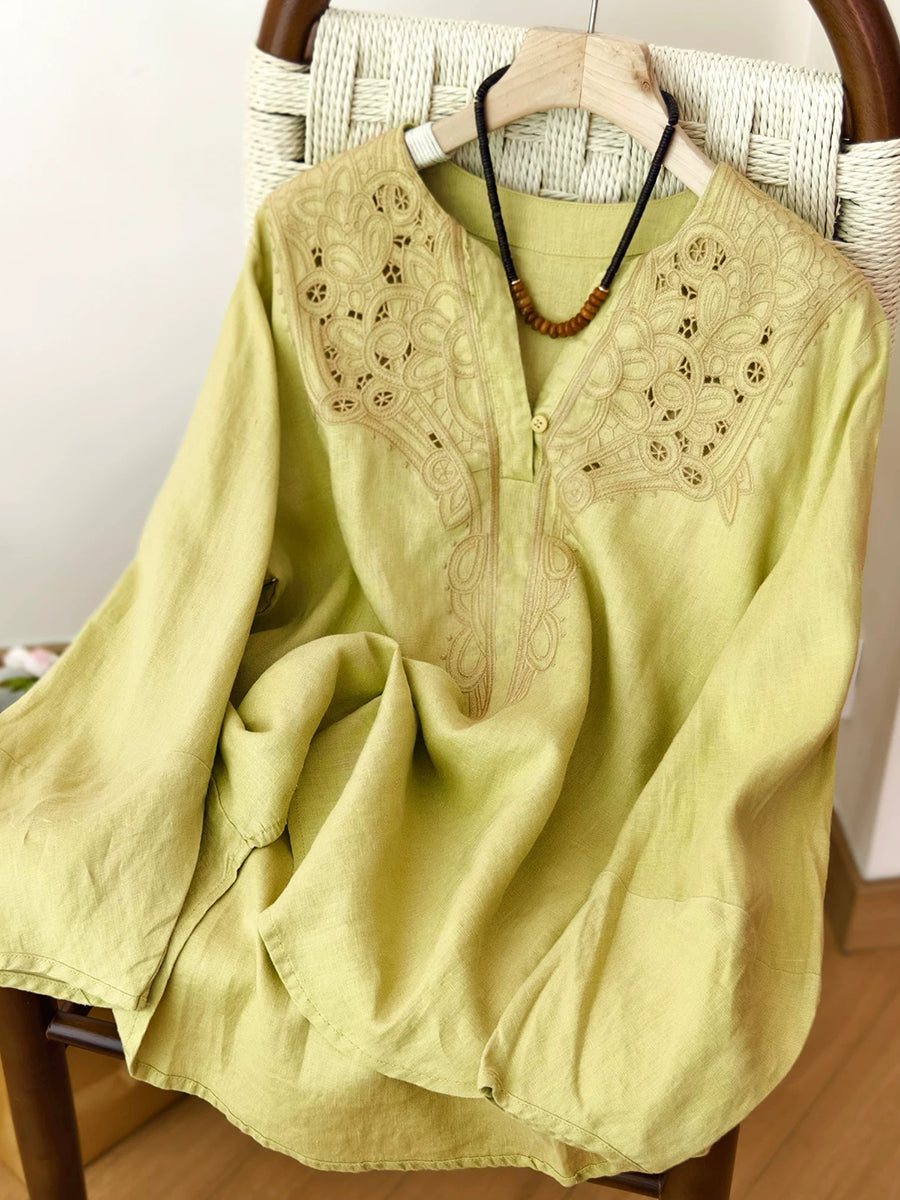 Blusa feminina Artsy Spring com bordado e decote em V, 100% linho.