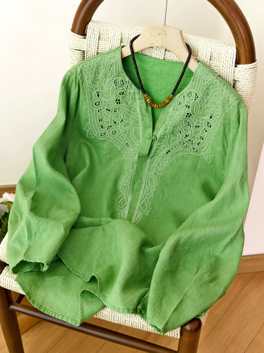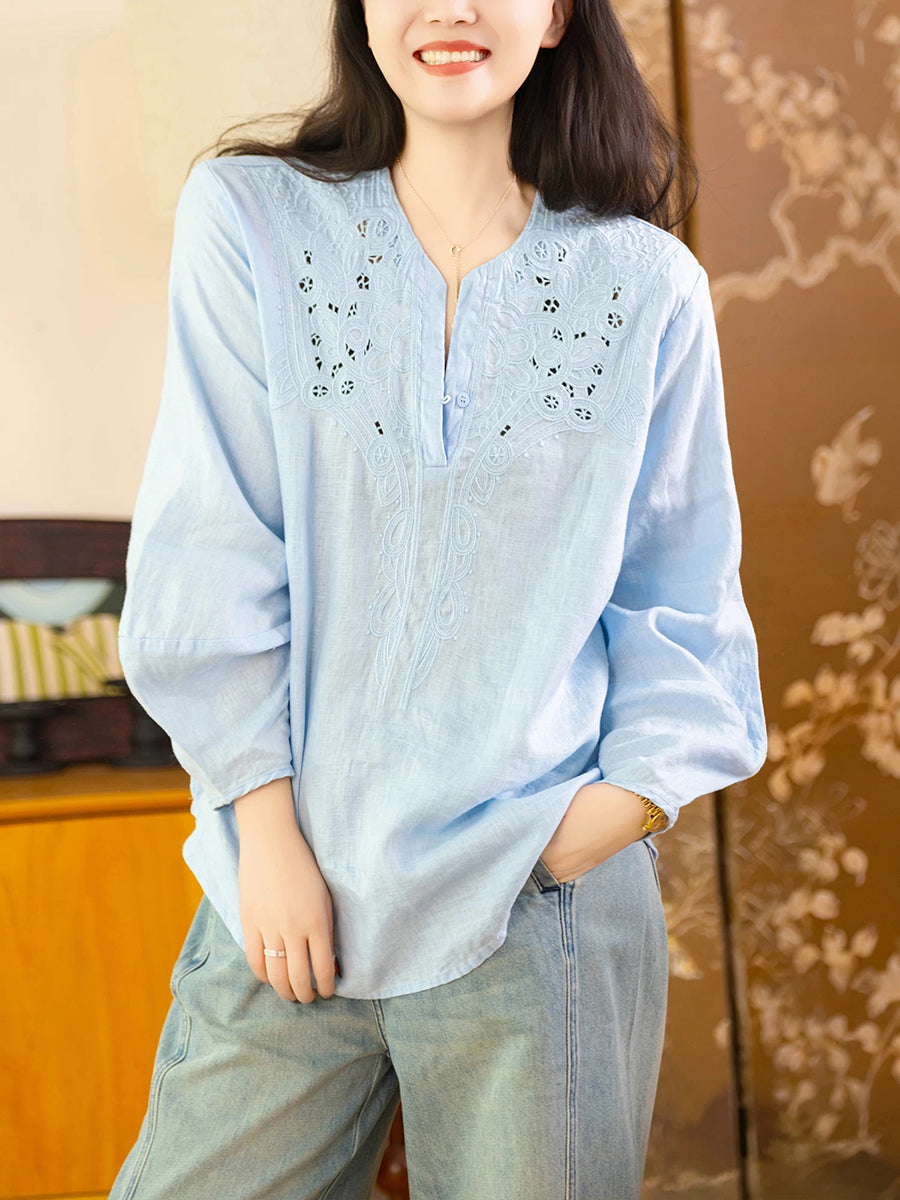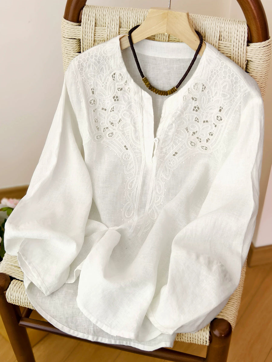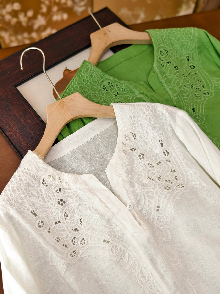 Blusa feminina Artsy Spring com bordado e decote em V, 100% linho.