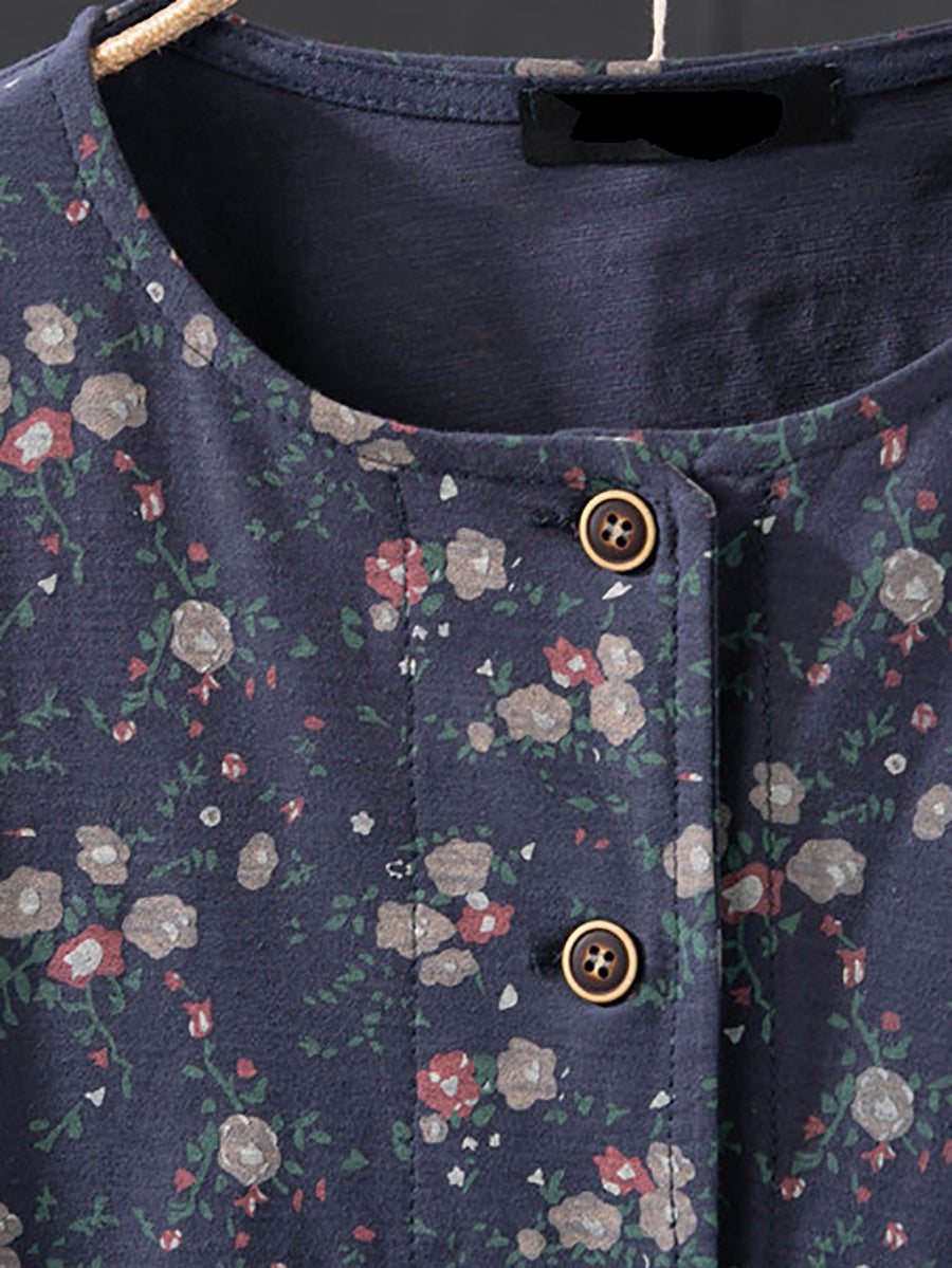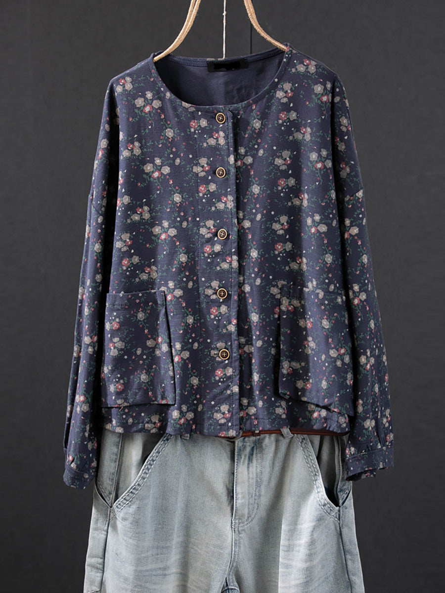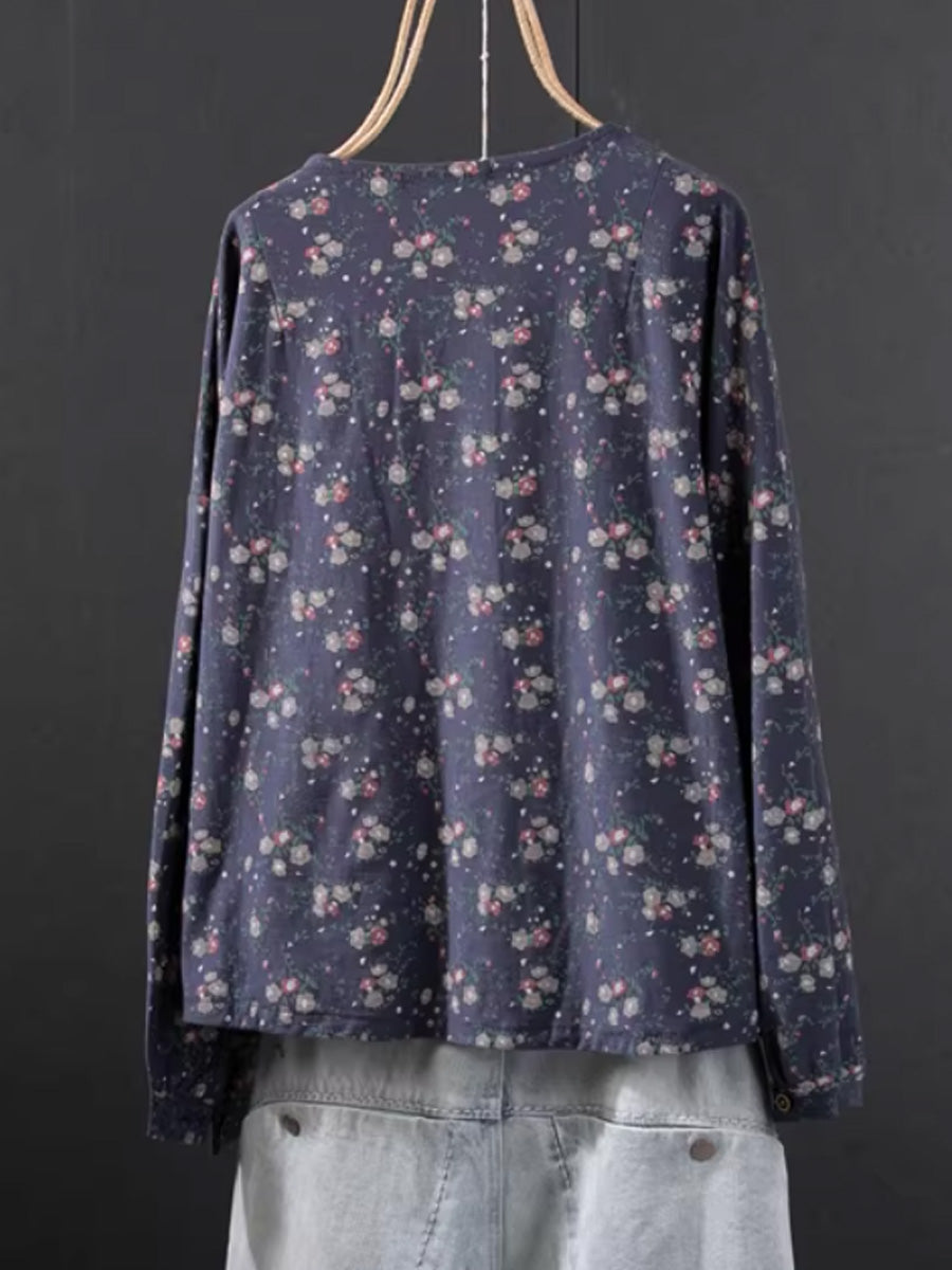 Camisa feminina de algodão com estampa floral e gola redonda, estilo artístico para a primavera.