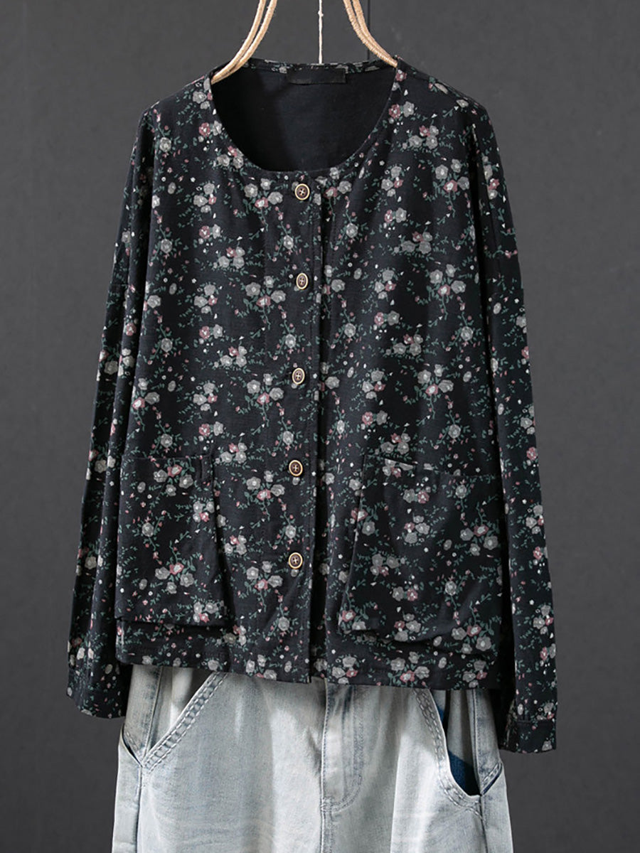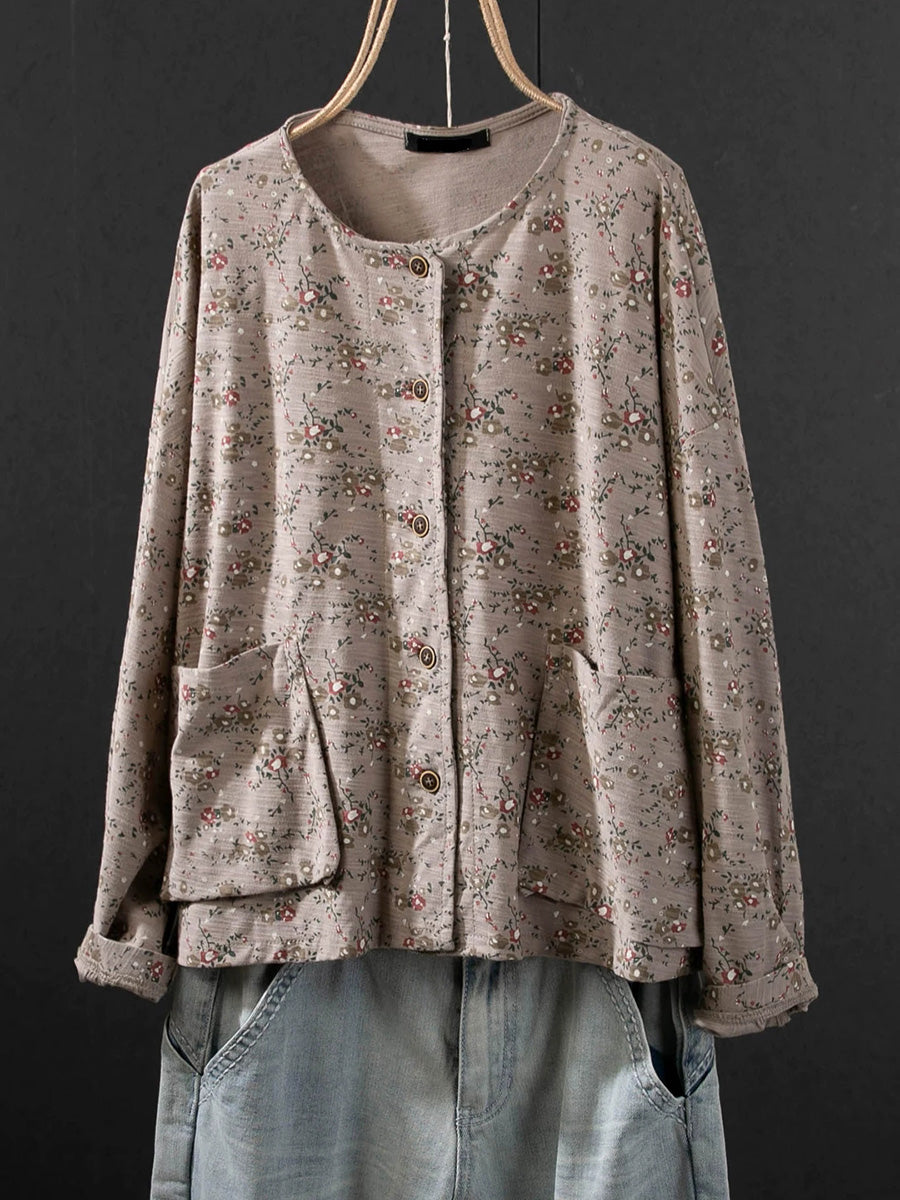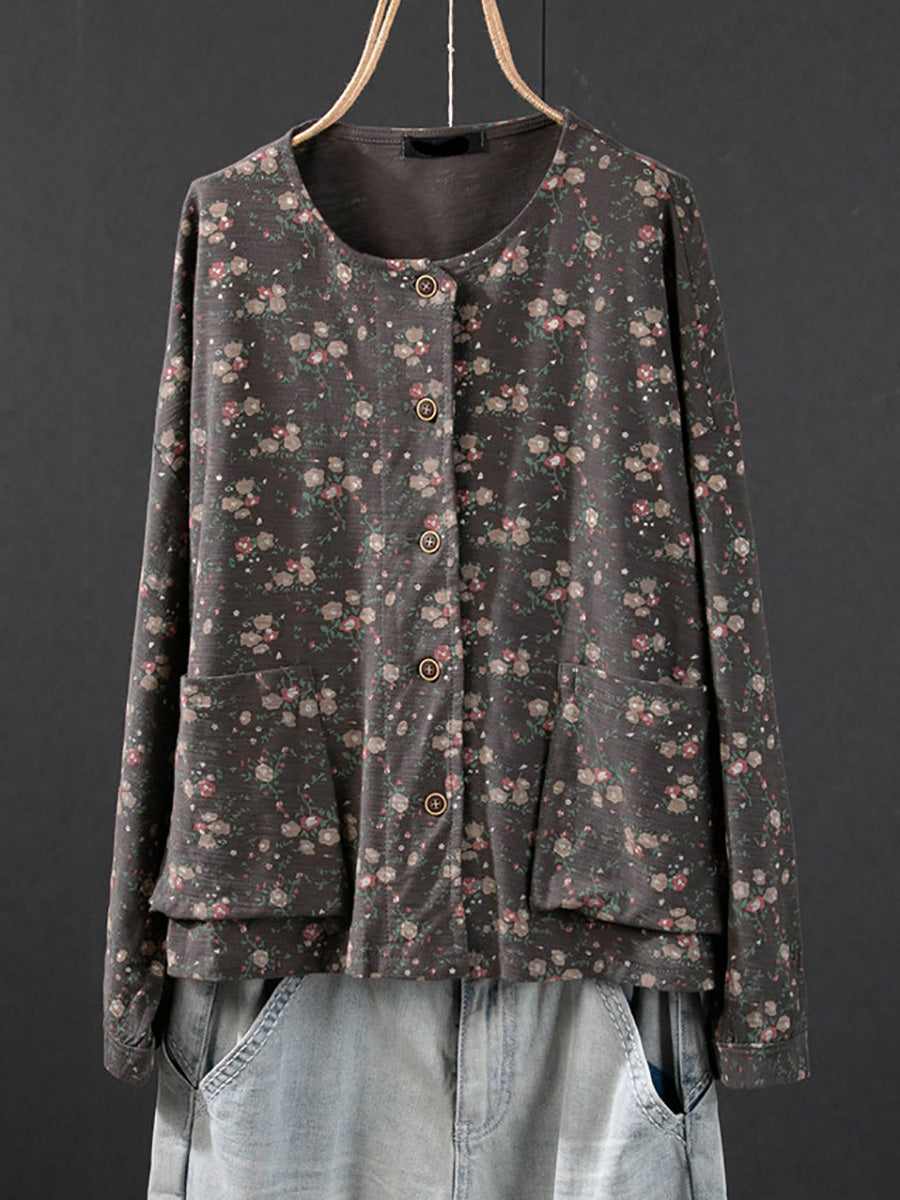 Camisa feminina de algodão com estampa floral e gola redonda, estilo artístico para a primavera.