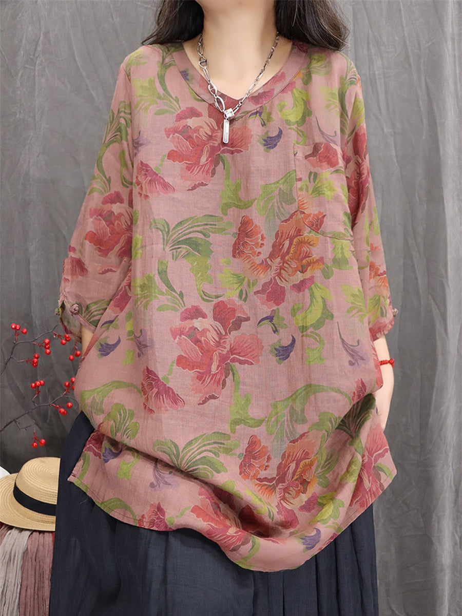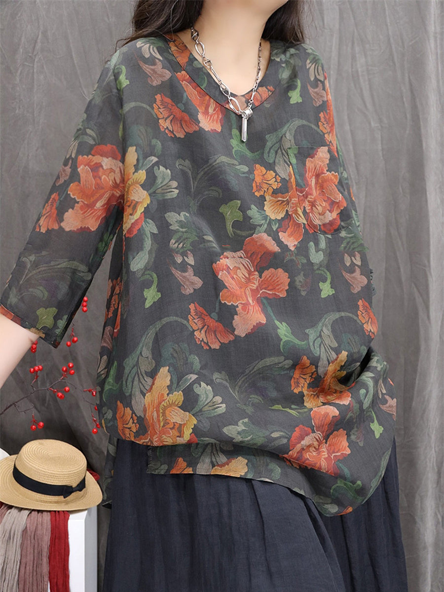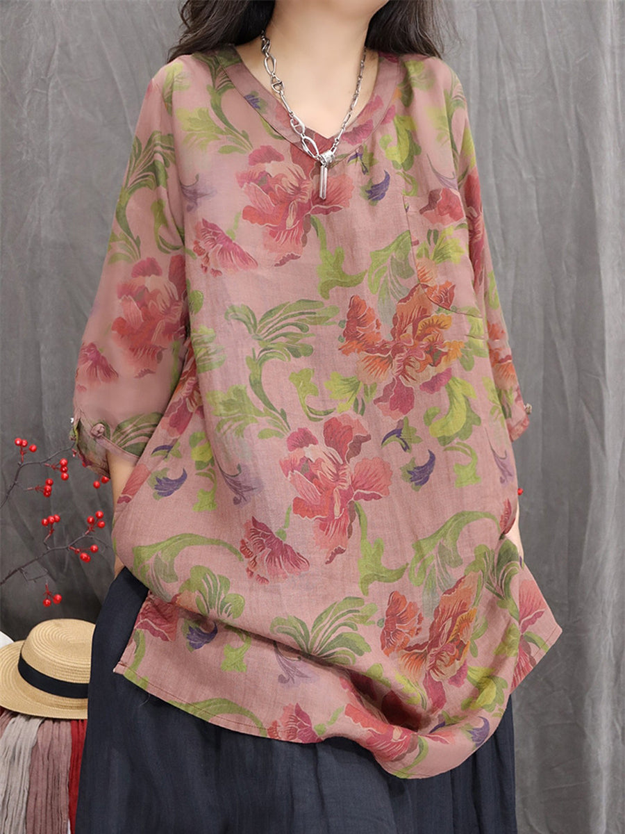 Blusa feminina artística com estampa floral de primavera, decote em V, 100% rami.