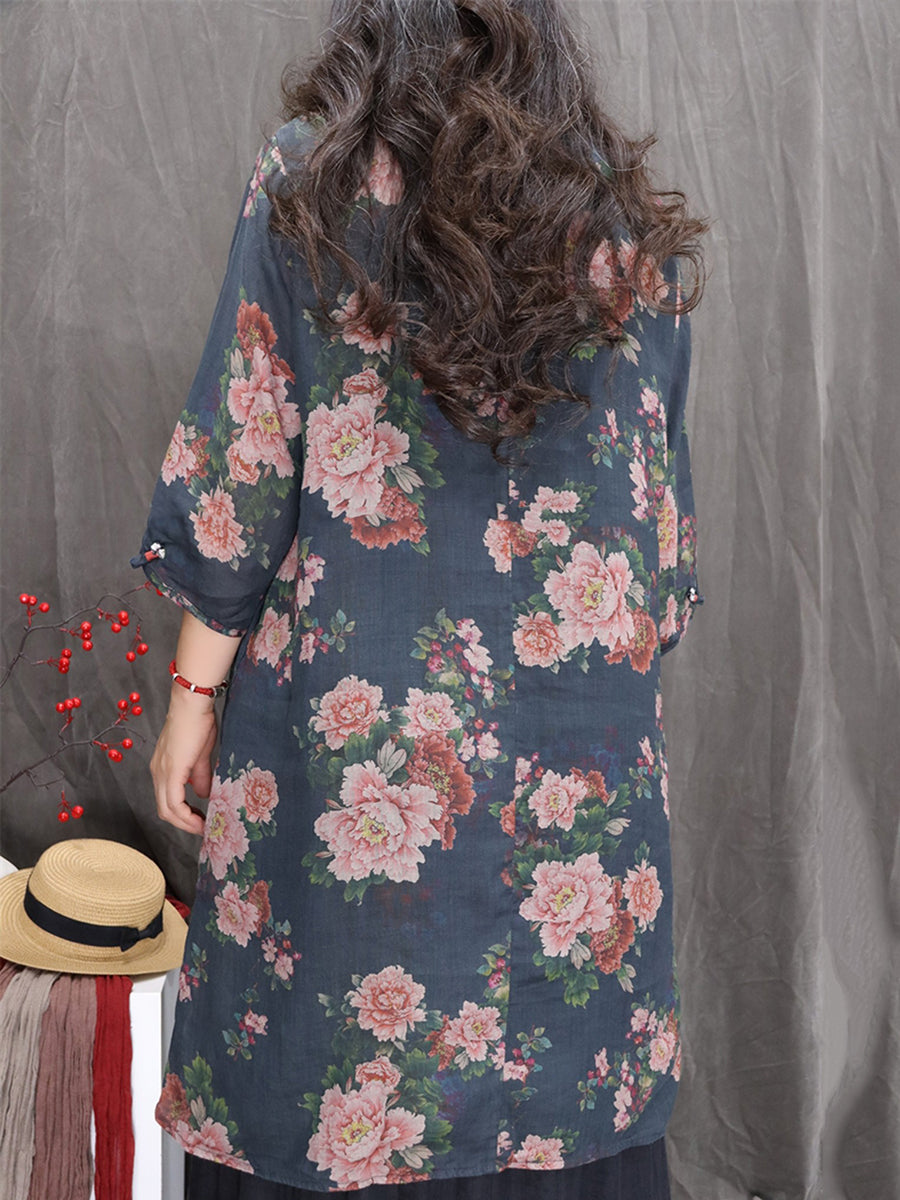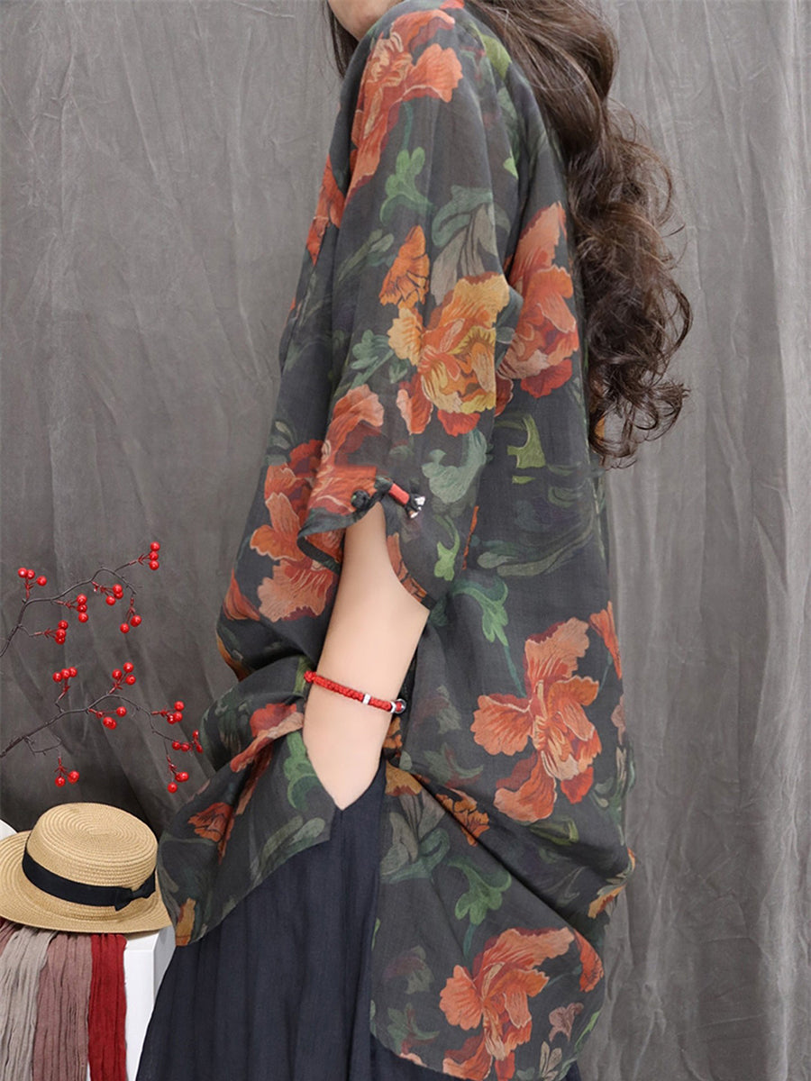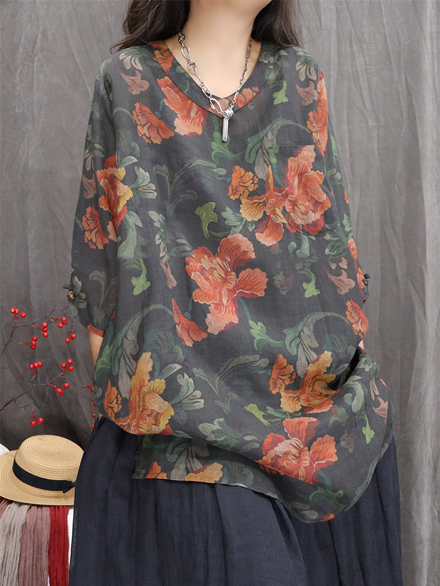 Blusa feminina artística com estampa floral de primavera, decote em V, 100% rami.
