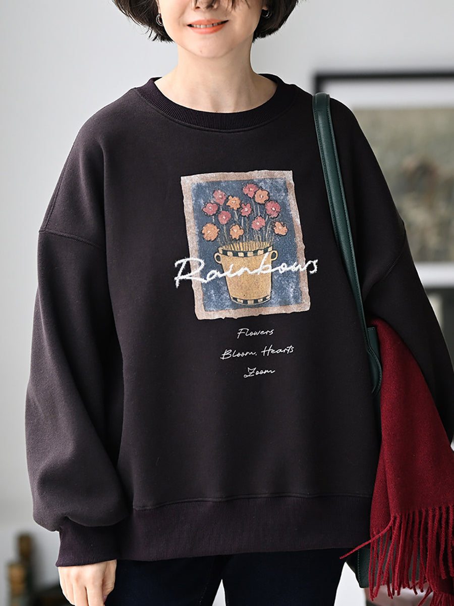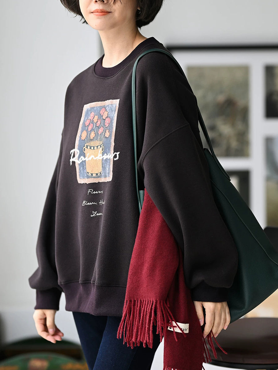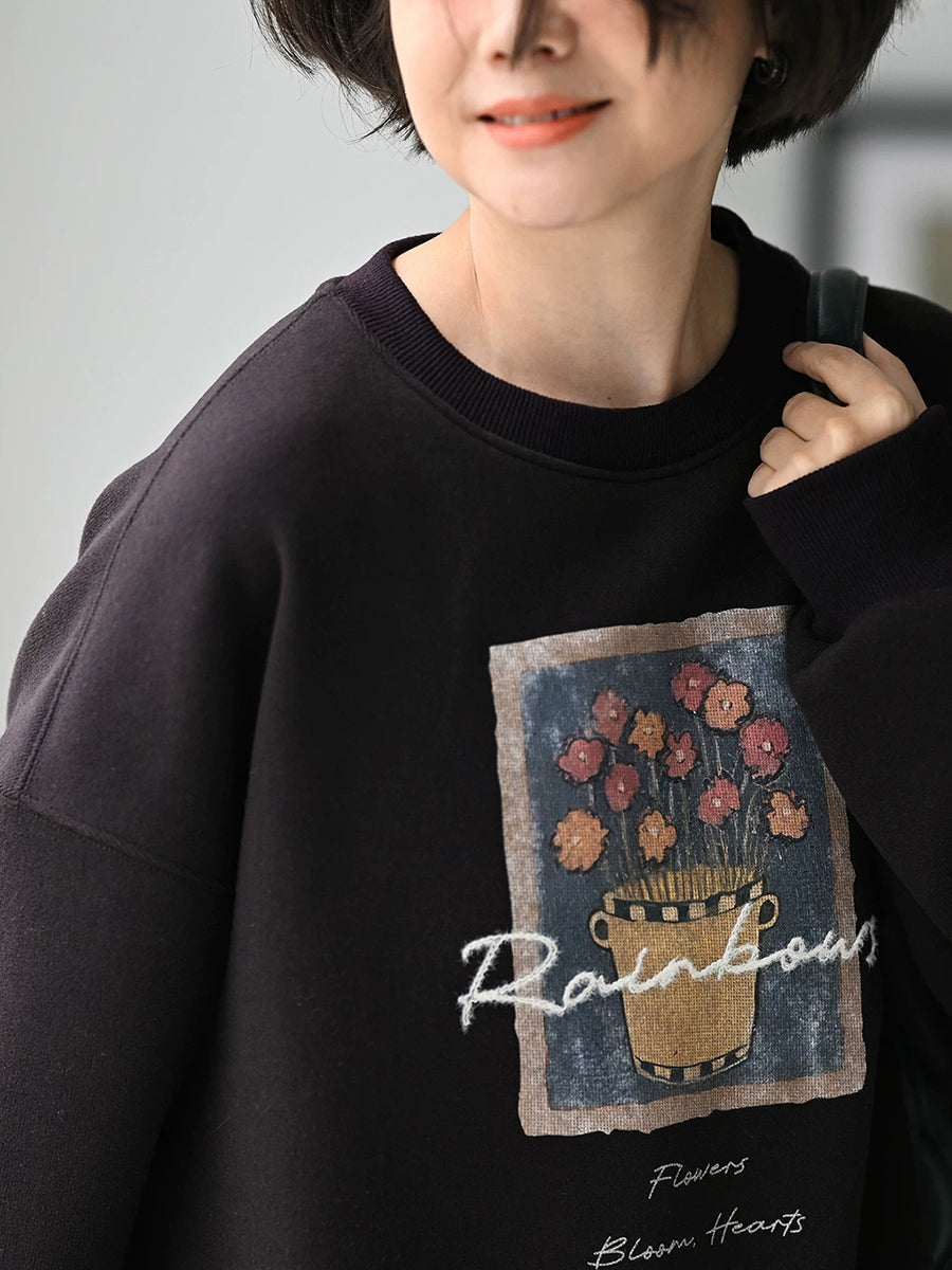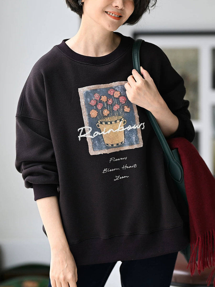 Blusa feminina artística com estampa de primavera e decote redondo.