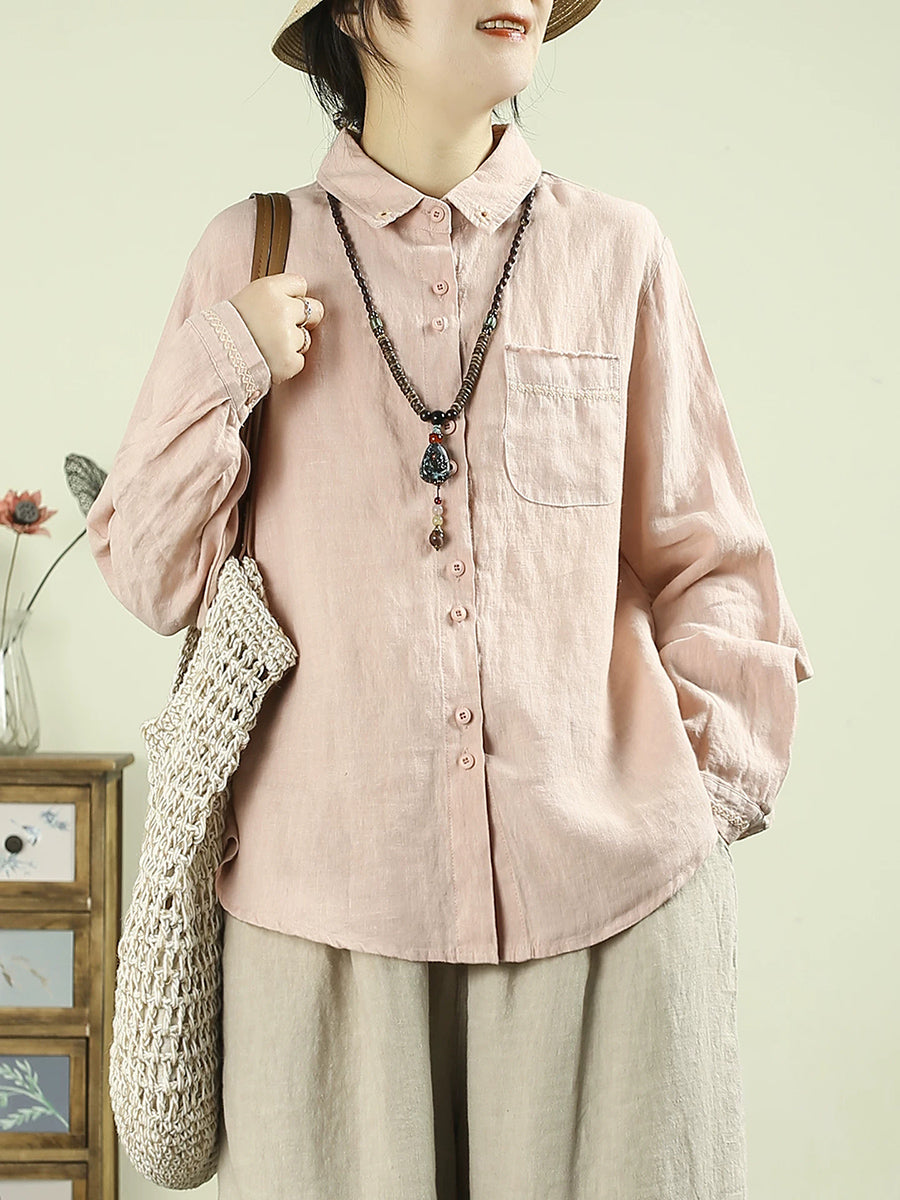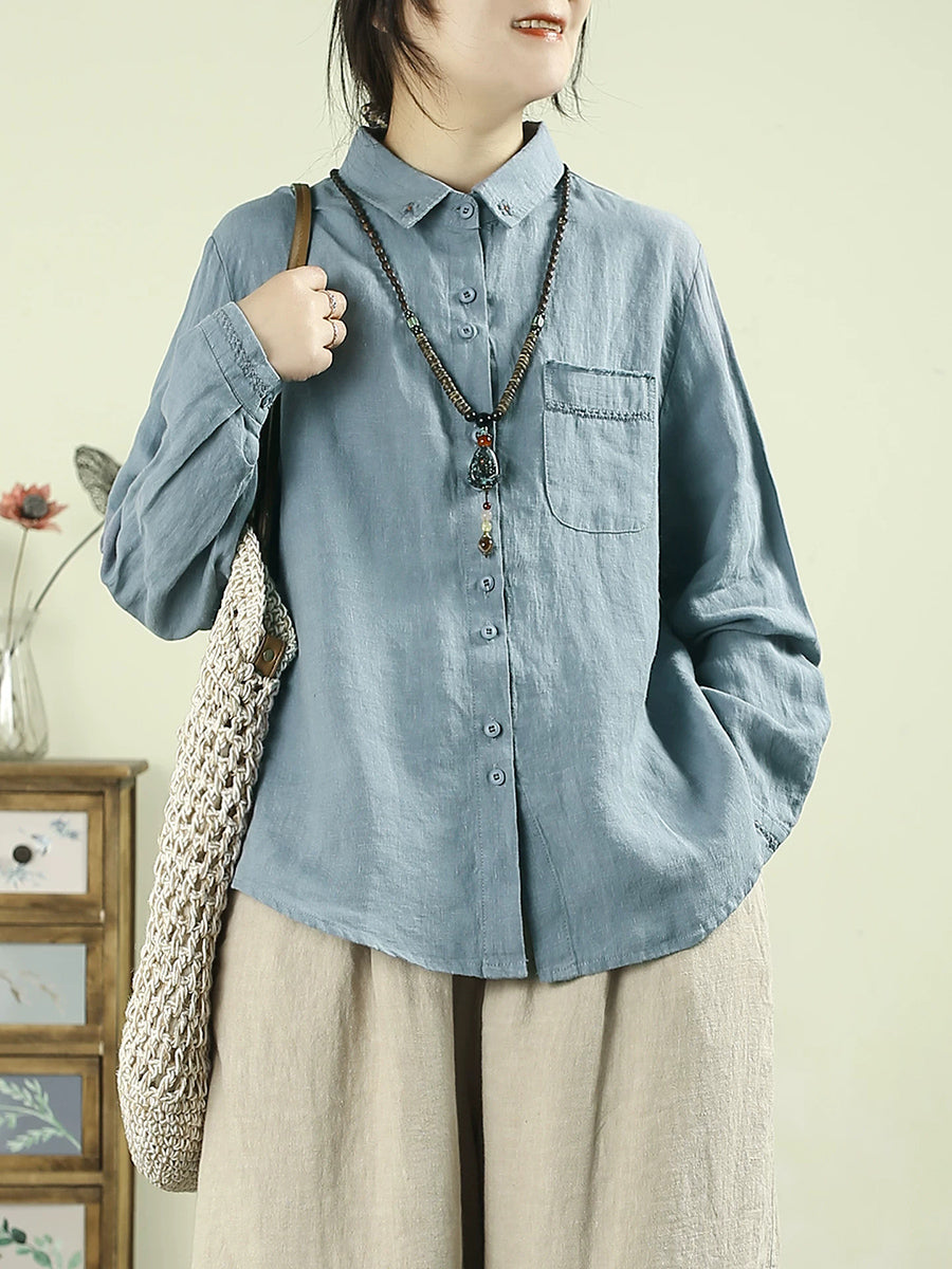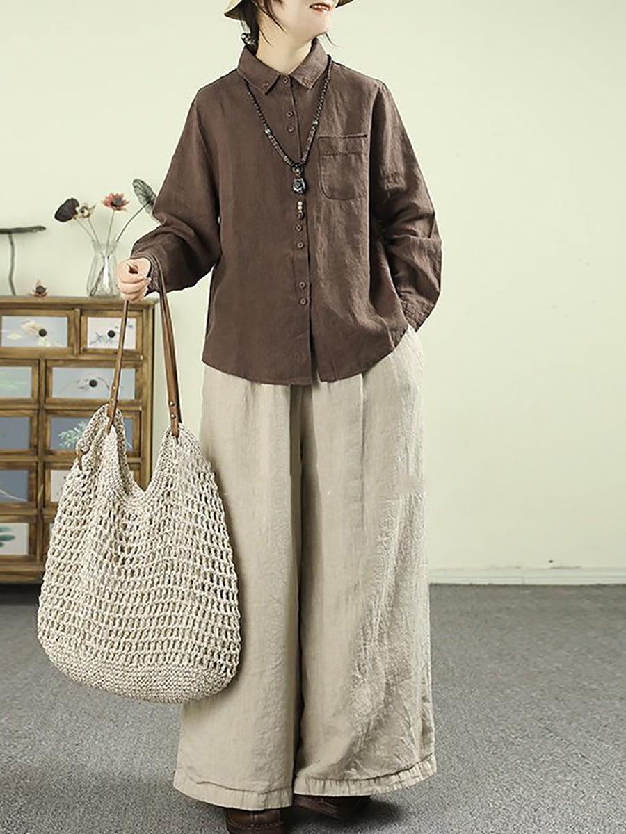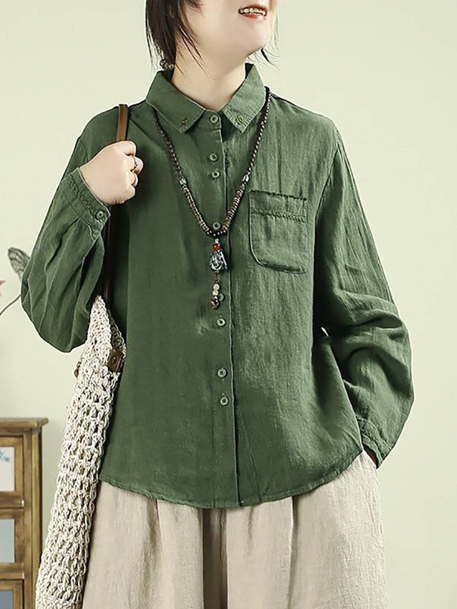 Camisa feminina Artsy Spring de cor pura, 100% linho, com gola dobrável.