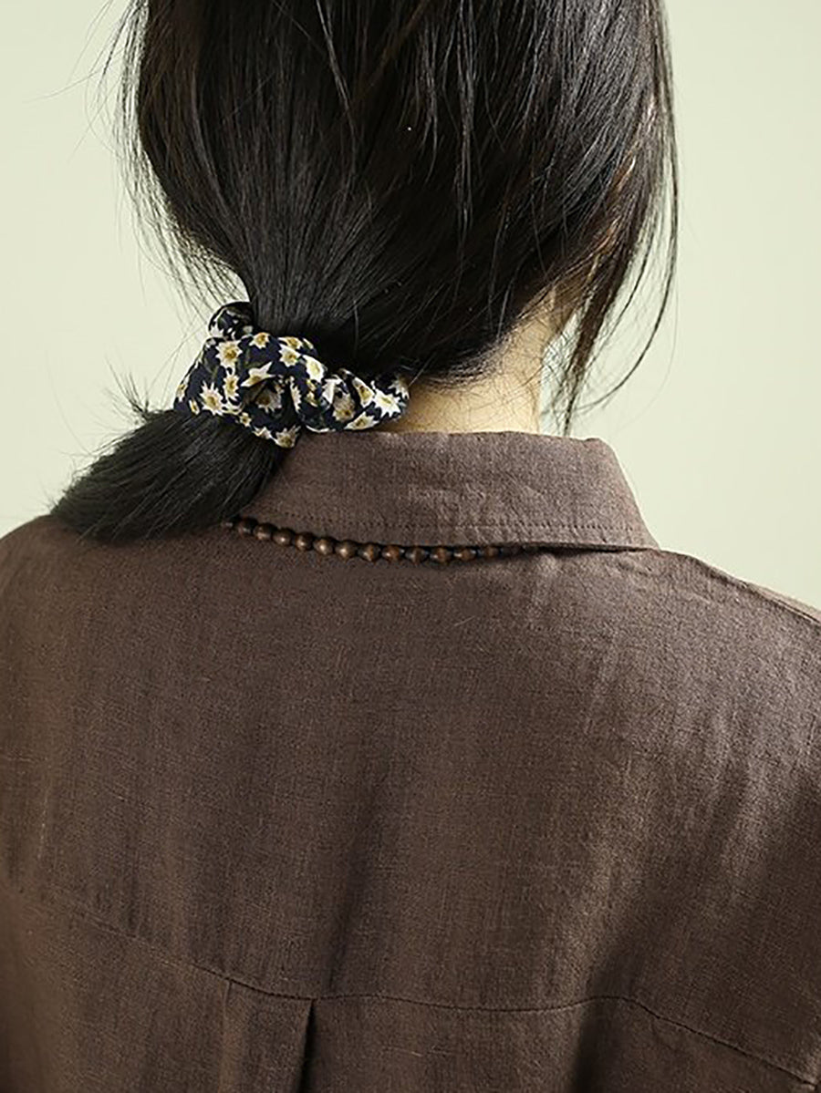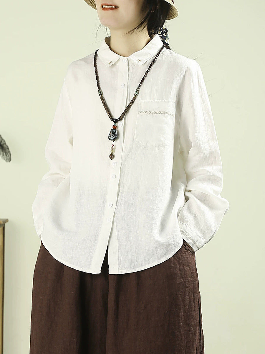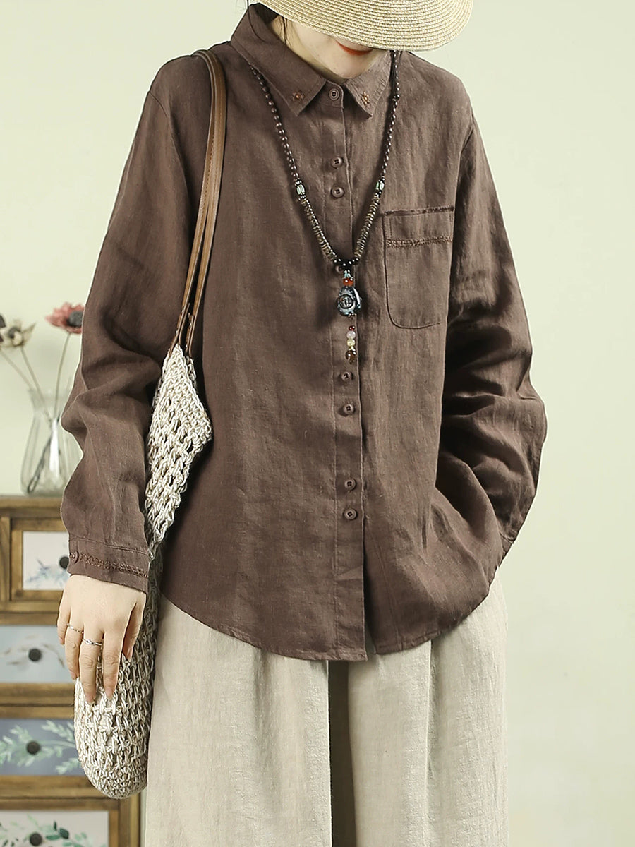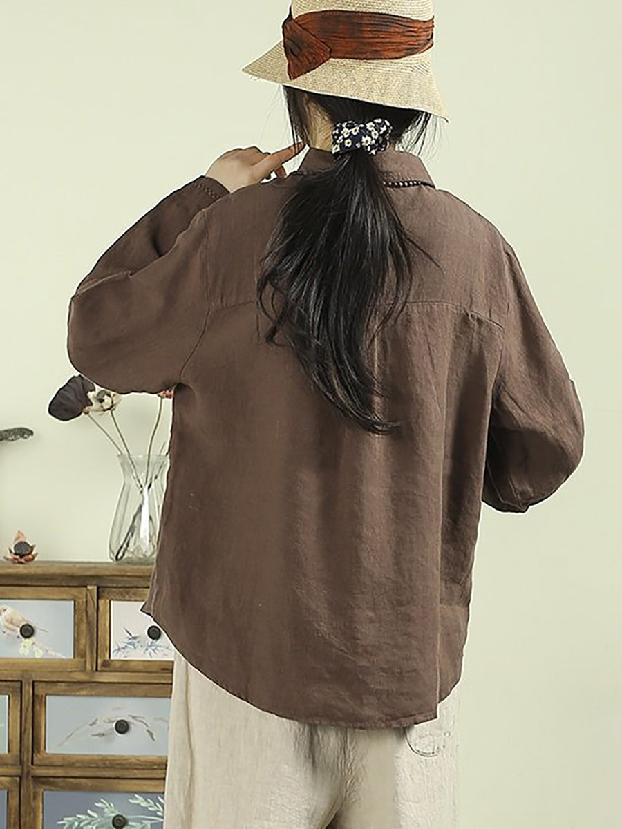 Camisa feminina Artsy Spring de cor pura, 100% linho, com gola dobrável.