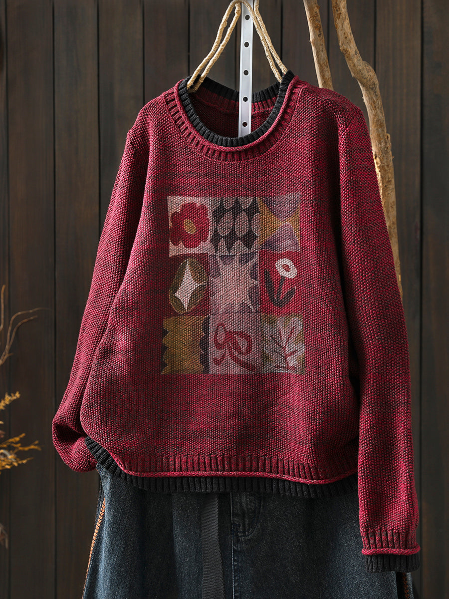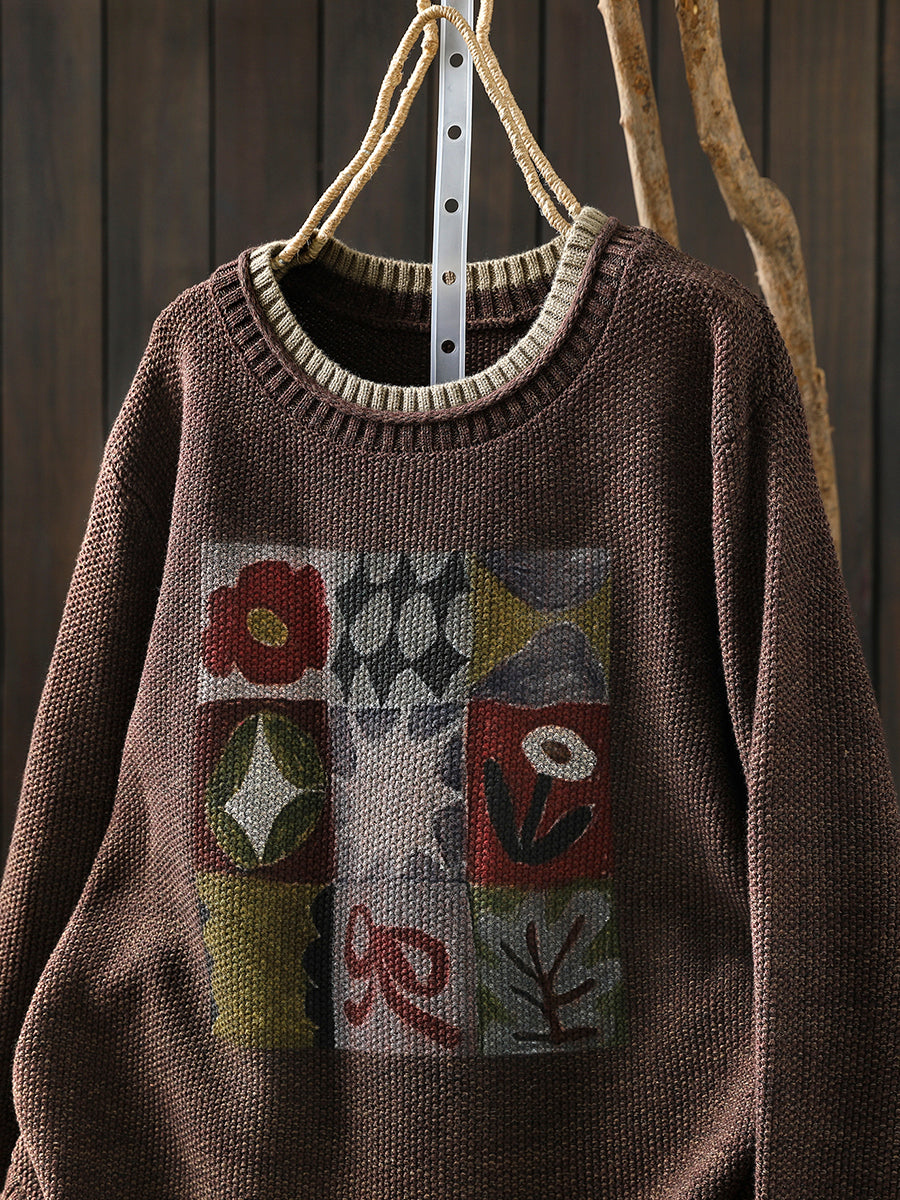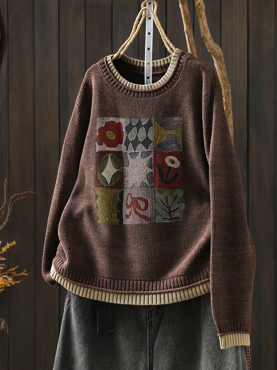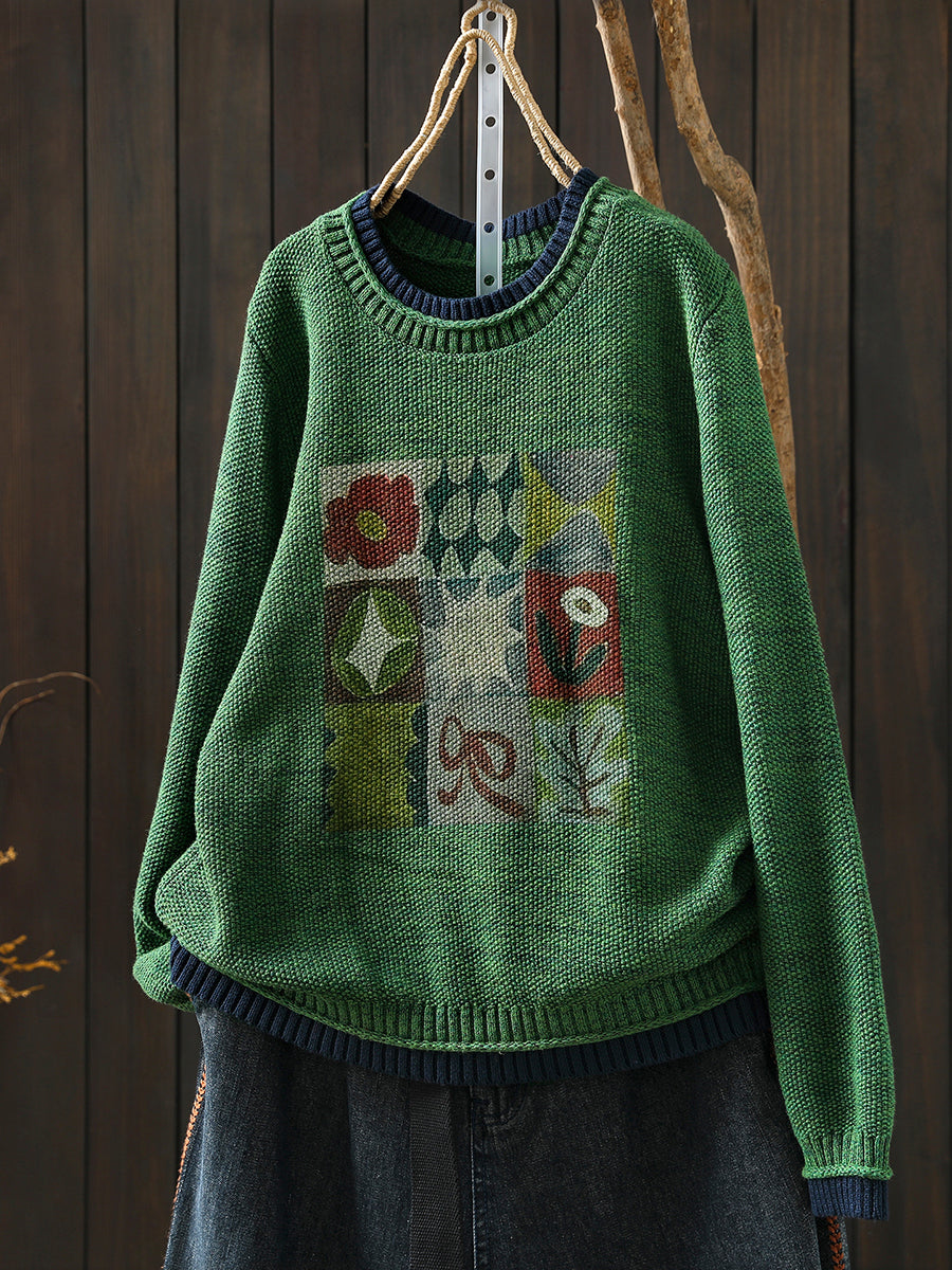 Suéter feminino de tricô com decote redondo e blocos de cores, estilo artístico outonal.