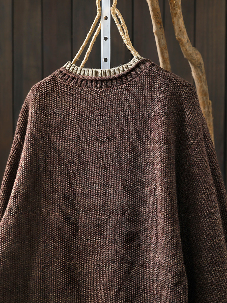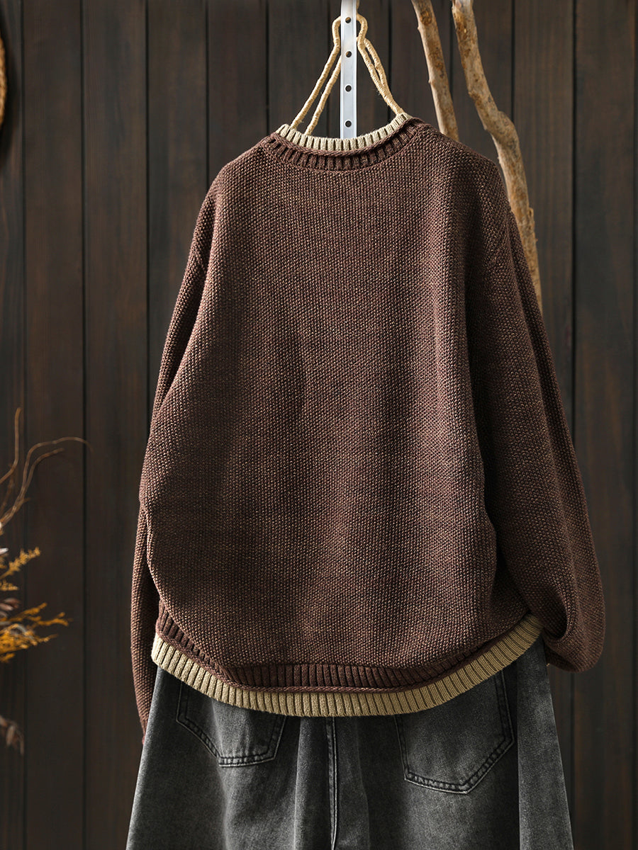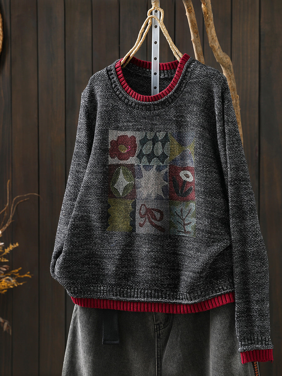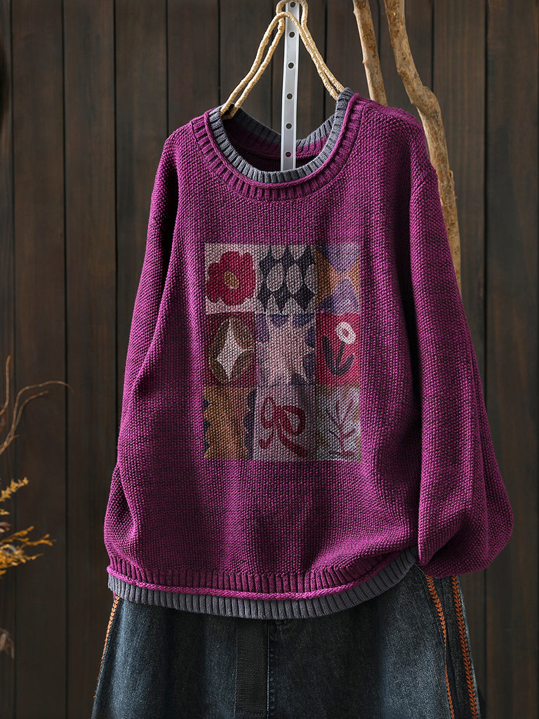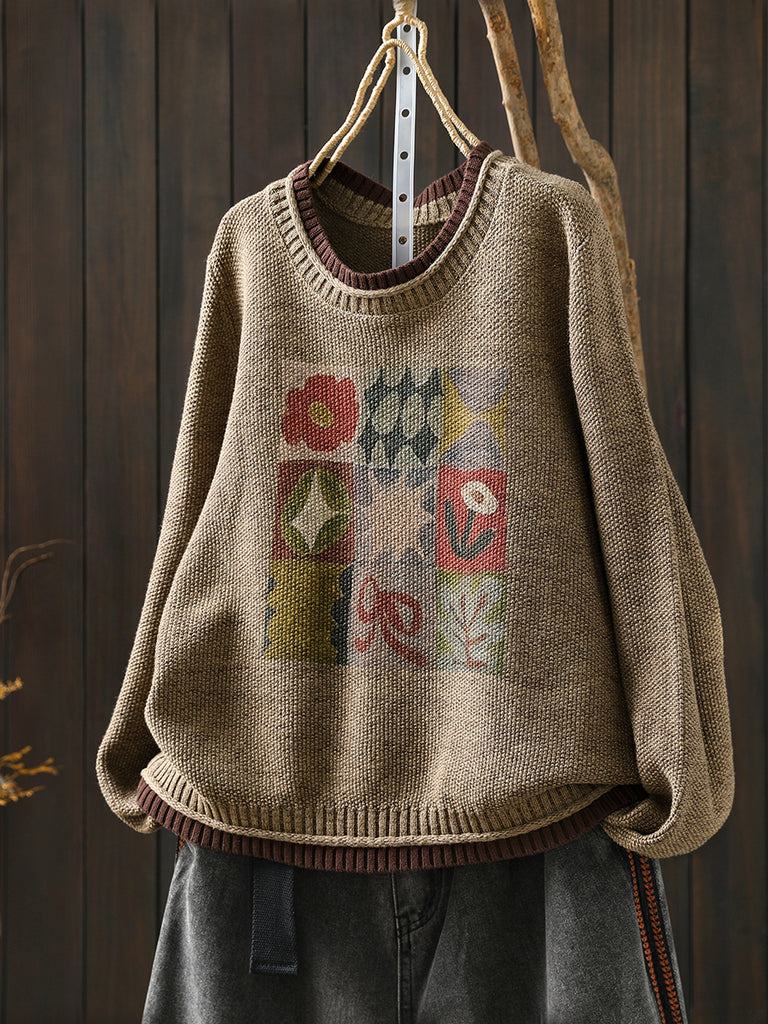 Suéter feminino de tricô com decote redondo e blocos de cores, estilo artístico outonal.