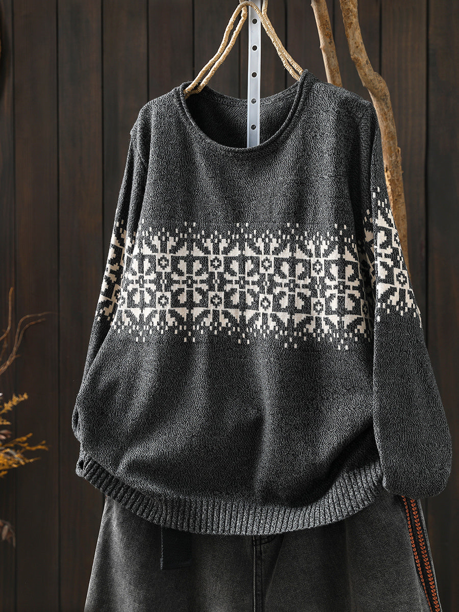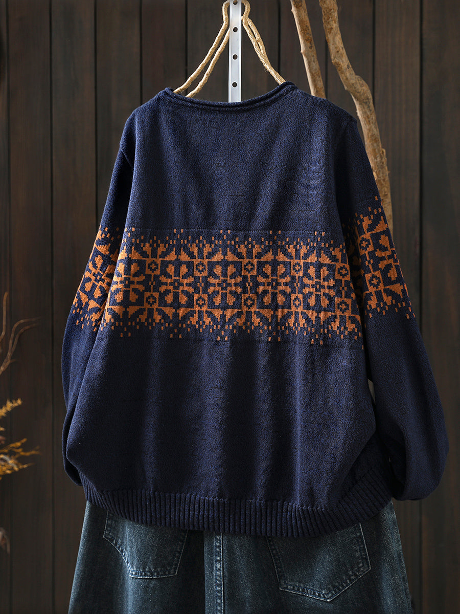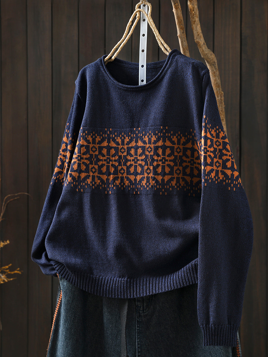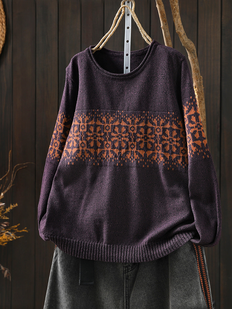 Suéter feminino de tricô com estampa floral artística de outono e gola redonda.