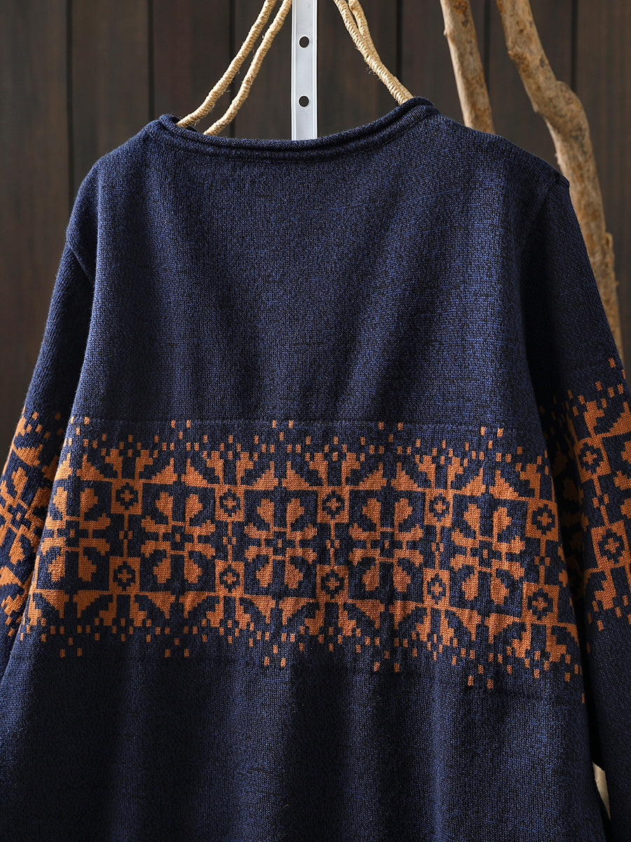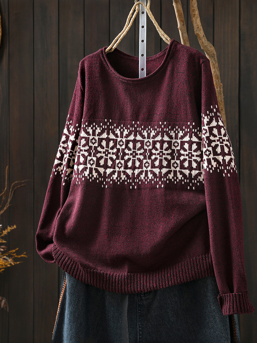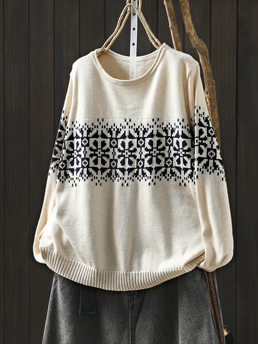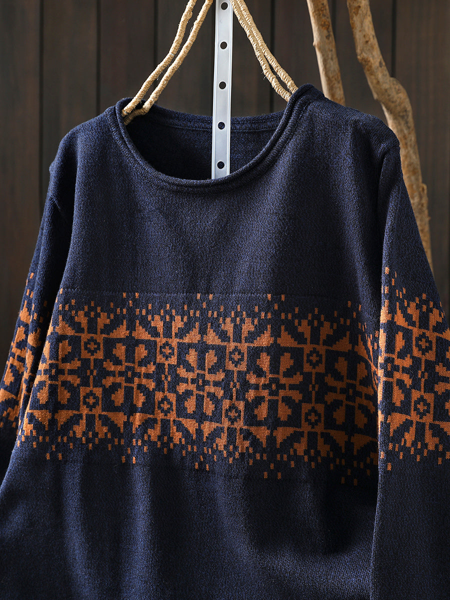 Suéter feminino de tricô com estampa floral artística de outono e gola redonda.