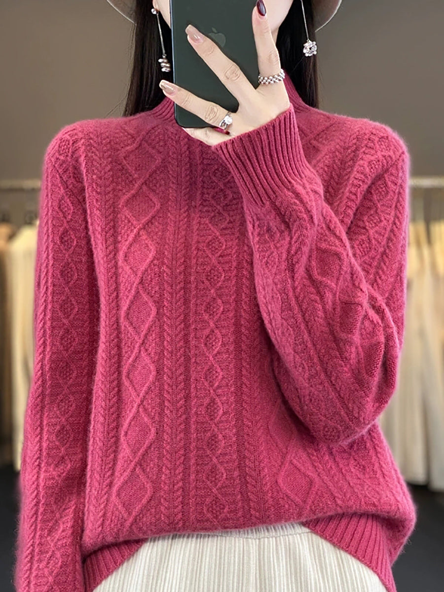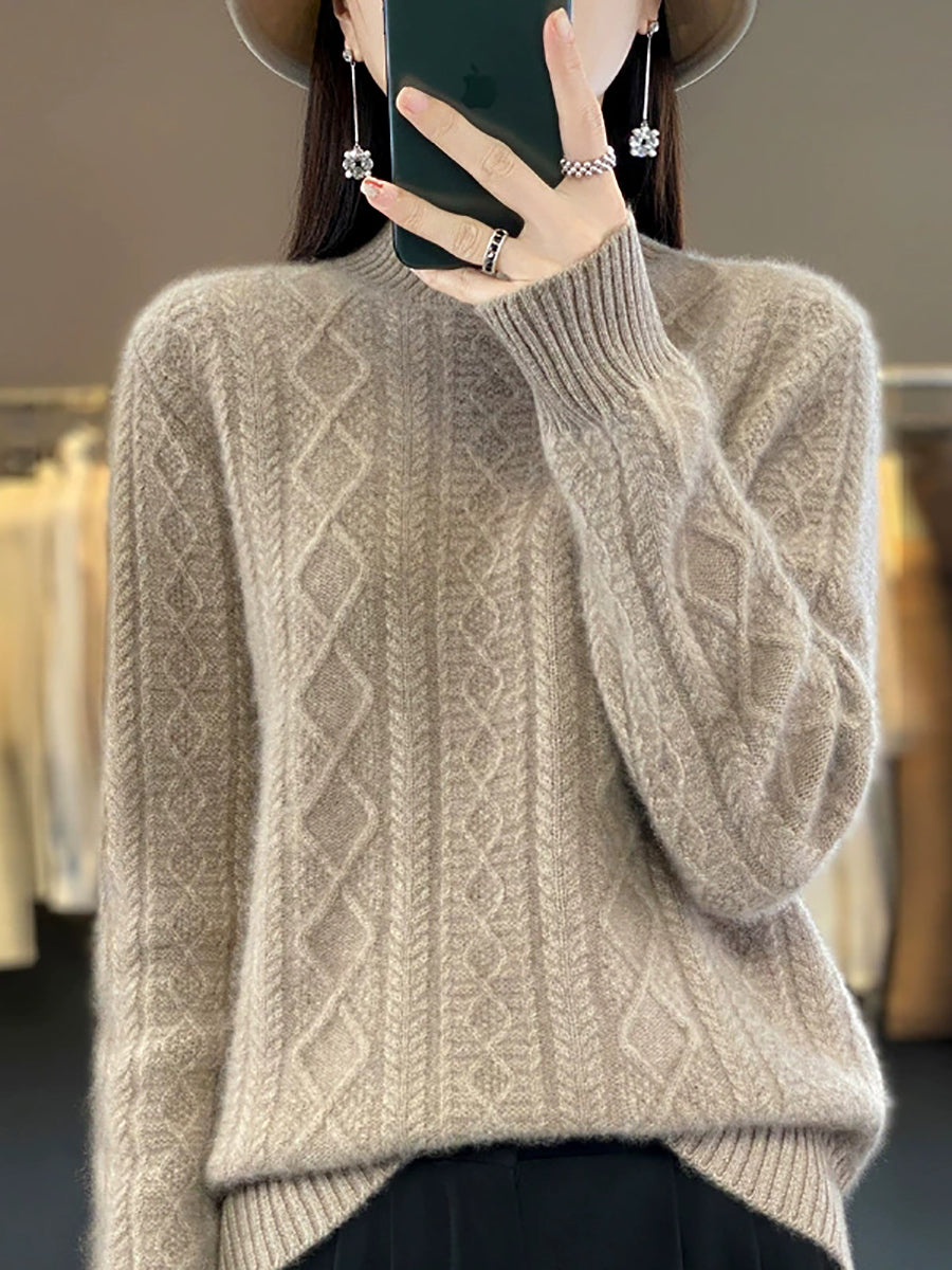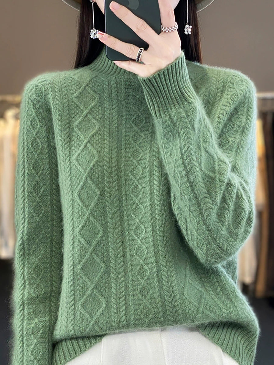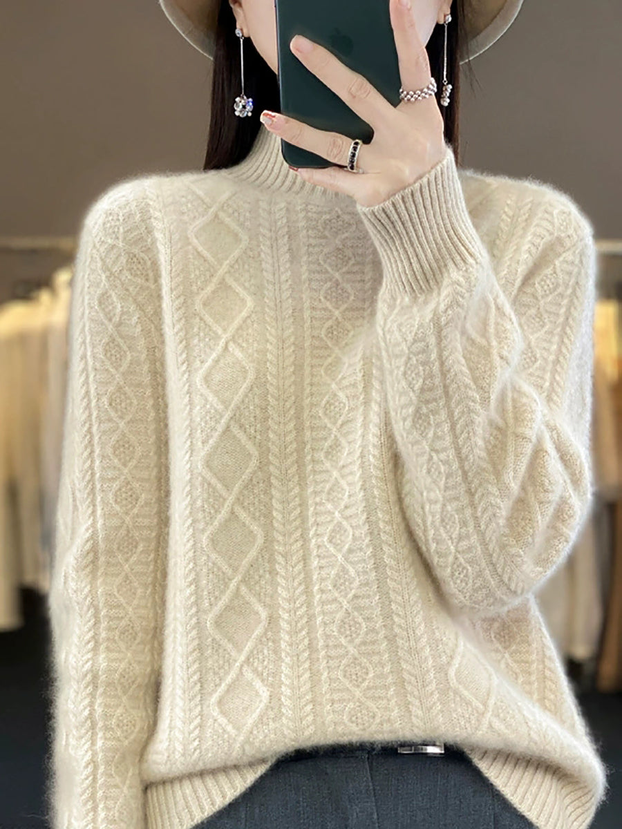Suéter feminino de gola alta em lã jacquard com estampa artística para o outono.