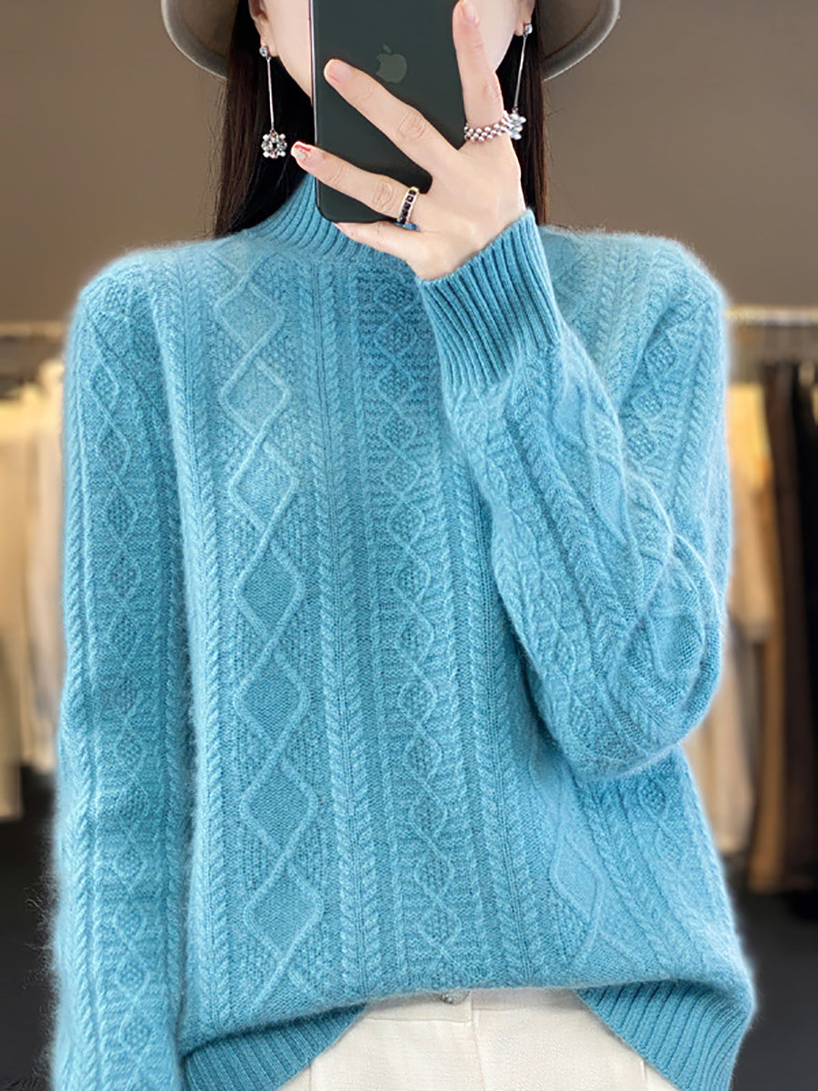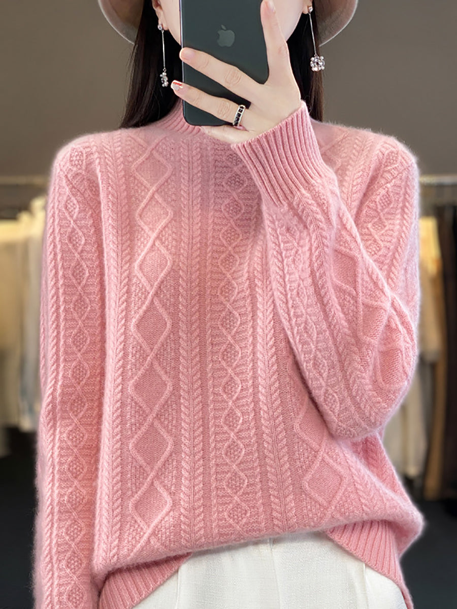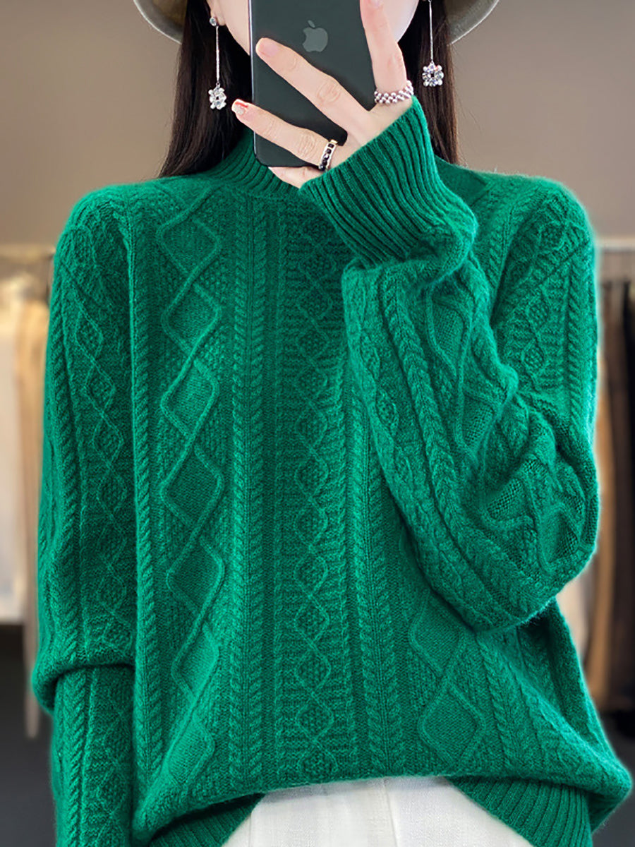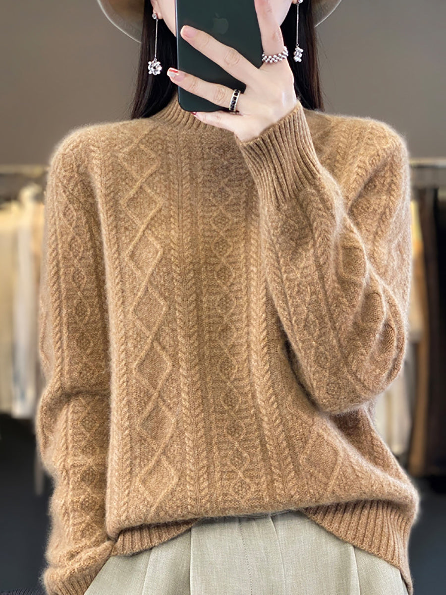 Suéter feminino de gola alta em lã jacquard com estampa artística para o outono.