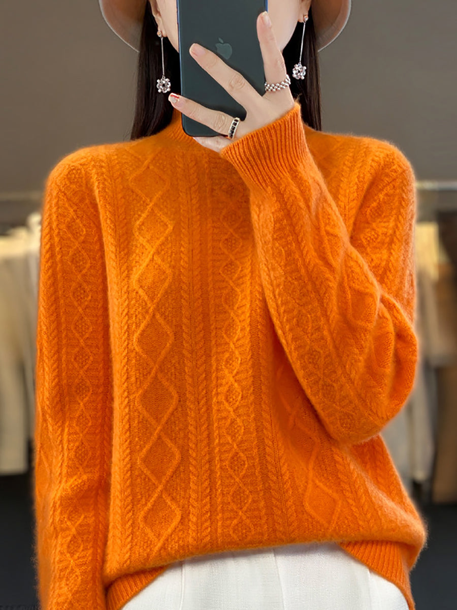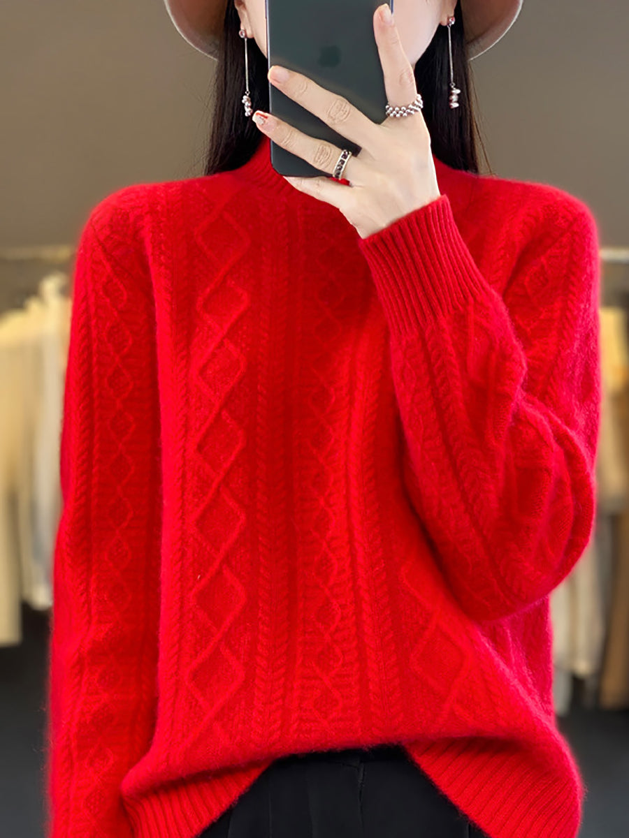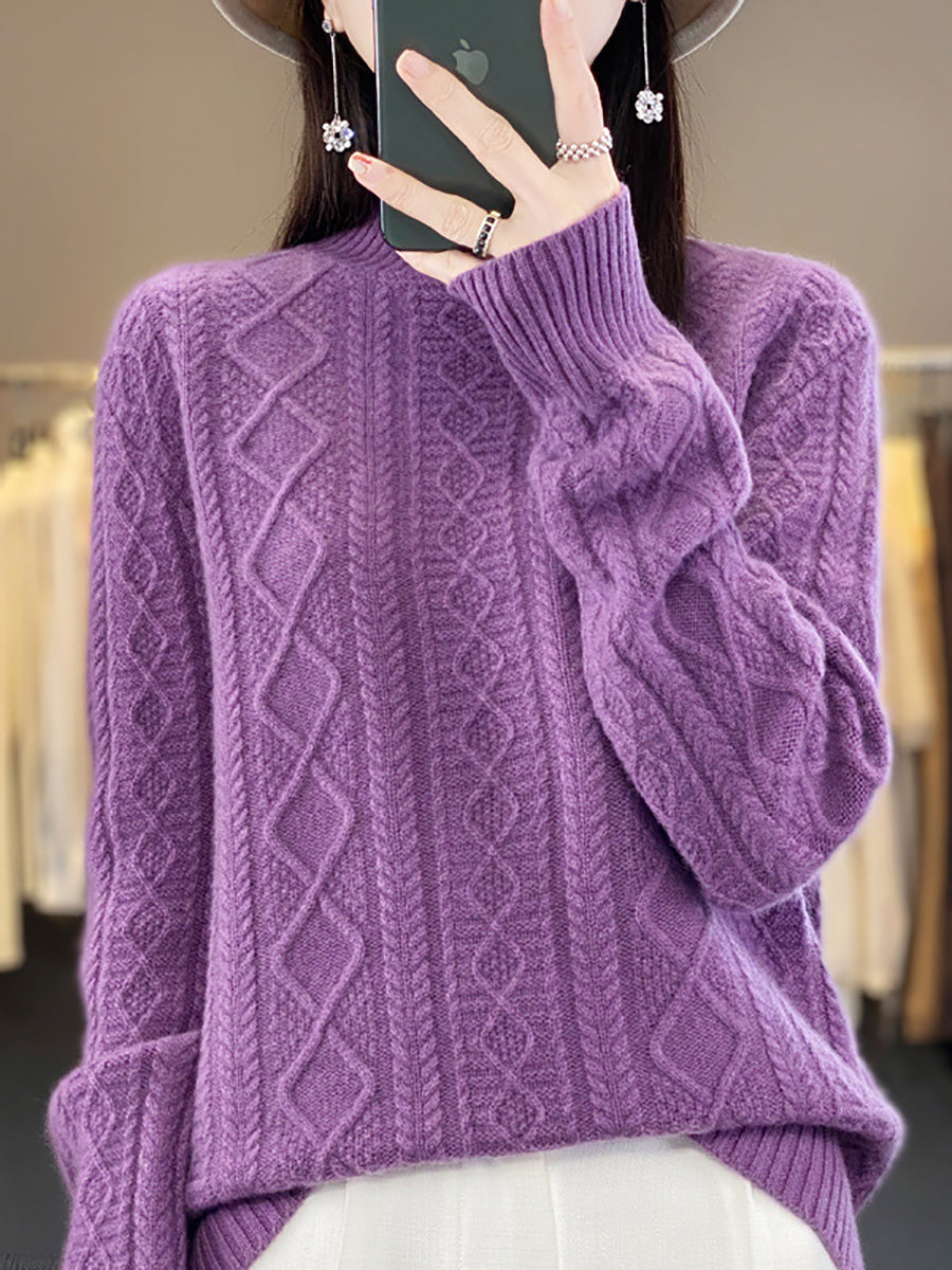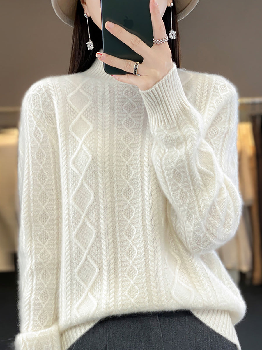 Suéter feminino de gola alta em lã jacquard com estampa artística para o outono.