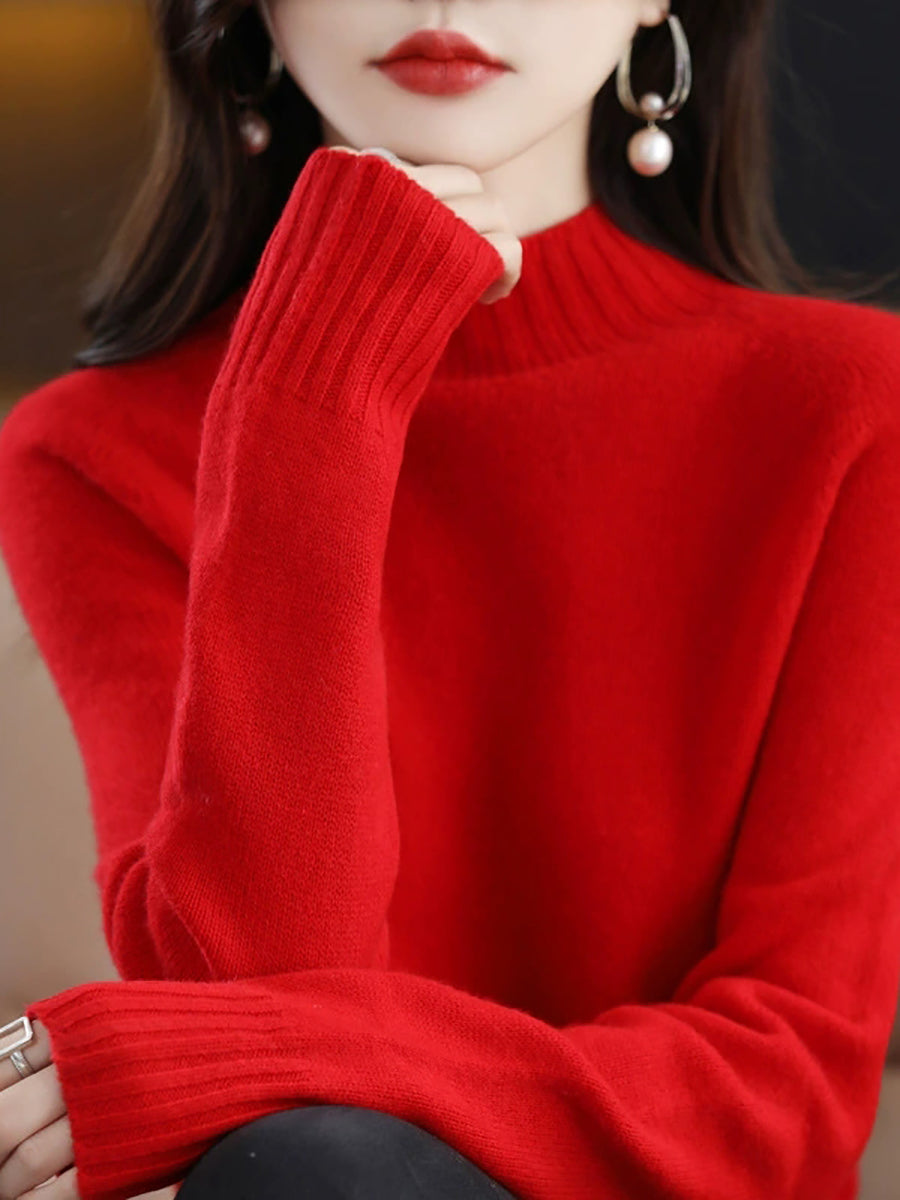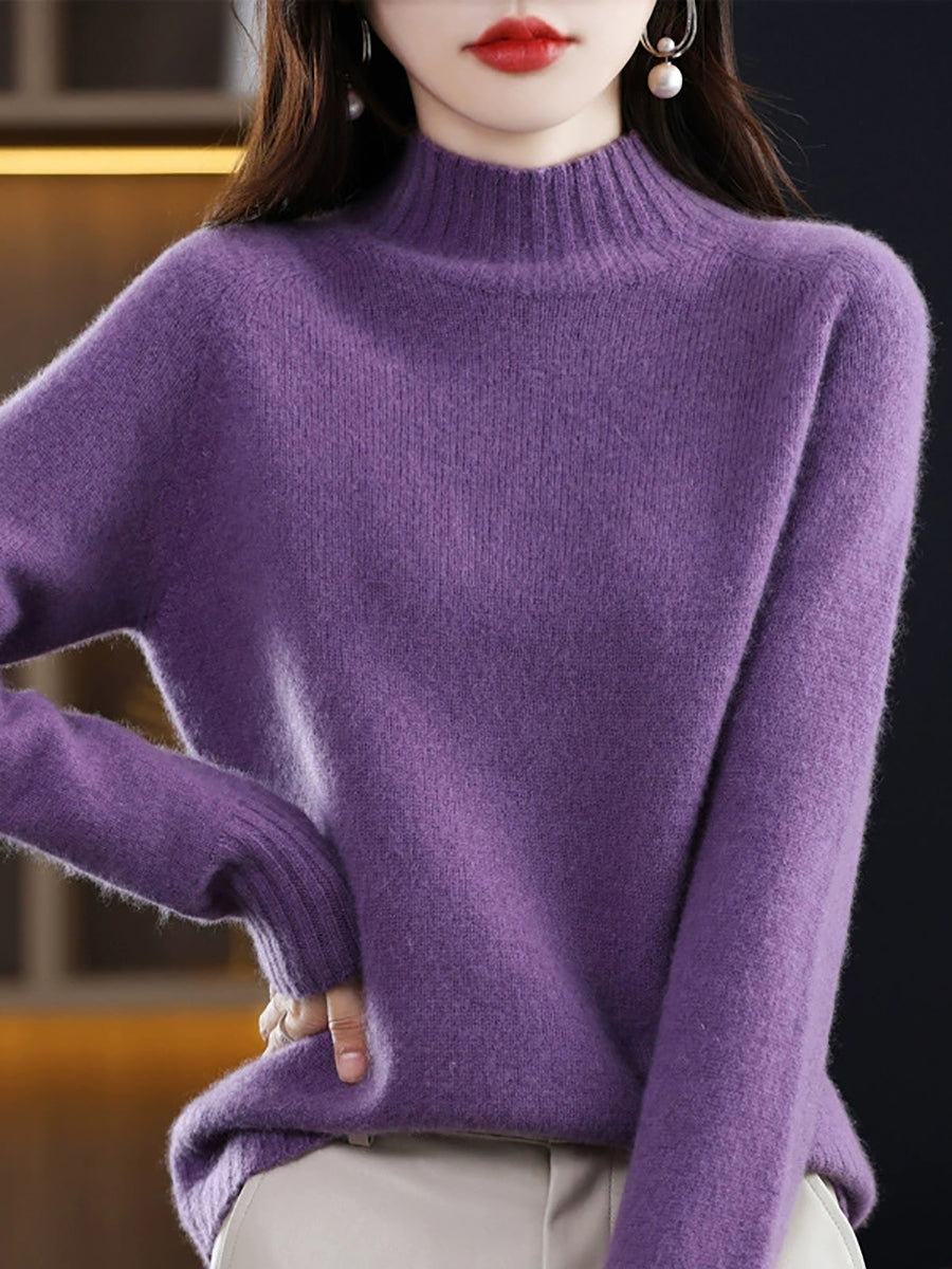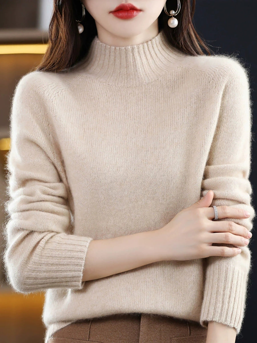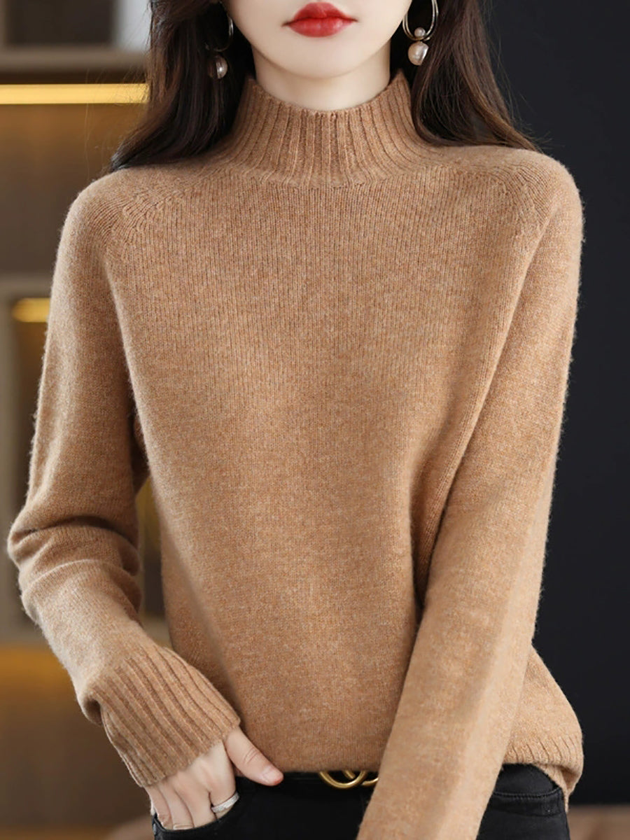 Suéter feminino de gola alta curta em tricô, cor lisa, estilo artístico outonal.