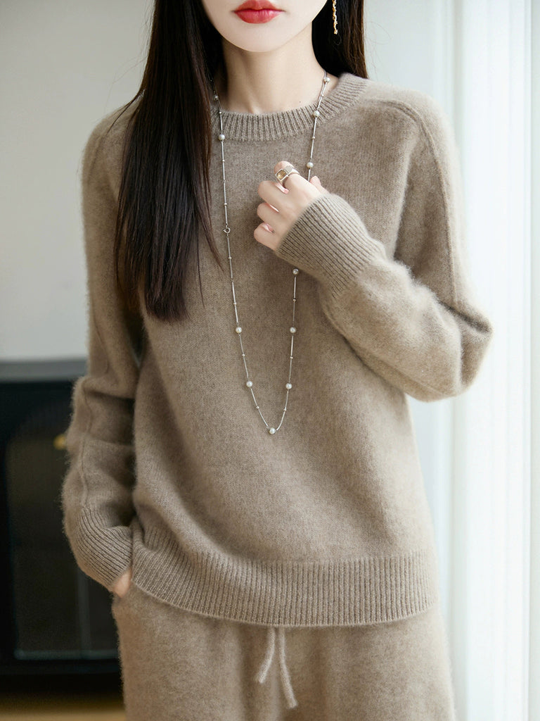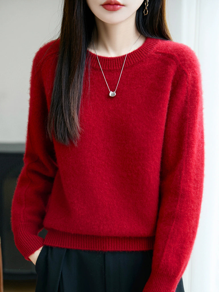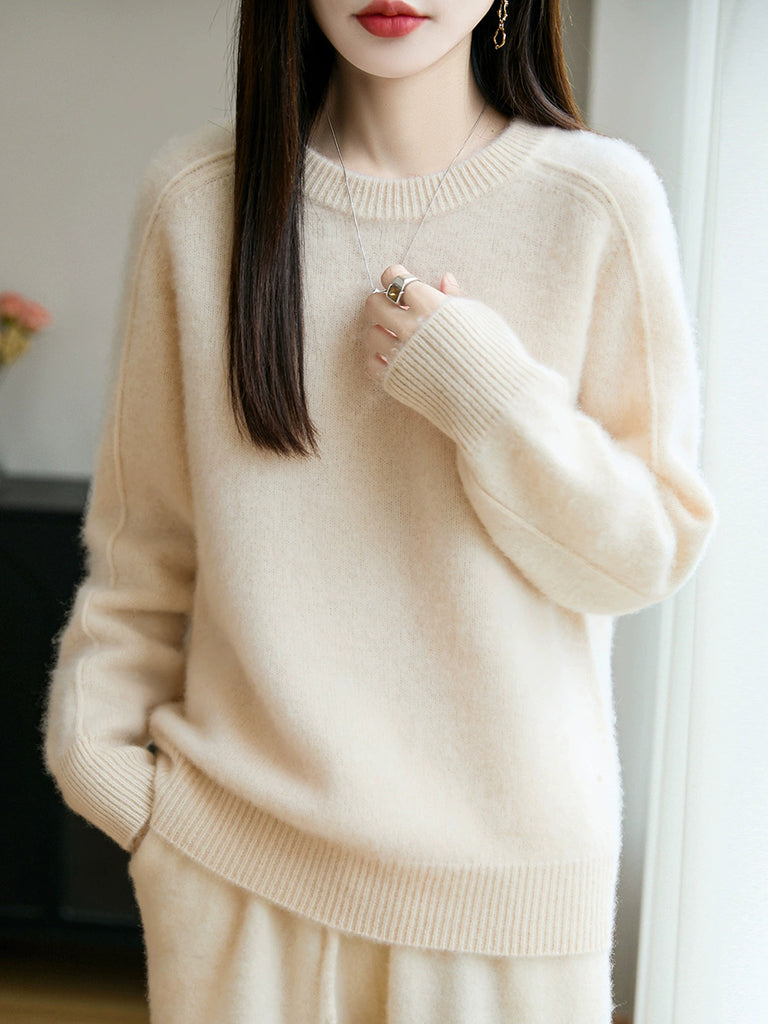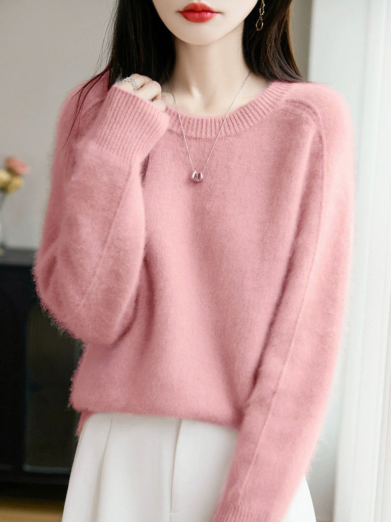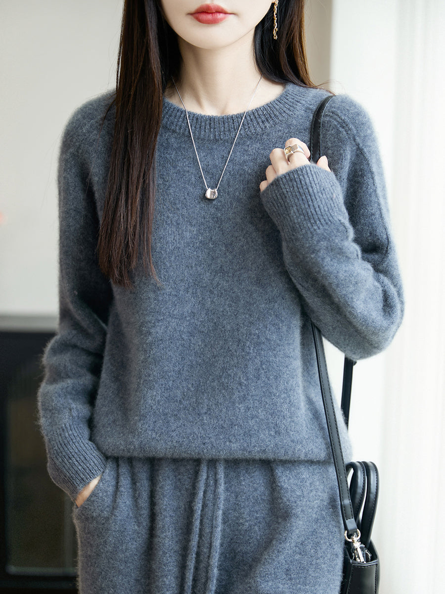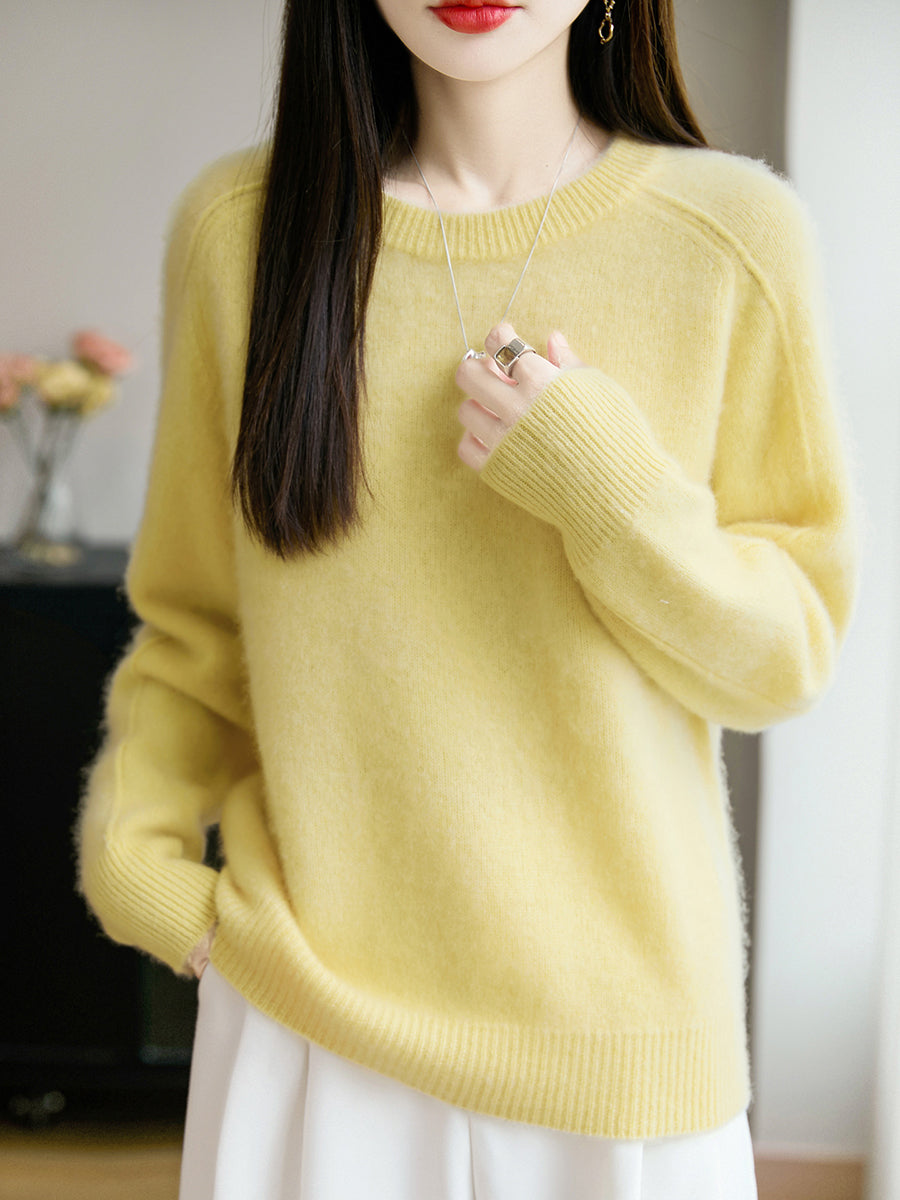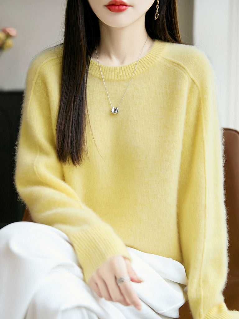 Suéter feminino de gola redonda em cores lisas, estilo artístico outonal.