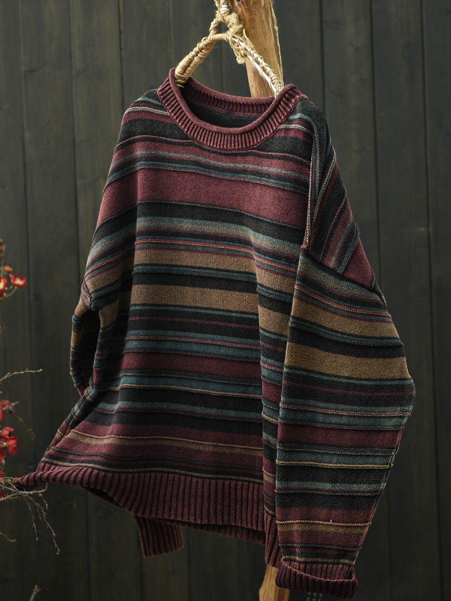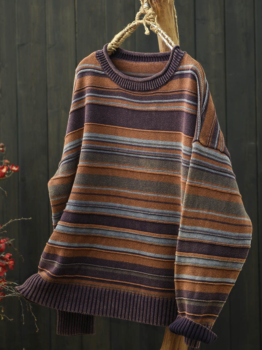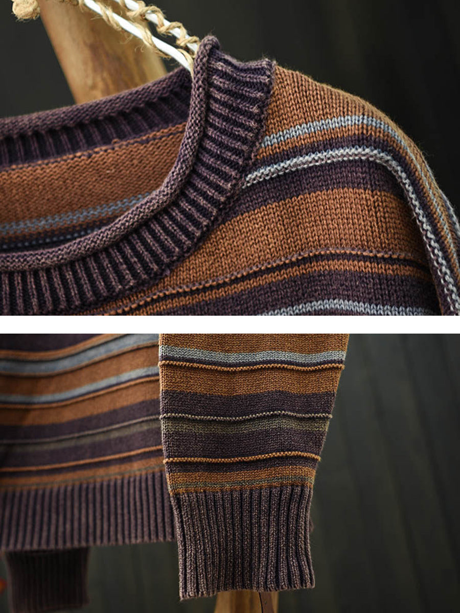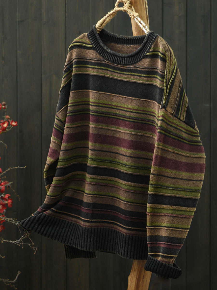 Suéter feminino de tricô com gola redonda e listras artísticas para o outono