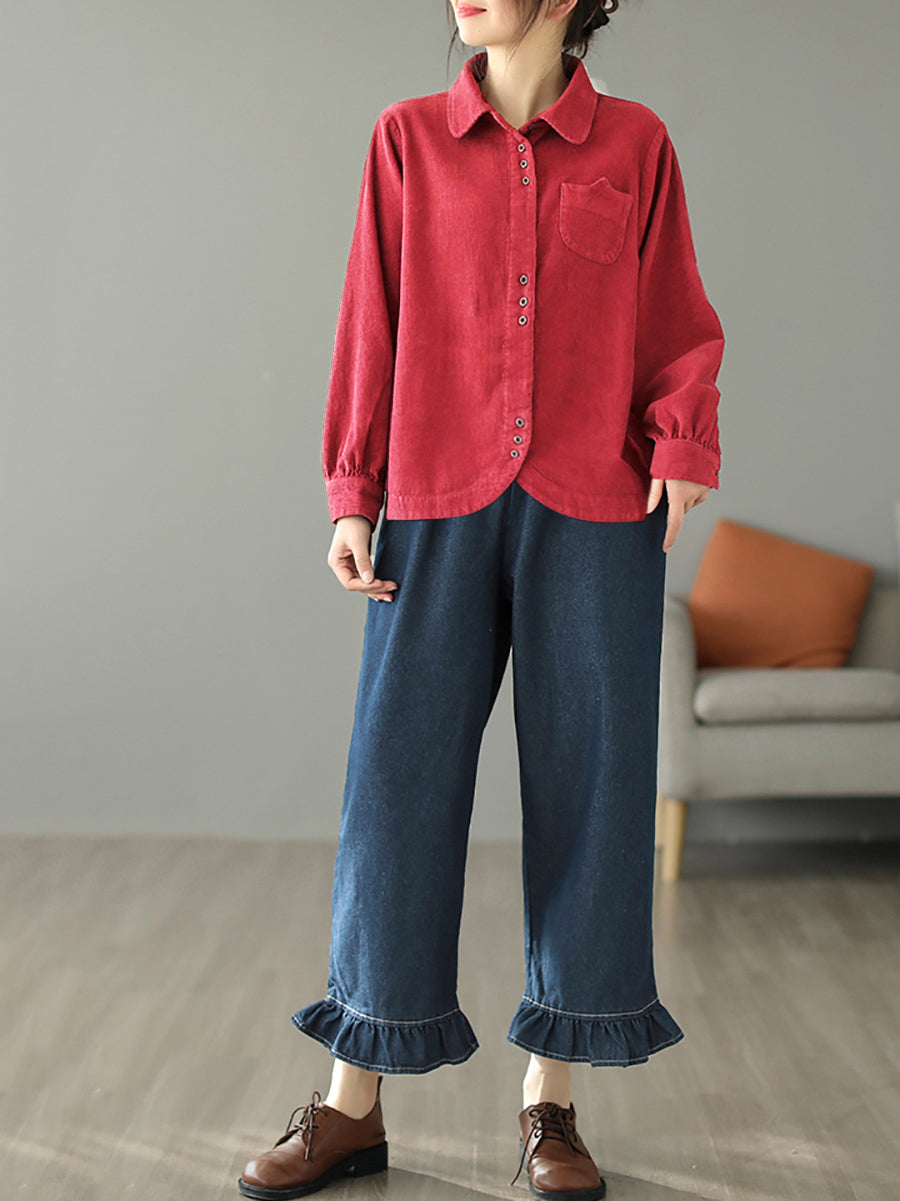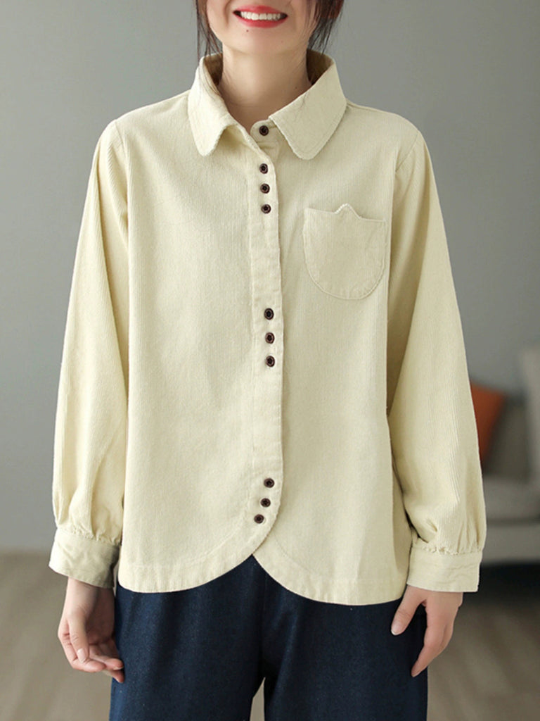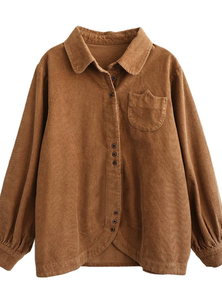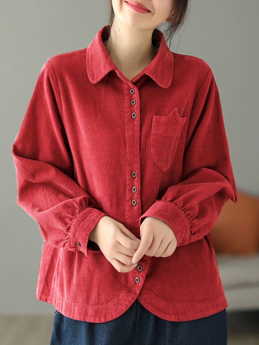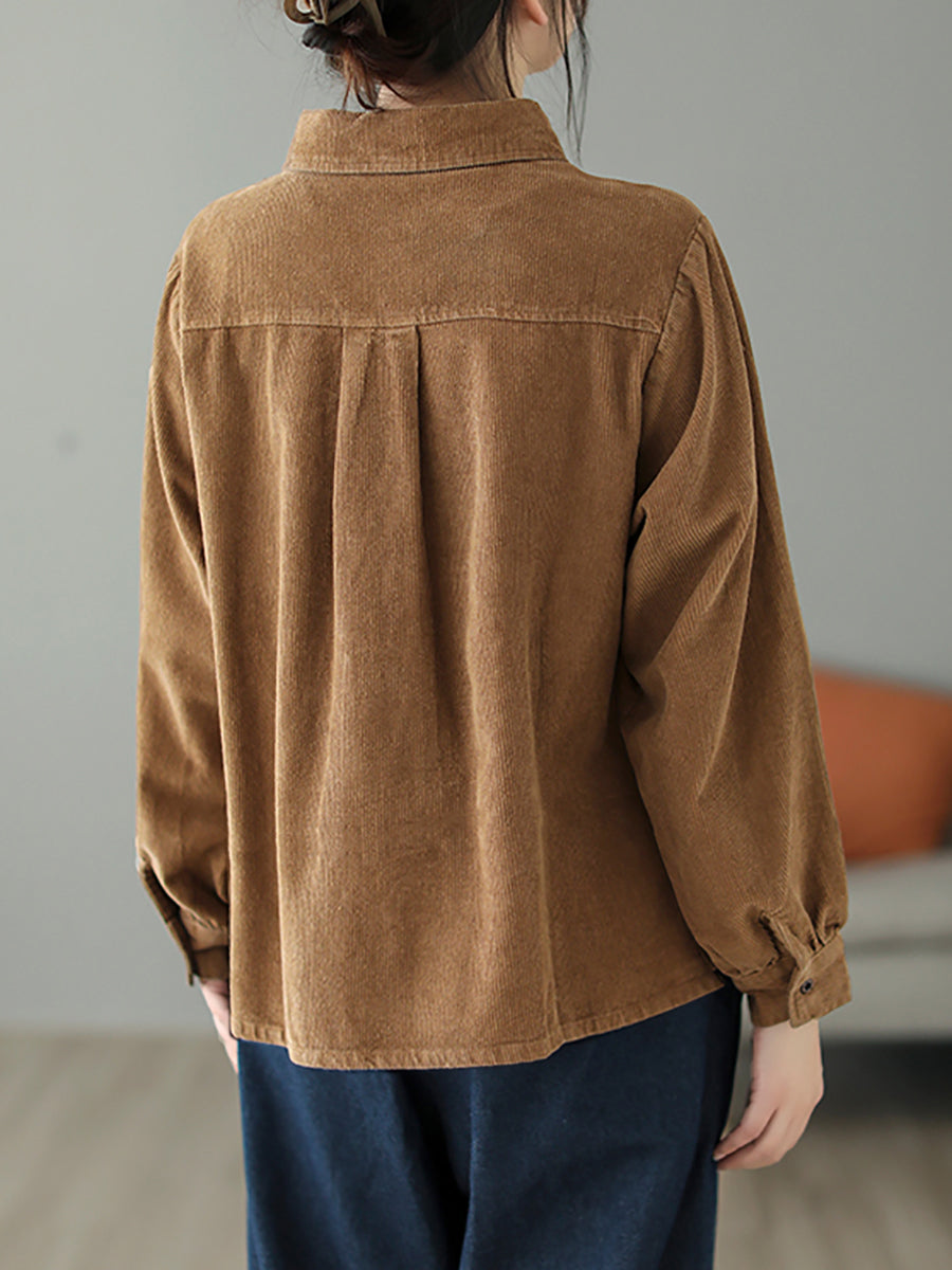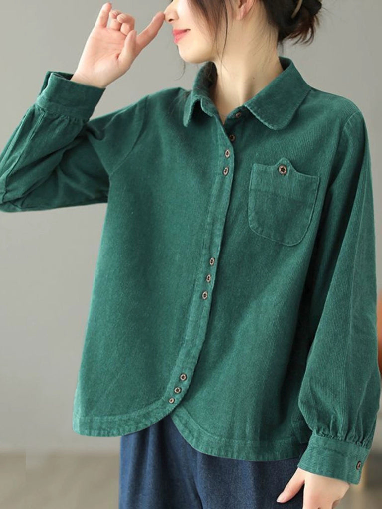 Camisa feminina de veludo cotelê com gola virada para baixo e cor pura de outono