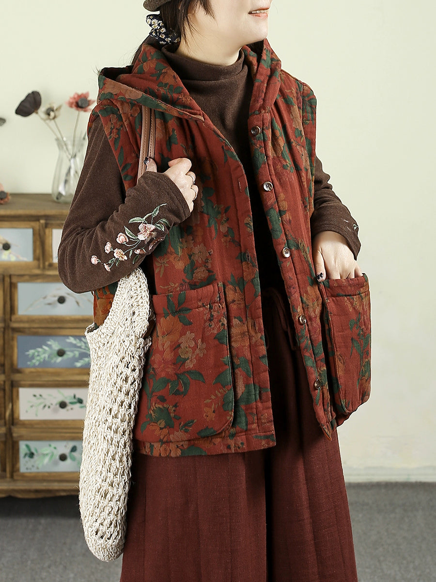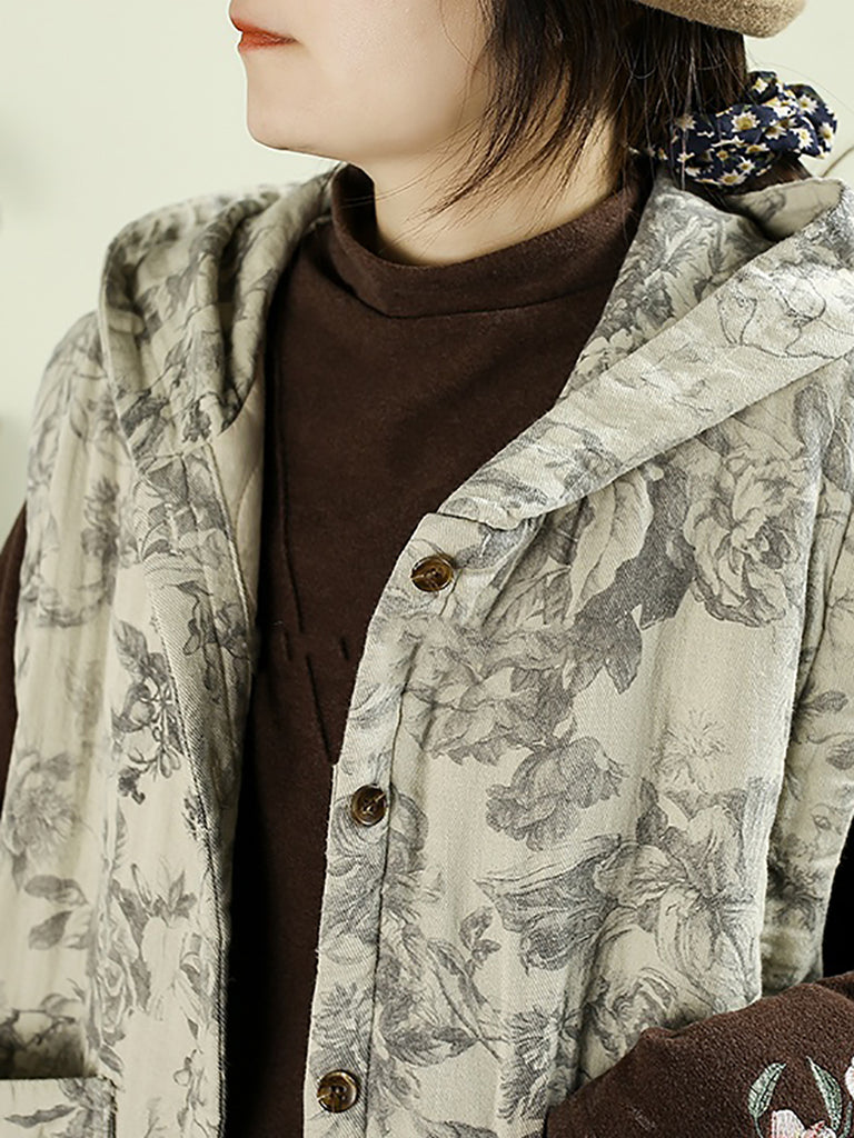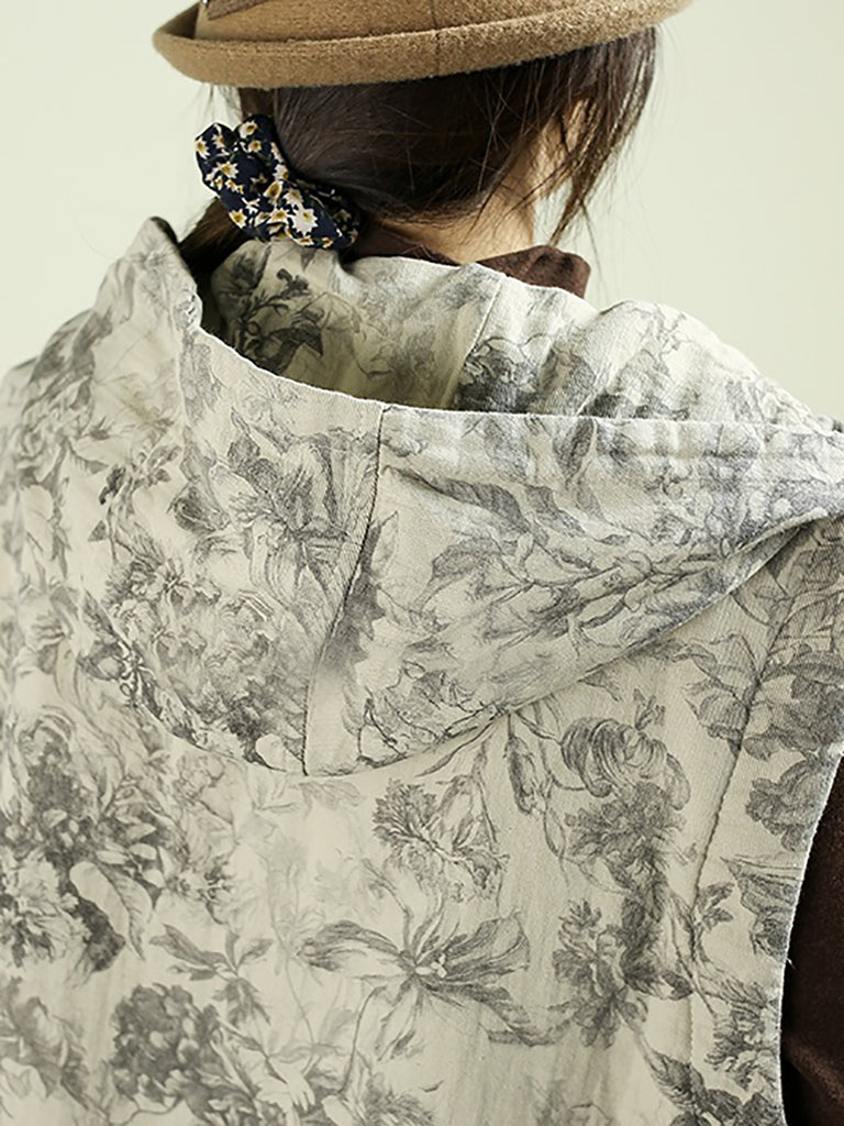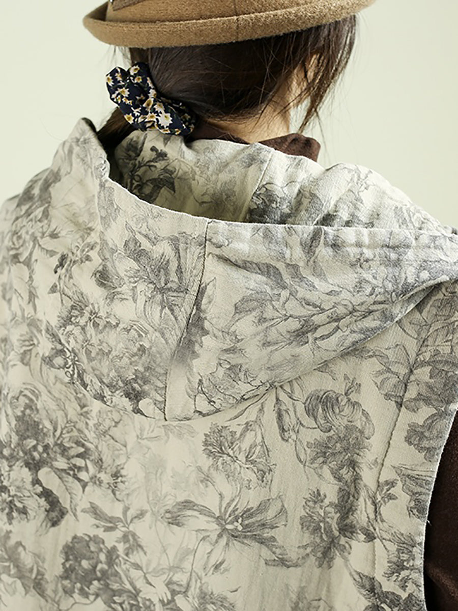 Colete acolchoado com capuz e estampa floral retrô para mulheres, estilo outono.
