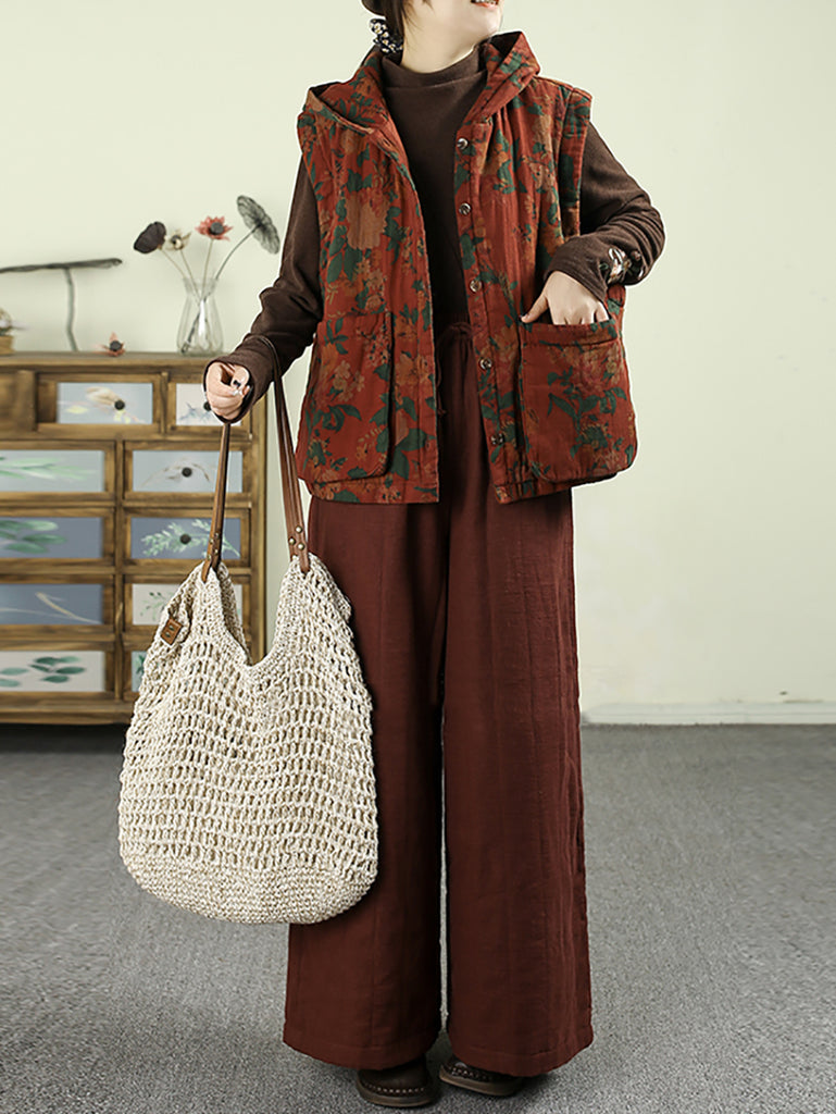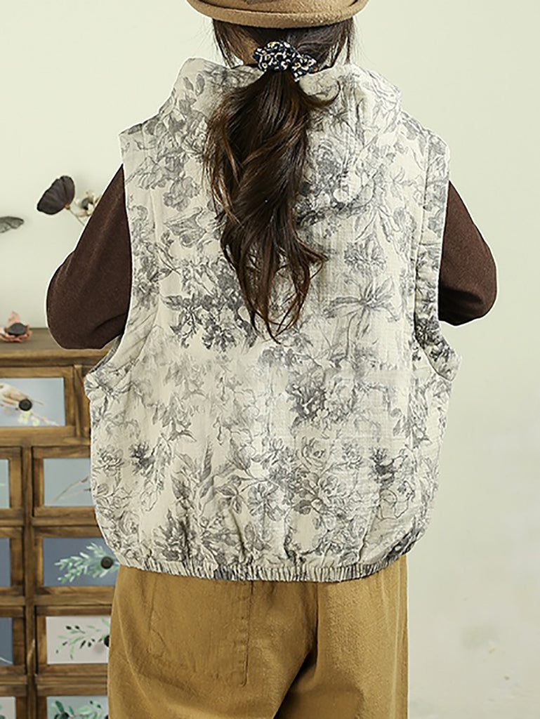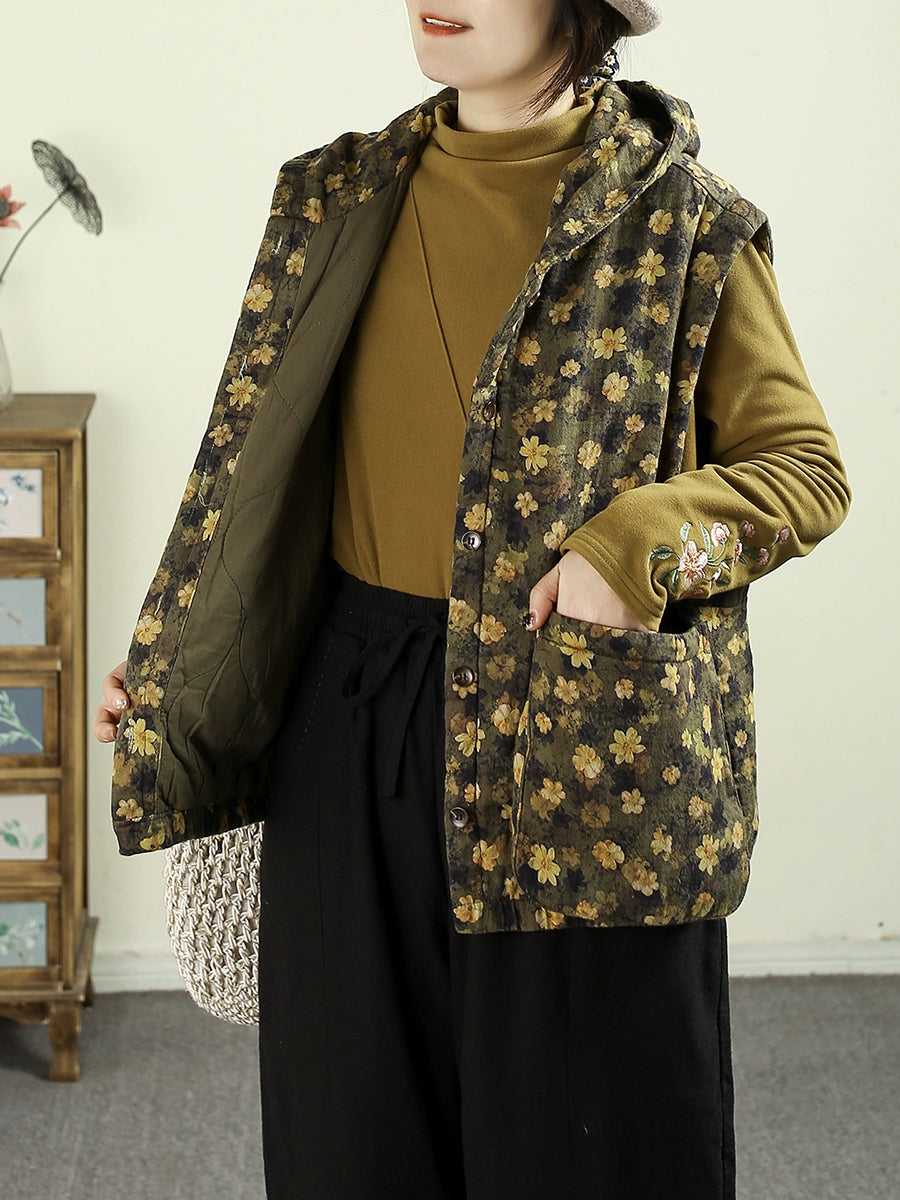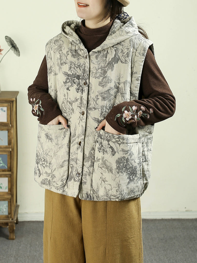 Colete acolchoado com capuz e estampa floral retrô para mulheres, estilo outono.