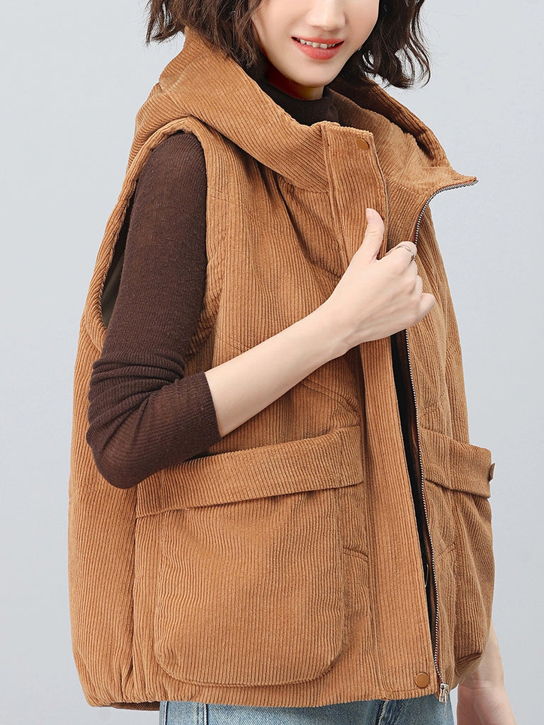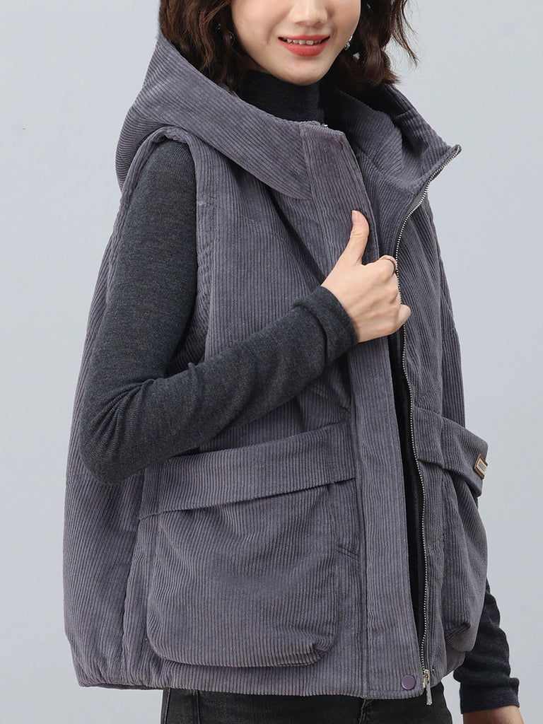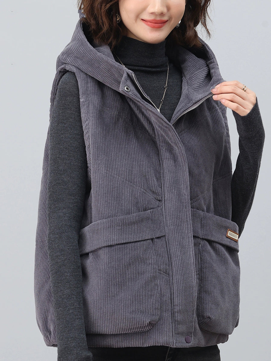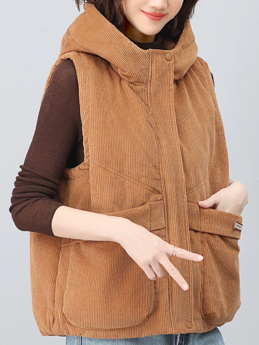 Colete feminino de veludo cotelê com capuz, estilo retrô outono, em cores lisas.