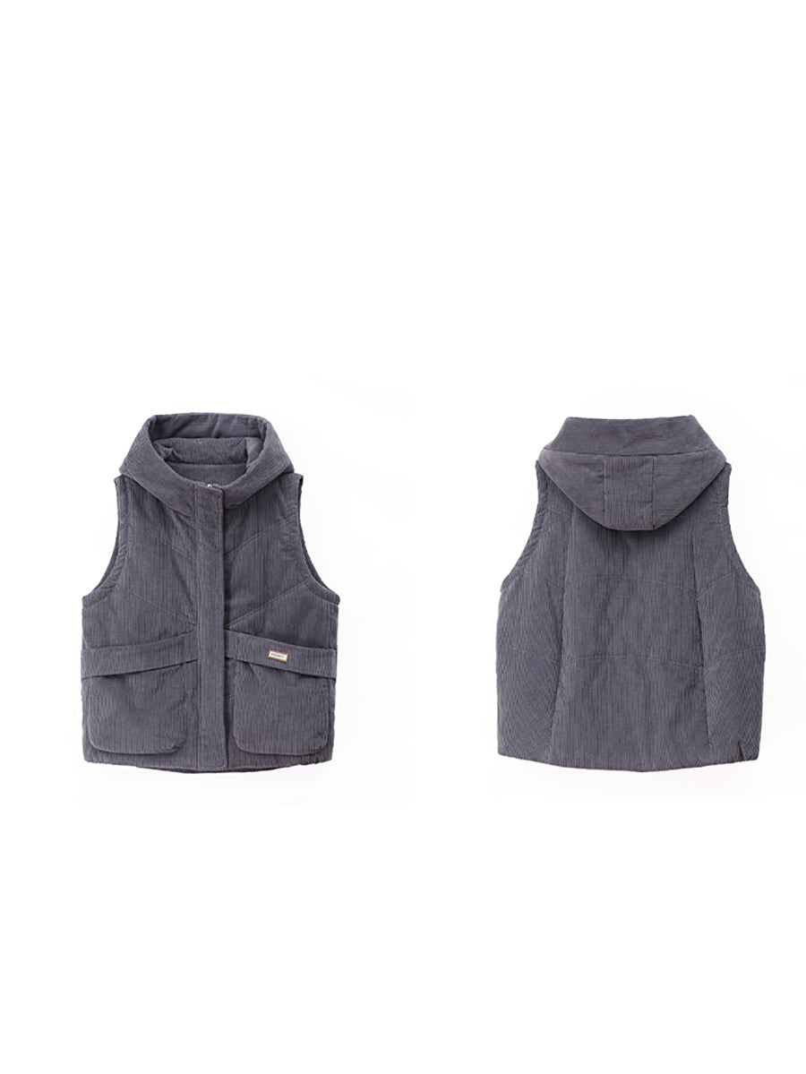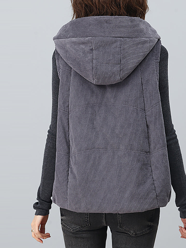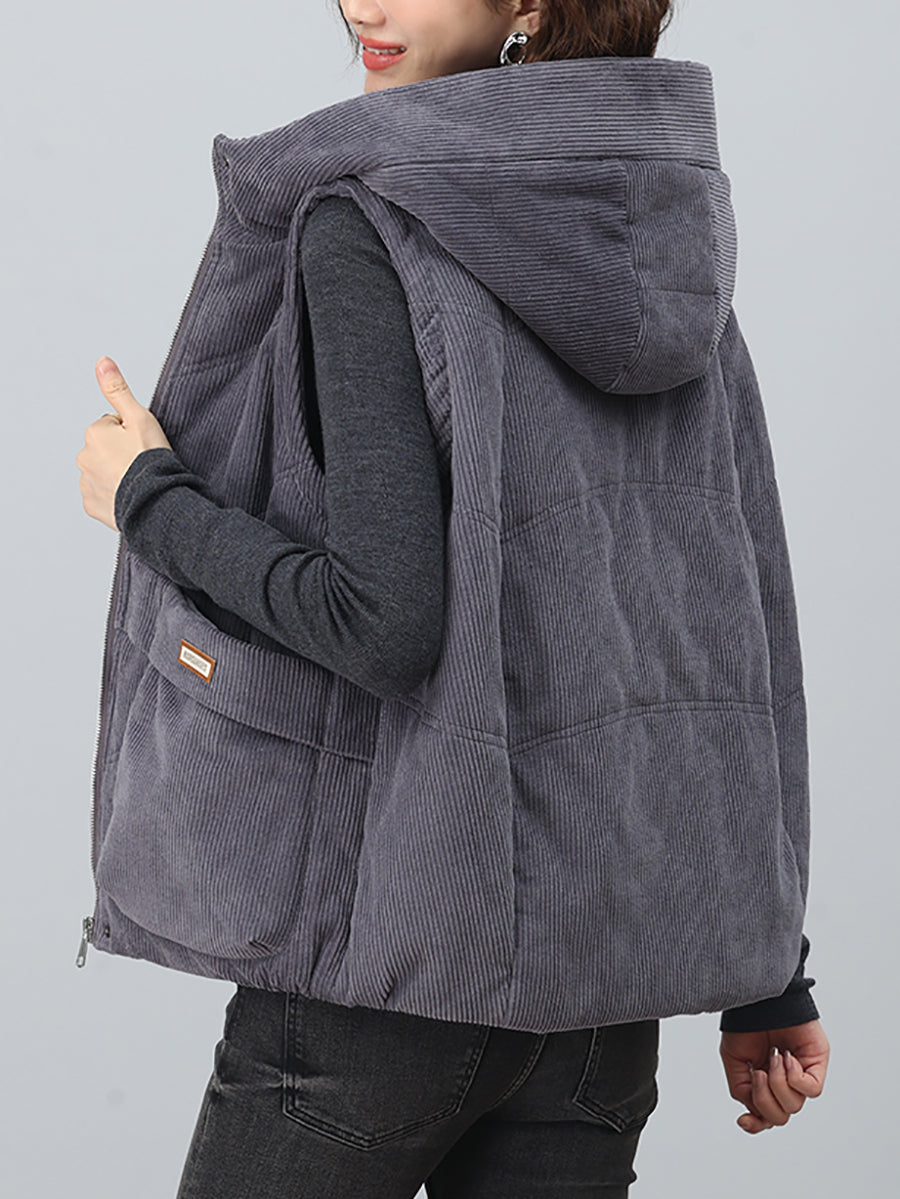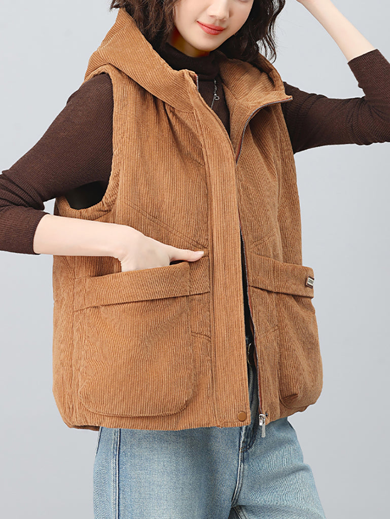 Colete feminino de veludo cotelê com capuz, estilo retrô outono, em cores lisas.