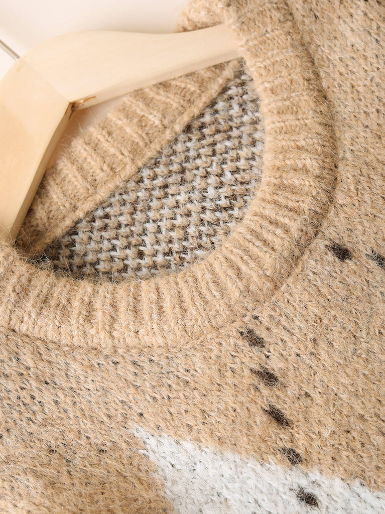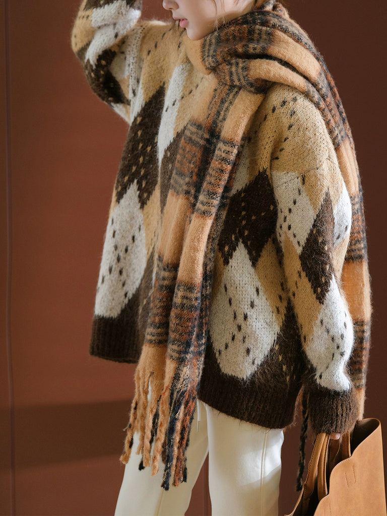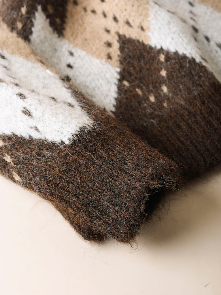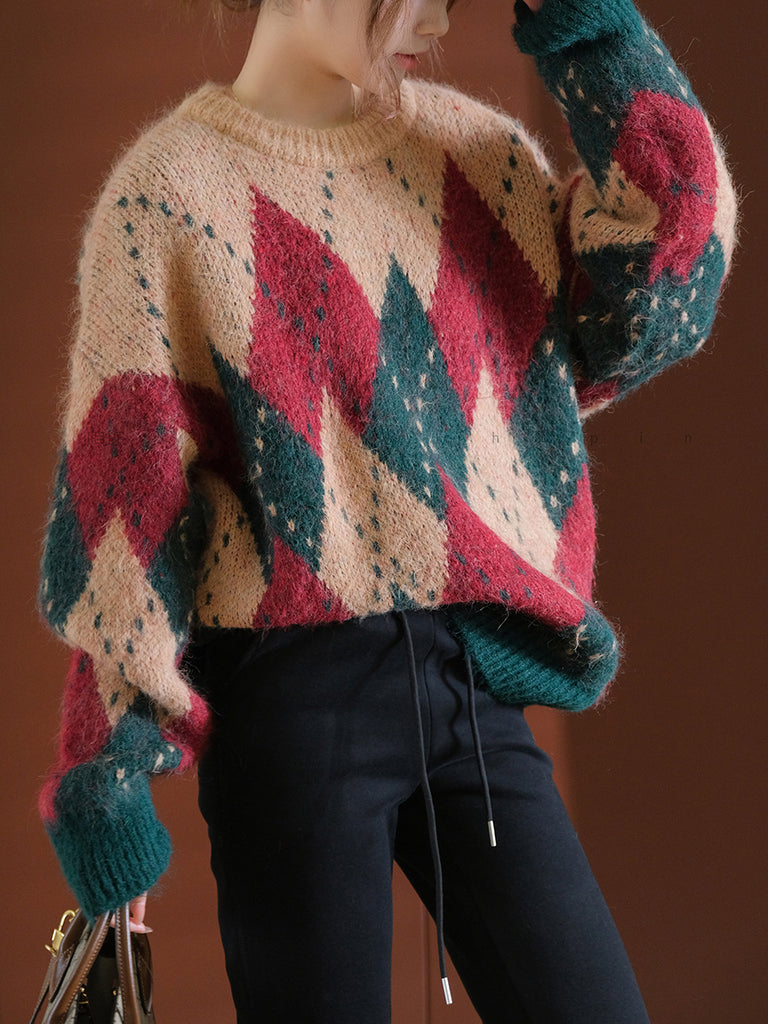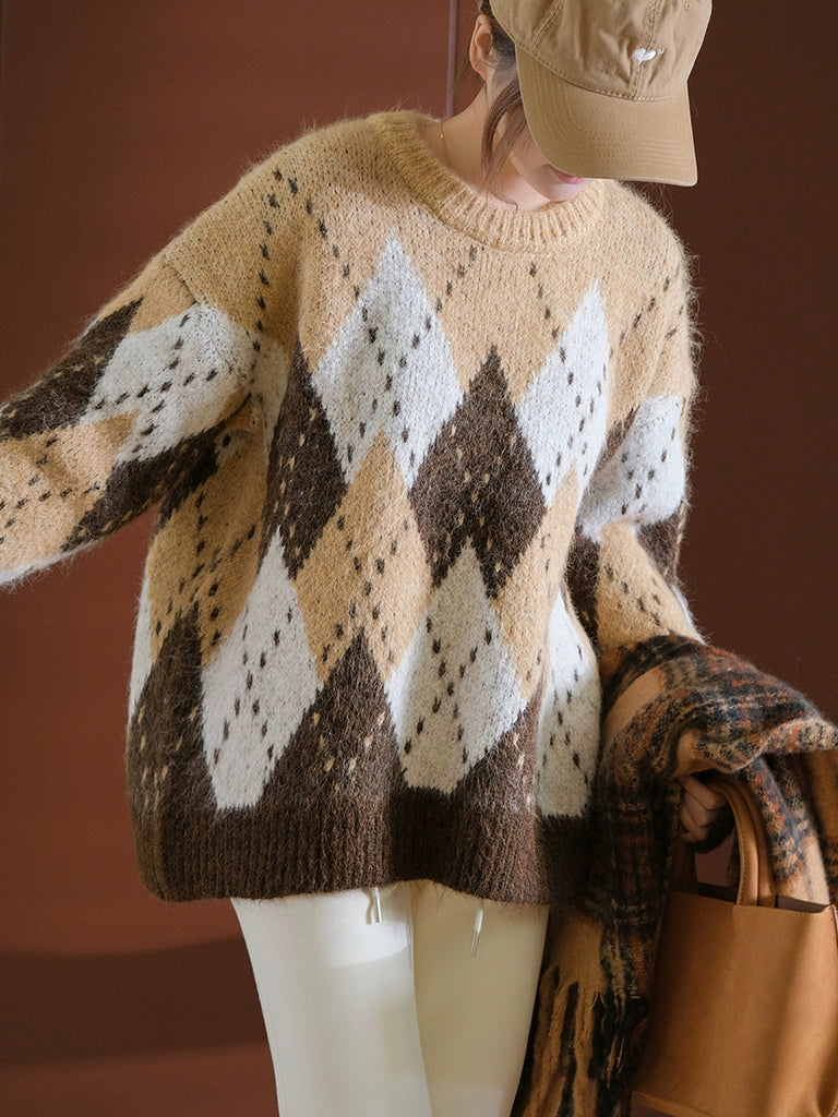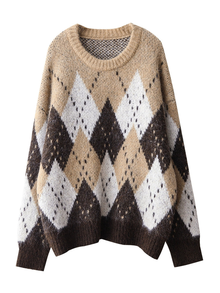 Suéter feminino de tricô com gola redonda e estampa retrô de losangos para o outono.