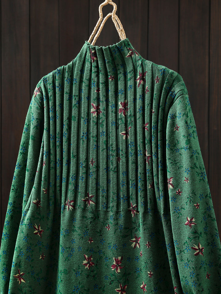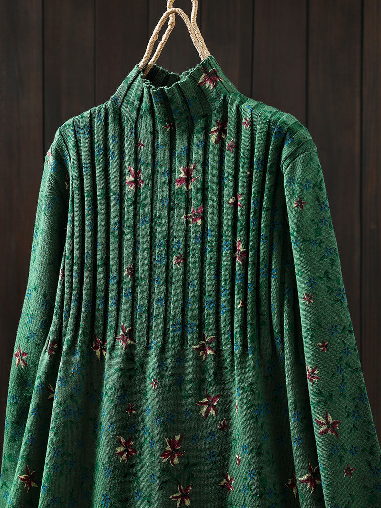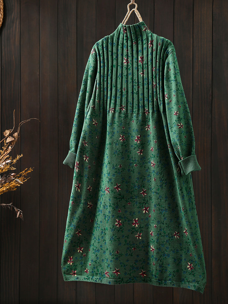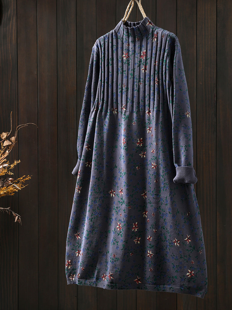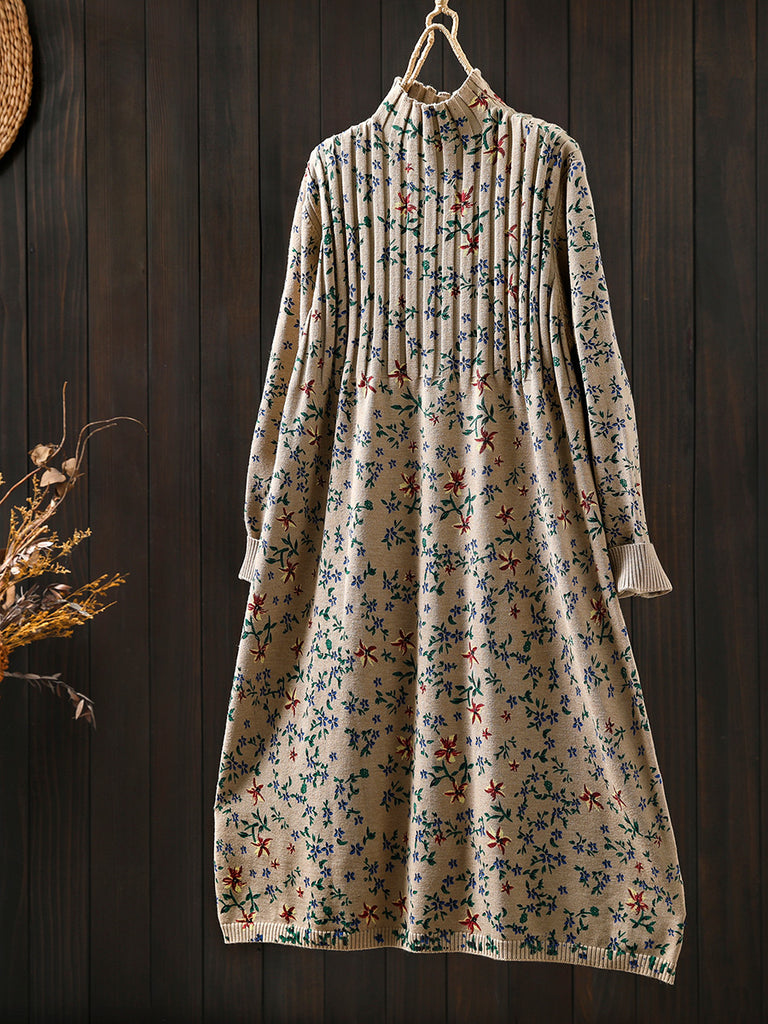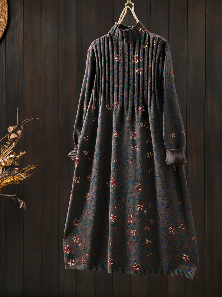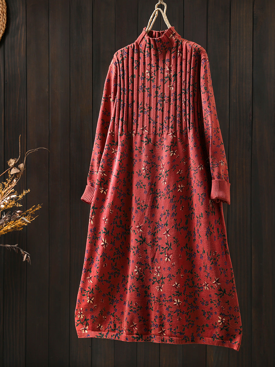 Vestido feminino de tricô com gola alta e estampa floral vintage para o outono