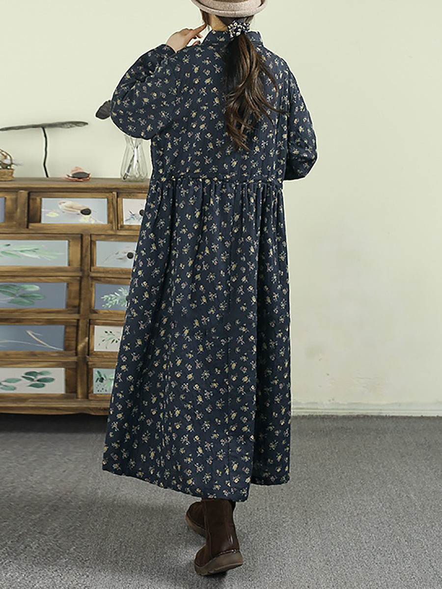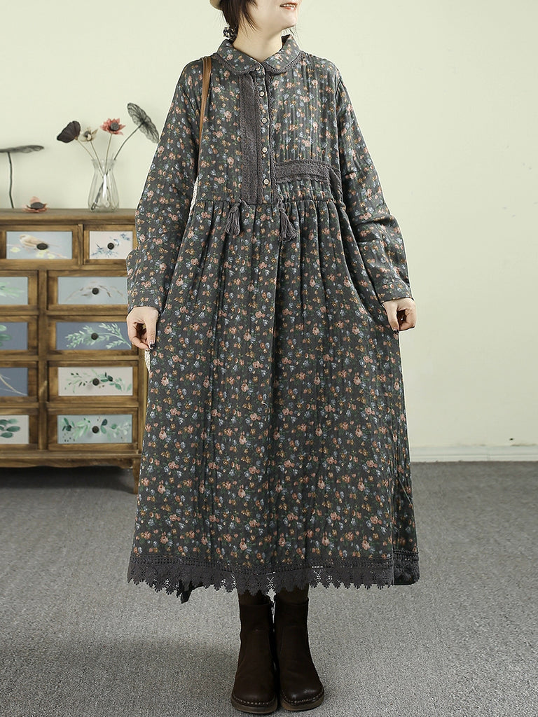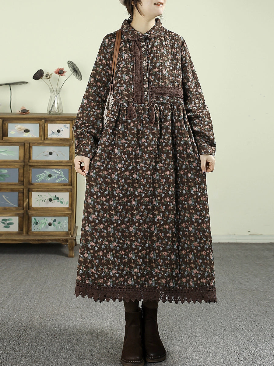 Vestido feminino vintage floral de outono com gola dobrável, 100% algodão.