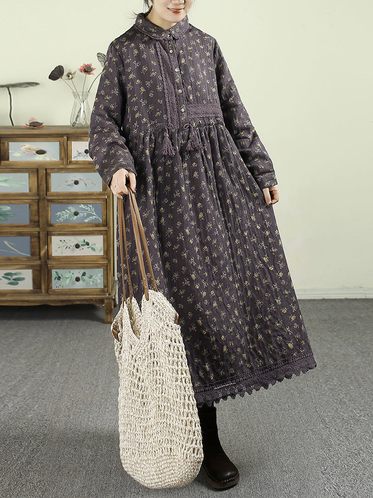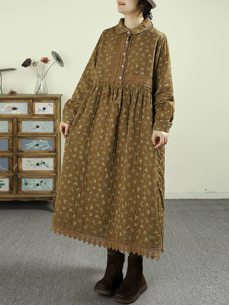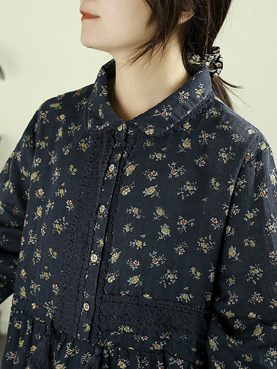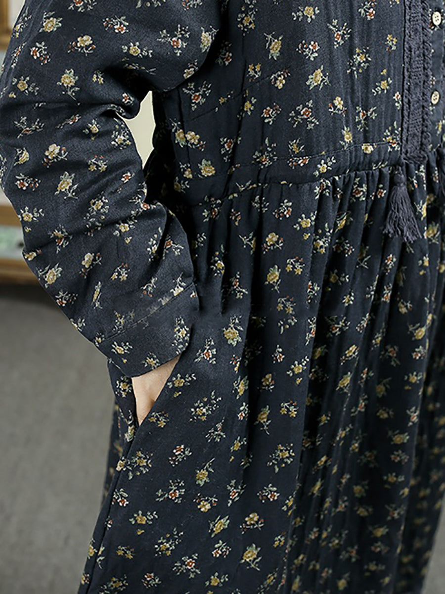 Vestido feminino vintage floral de outono com gola dobrável, 100% algodão.